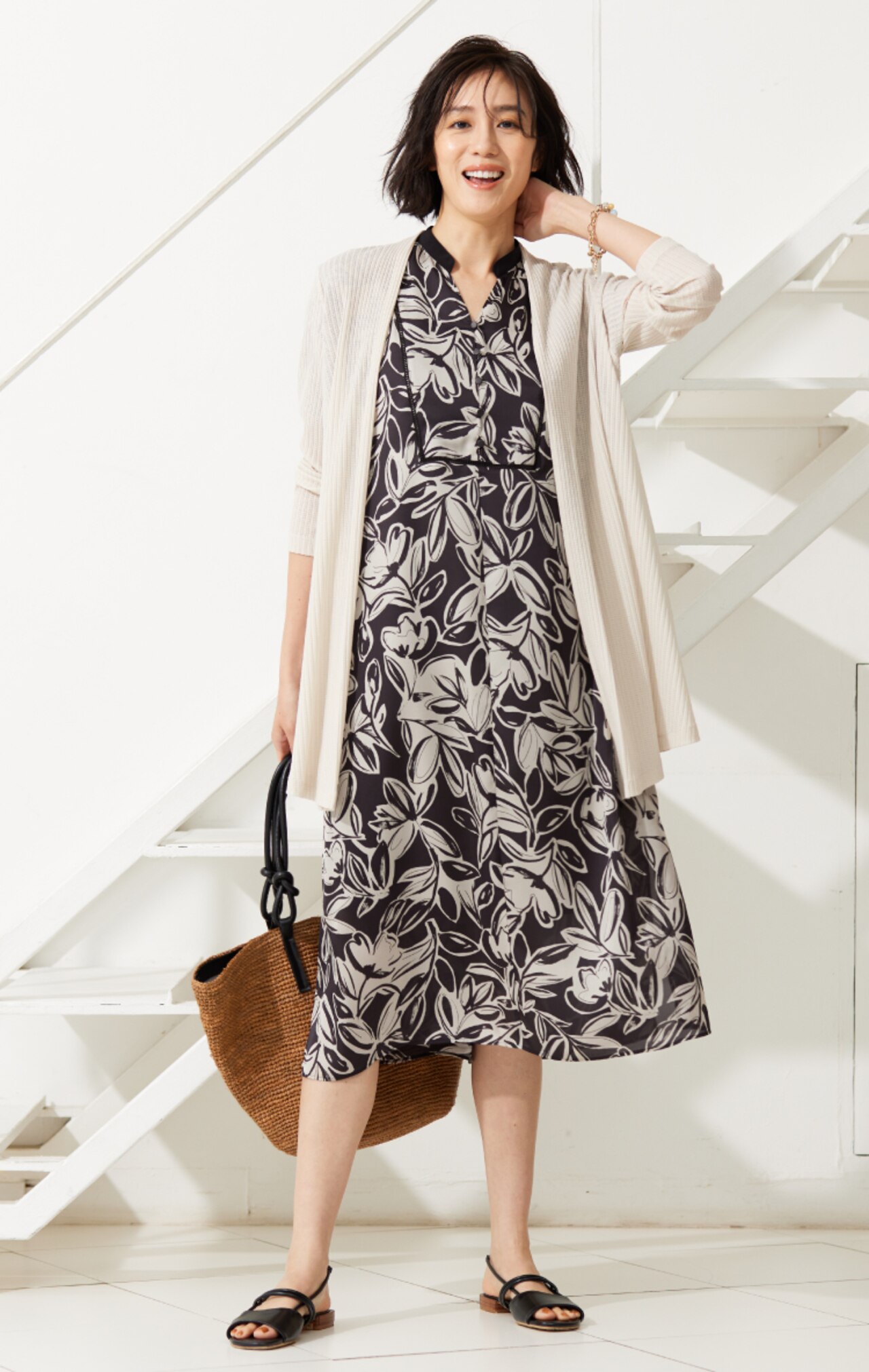 大柄モチーフのワンピースでリラックスムードを漂わせて
