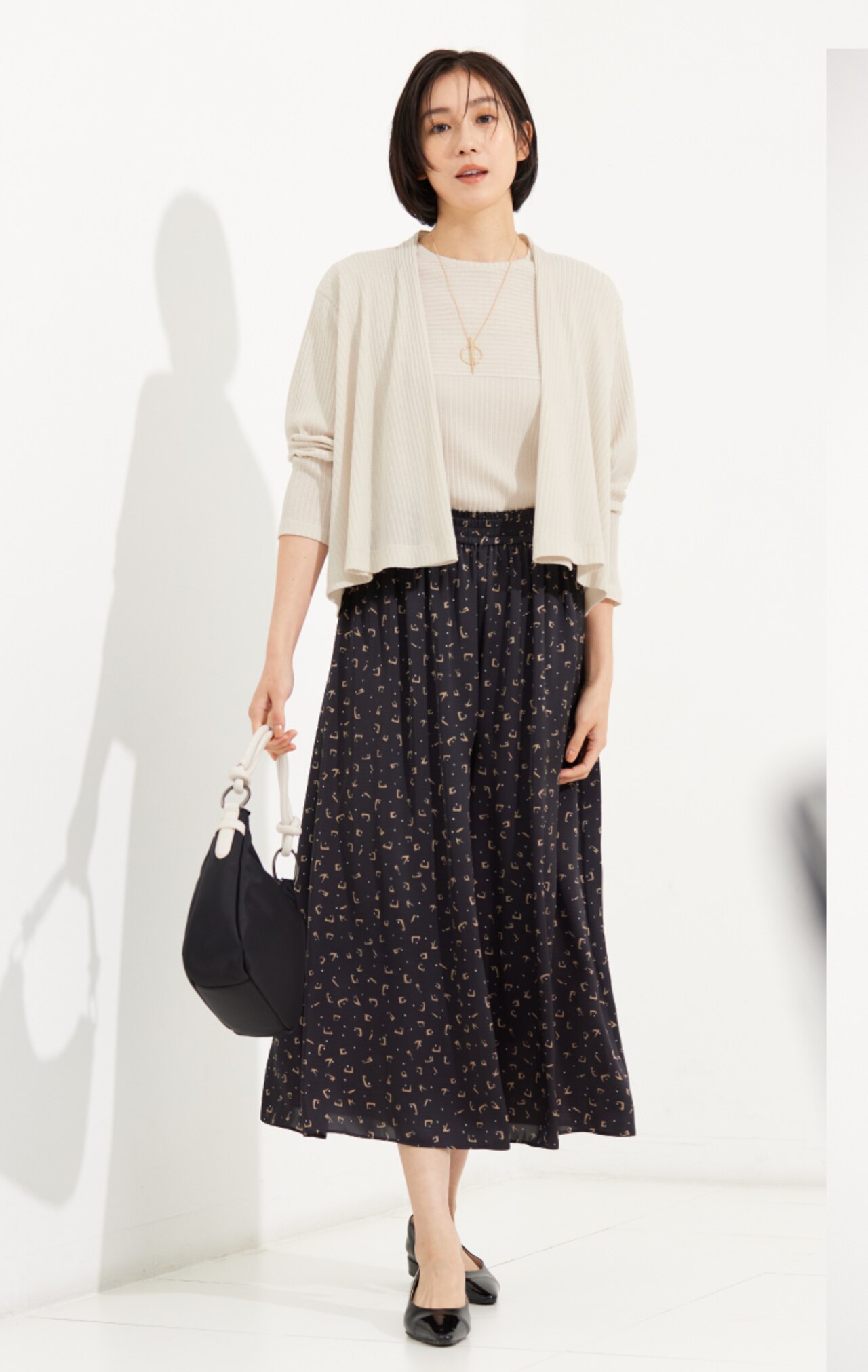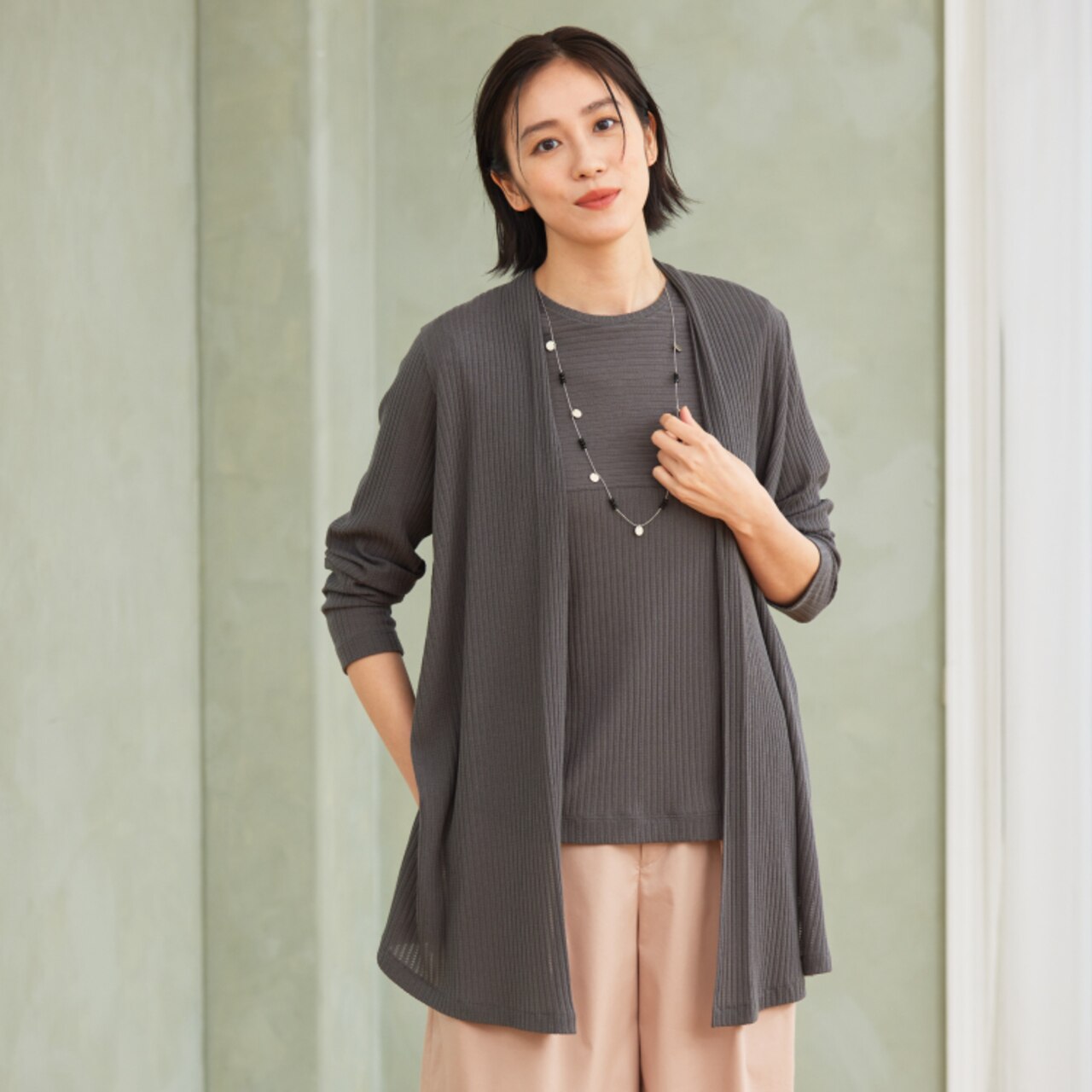 スカート見えの軽やかなギャザーパンツにショート丈のカーディガンをアンサンブル合わせで、上品な大人のレディを演出。