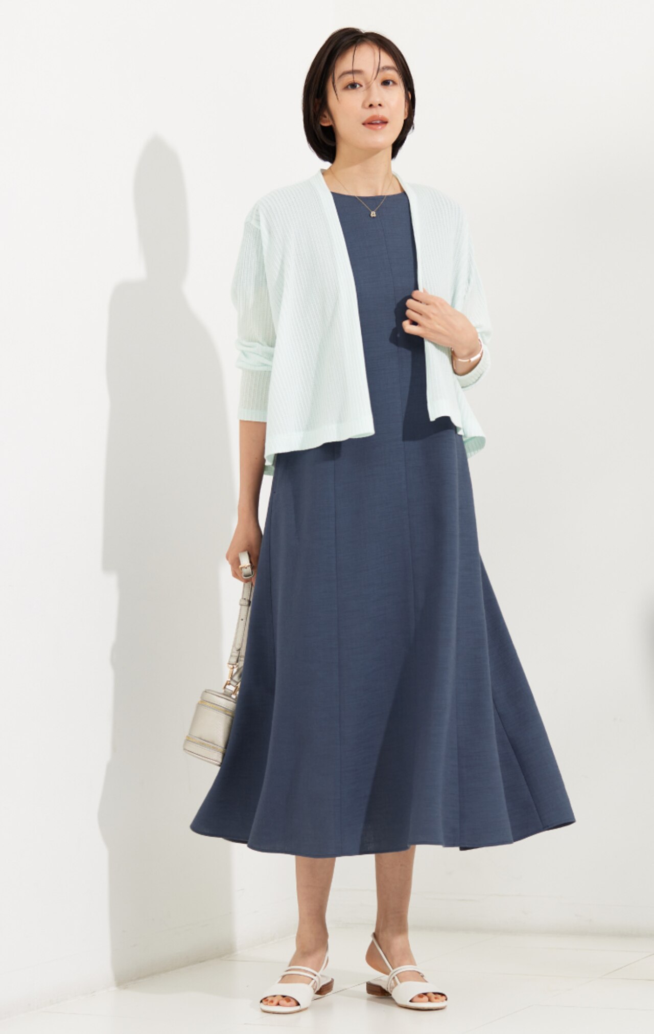 主役のダルブルーのワンピースには、同色系のカラーを合わせて爽やかにスッキリとまとめるのがオススメ。サンダルも白に合わせることで上品な抜け感が叶います。