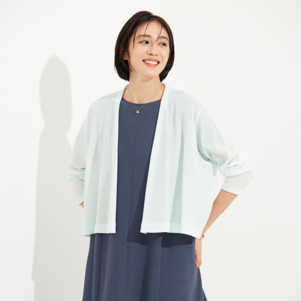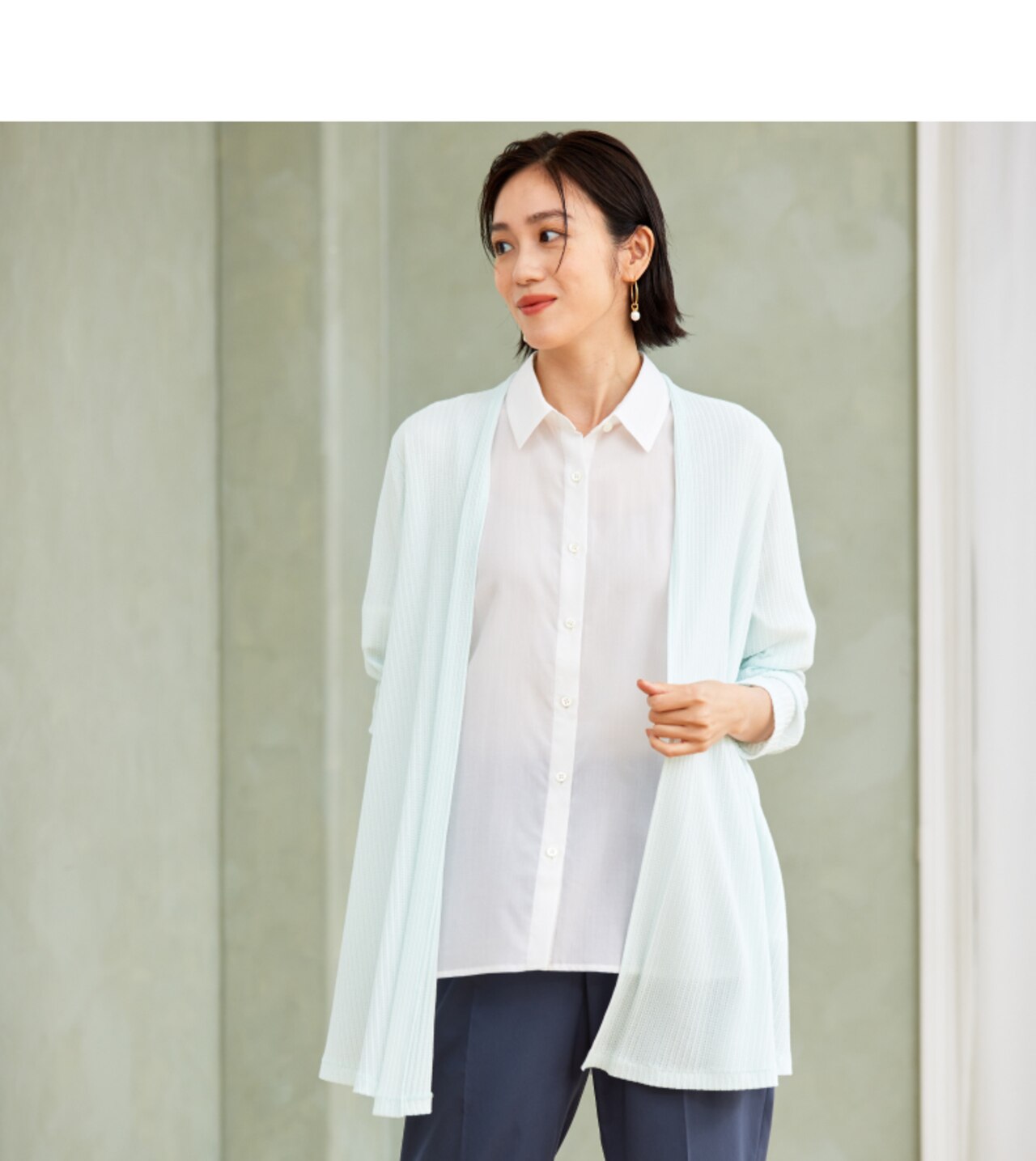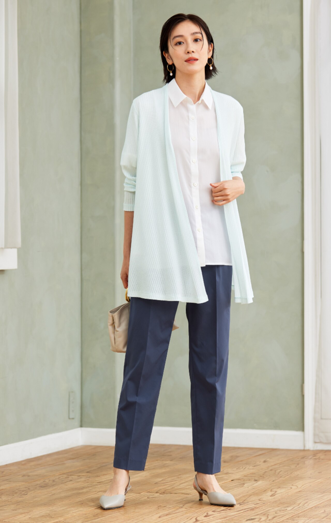 初夏のコーデに取り入れたい、爽やかなカラーの組み合わせ。ロングカーディガンでスタイルアップしつつ、透け感のあるブラウス合わせで清潔感ときちんと感を。