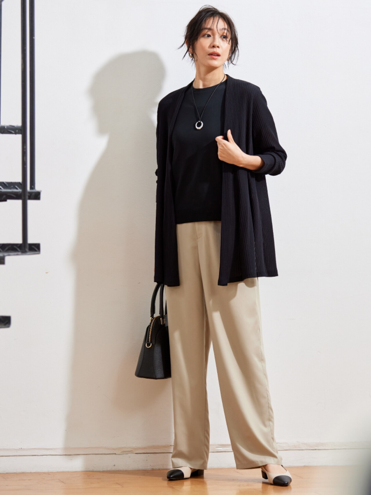 使いやすいモノトーンにベージュのロングカーディガンを合わせて、コーデを馴染ませて。