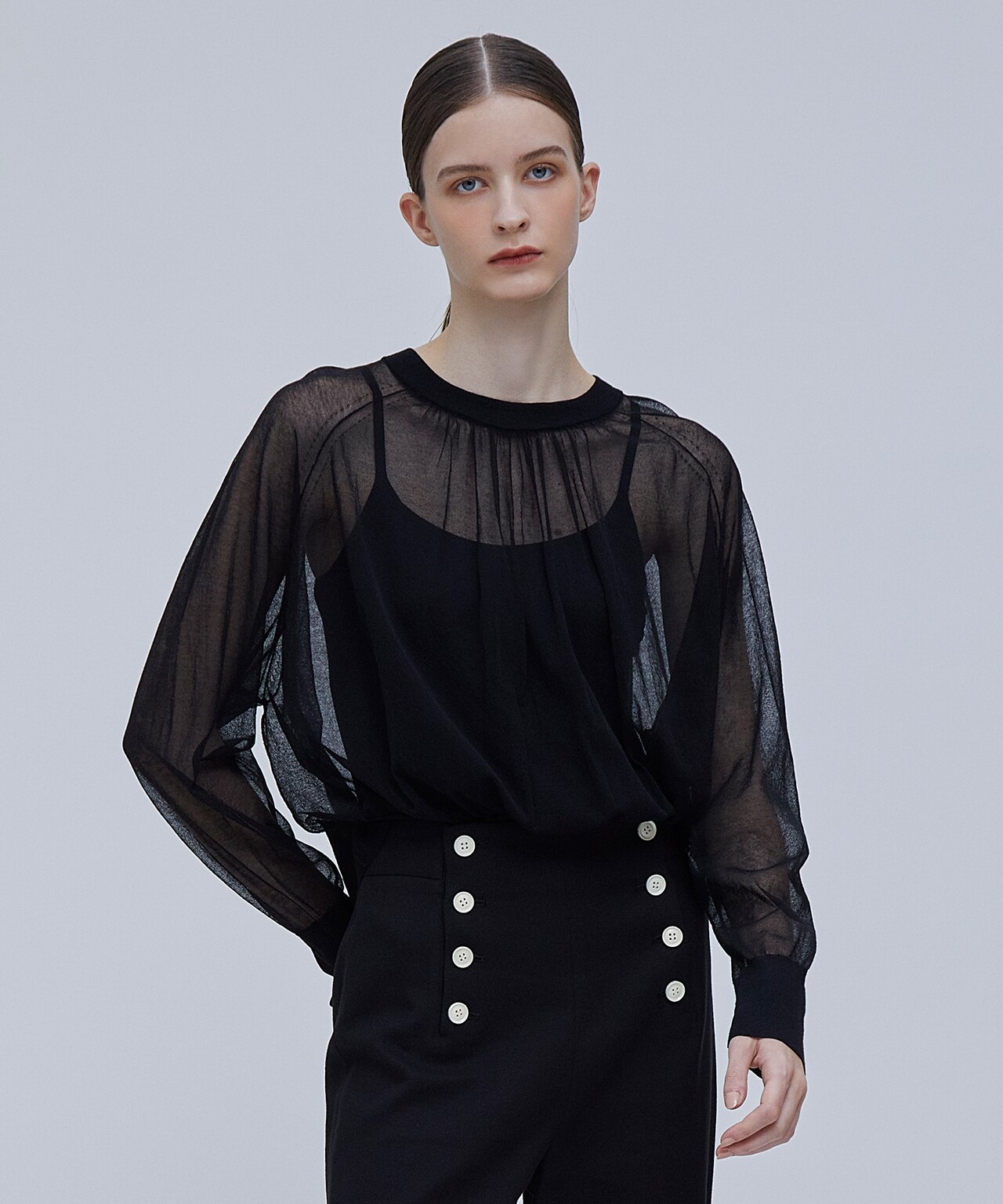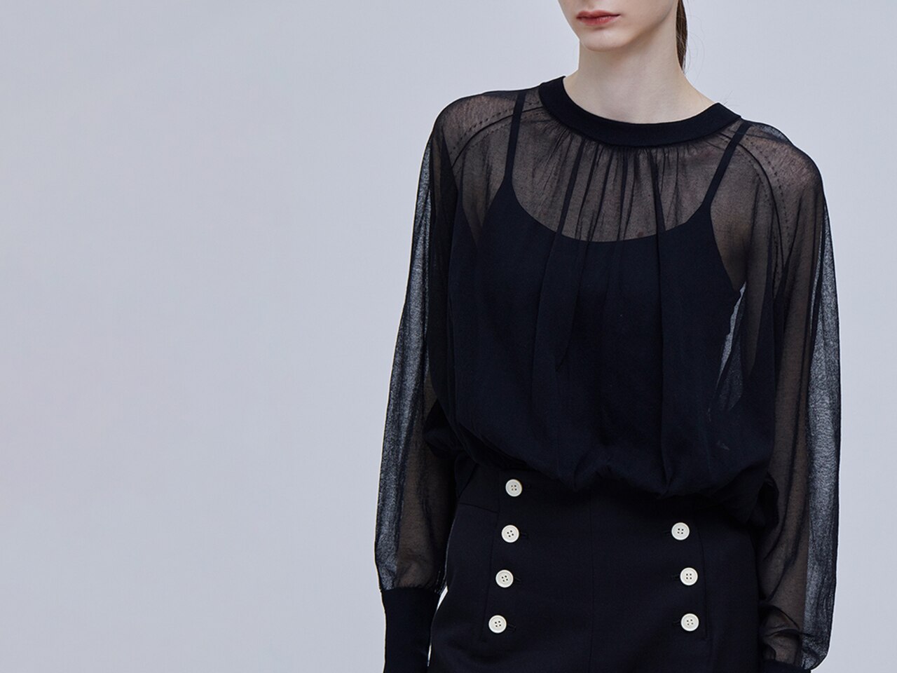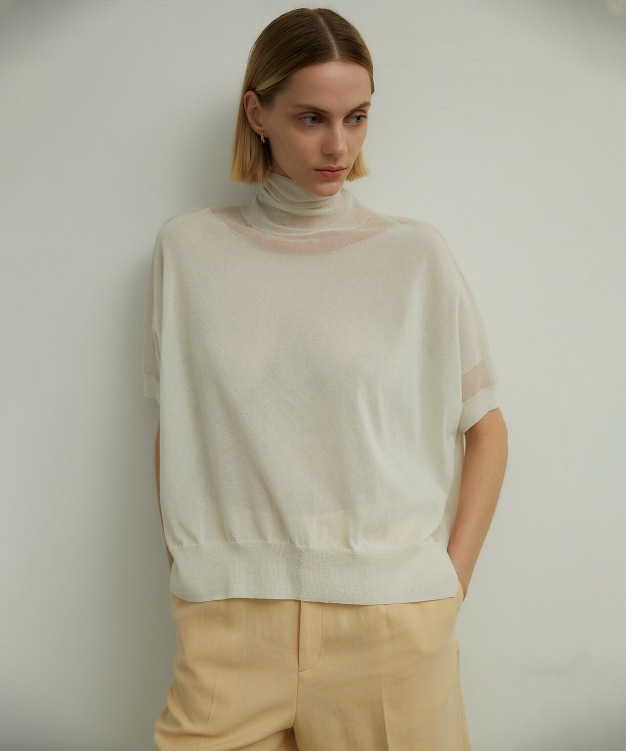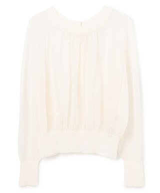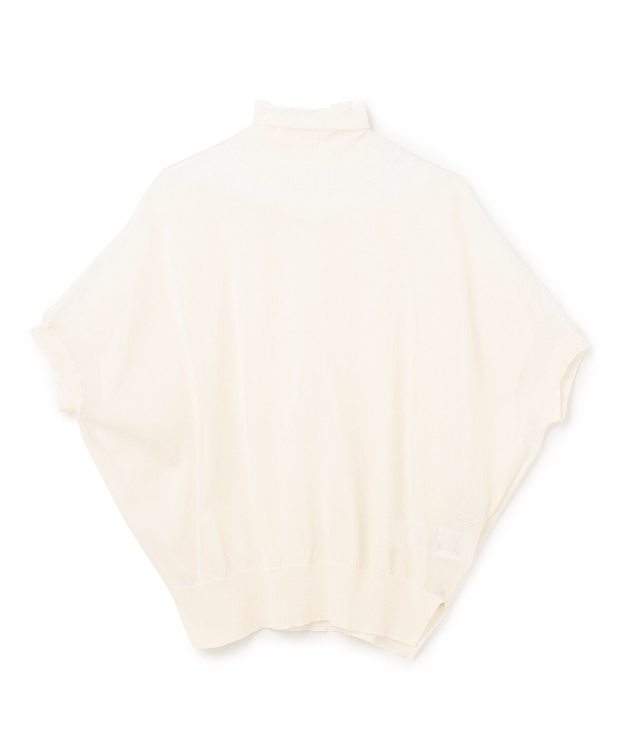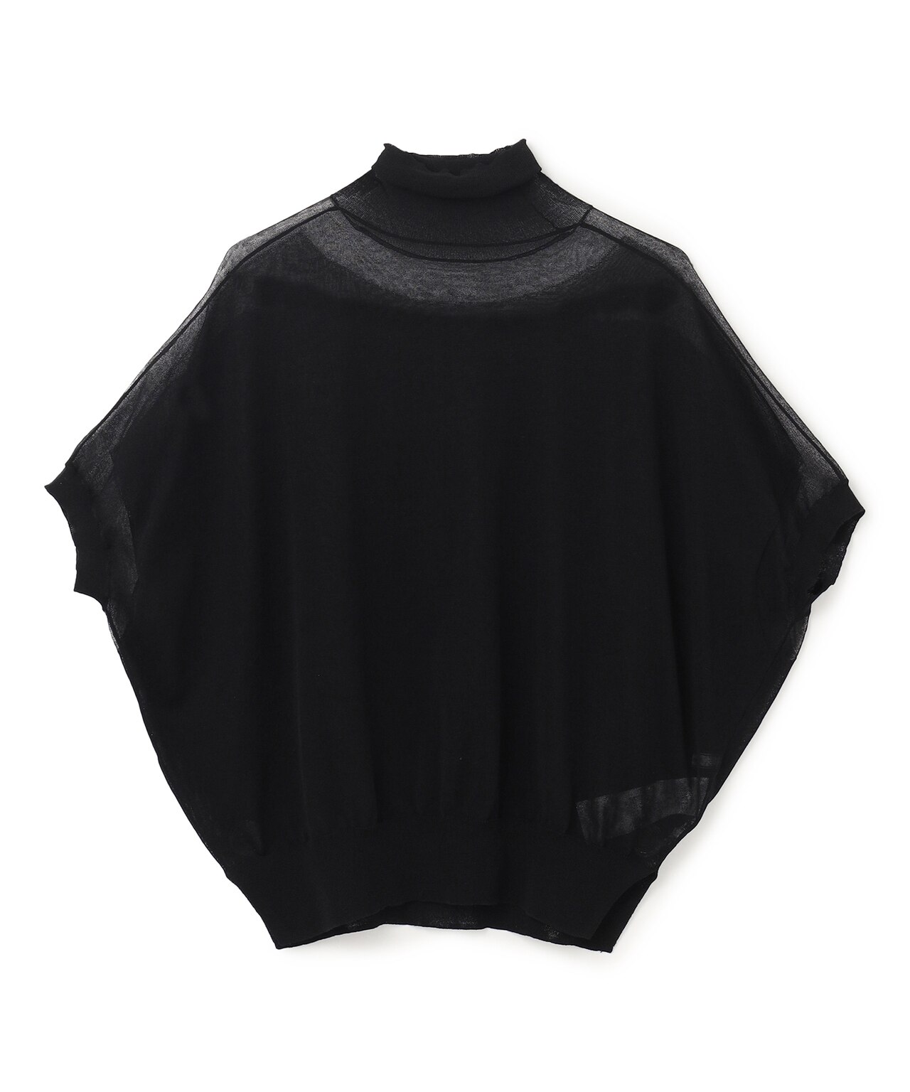 肩部分と襟ぐりのみを透けさせたハイネックニット。ビスチェを合わせて一枚で、ジャケットのインナーとして、柔らかな装いに。
