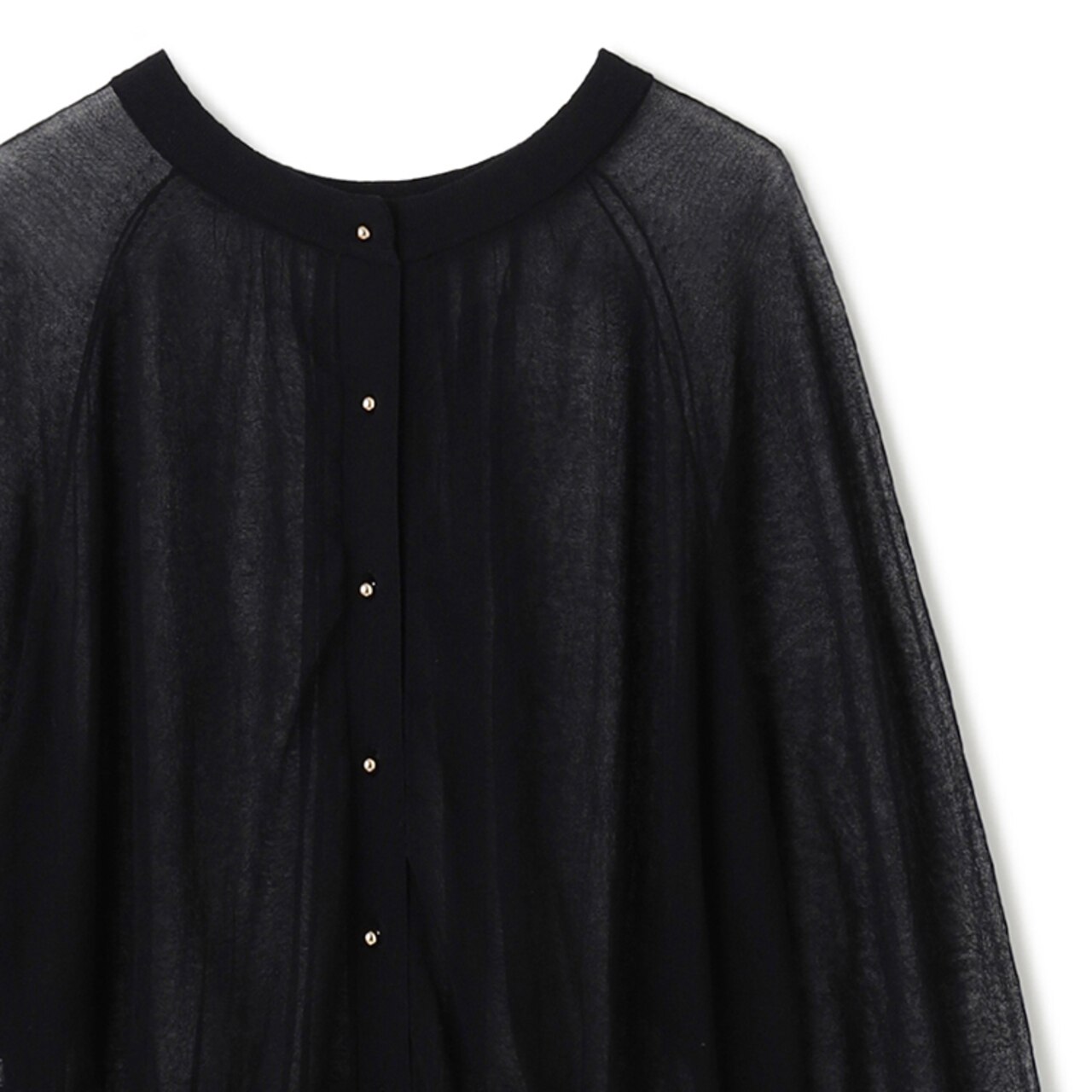 たっぷりなギャザーとゴールド釦がアクセントのカーディガン。透け感が女性らしく、これからの季節に一枚あると便利なアイテム。