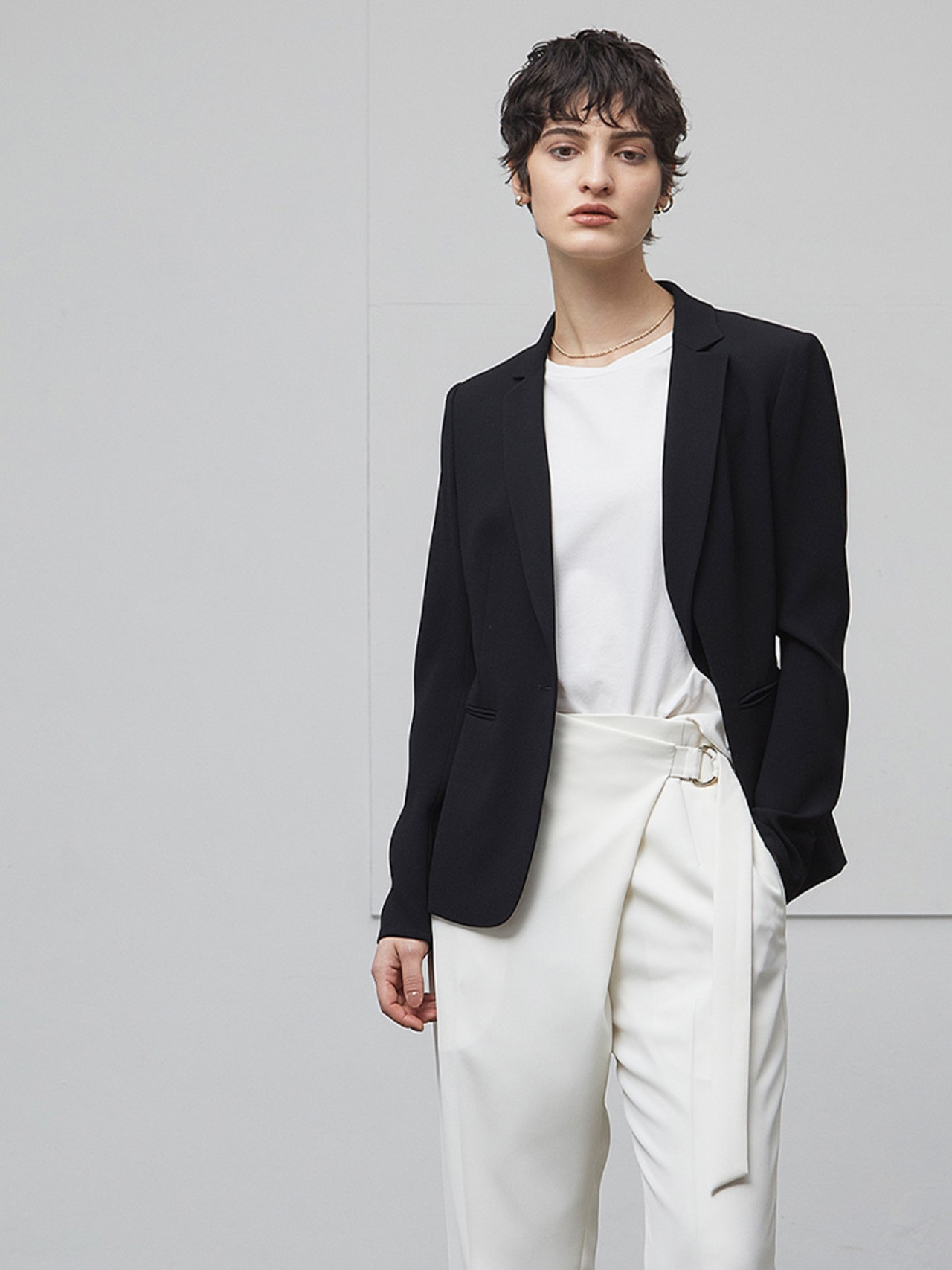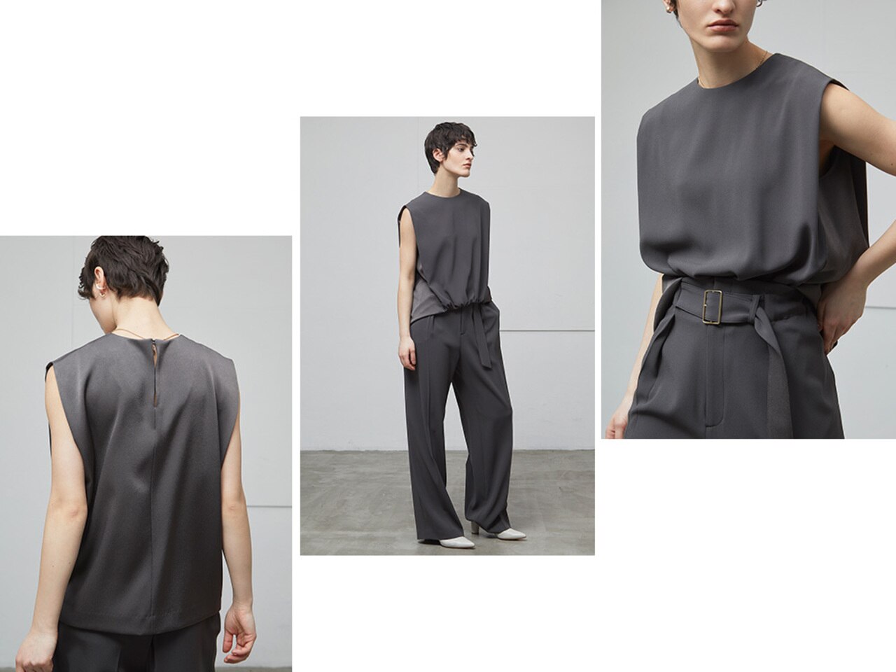 陰影のある表面感と落ち感のあるバックサテンジョーゼット。滑らかな質感がシーズンレスで使いやすい定番素材。