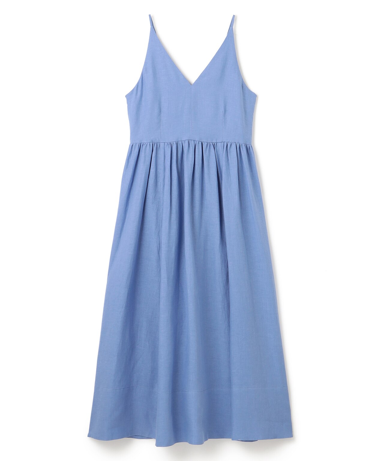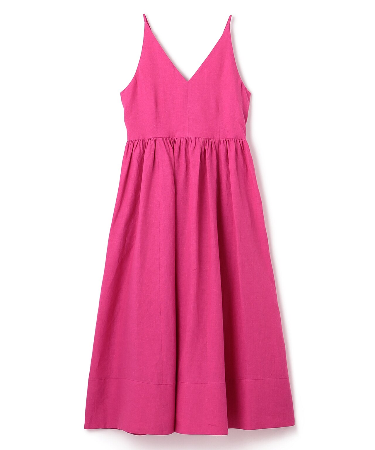 深めのVネックと後ろのドロストがポイントのデザイン。ボリュームのあるラインが美しく、夏の日差しに映えるカラーワンピース。