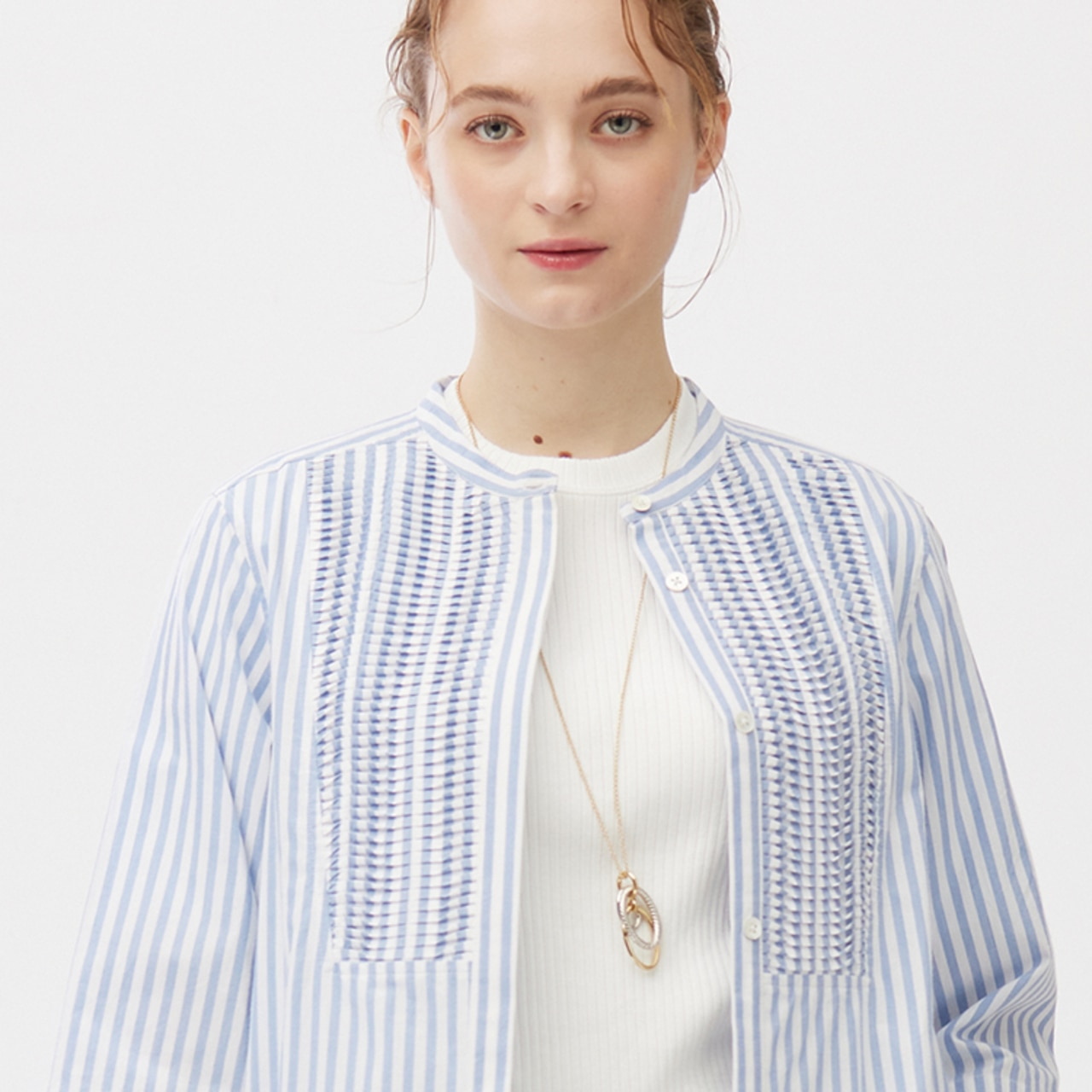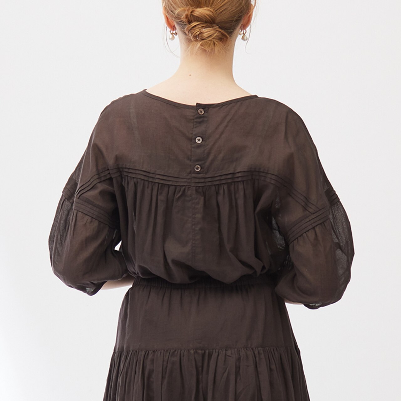 張り感のある綿を使用したシャツワンピース。胸元のヨークの切り替えに贅沢なピンタックディテールを施しポイントに。ゆったりとしたAラインシルエット、袖は肘が隠れるくらいの丈感で袖口まで広がるワイドスリーブ。汗ばむ時期も体にまとわりつかず、羽織りとしても重宝します。
