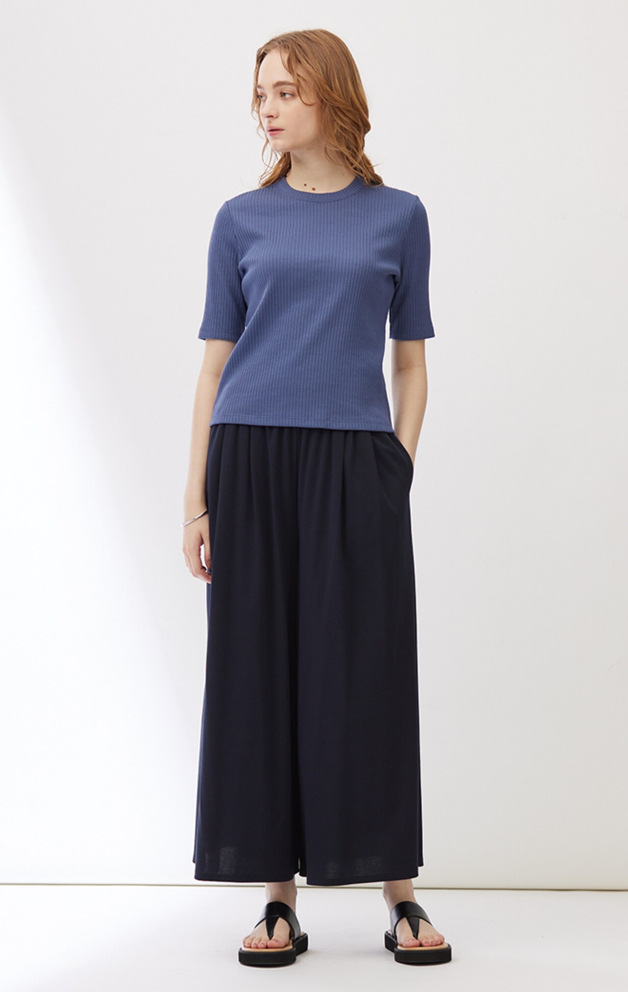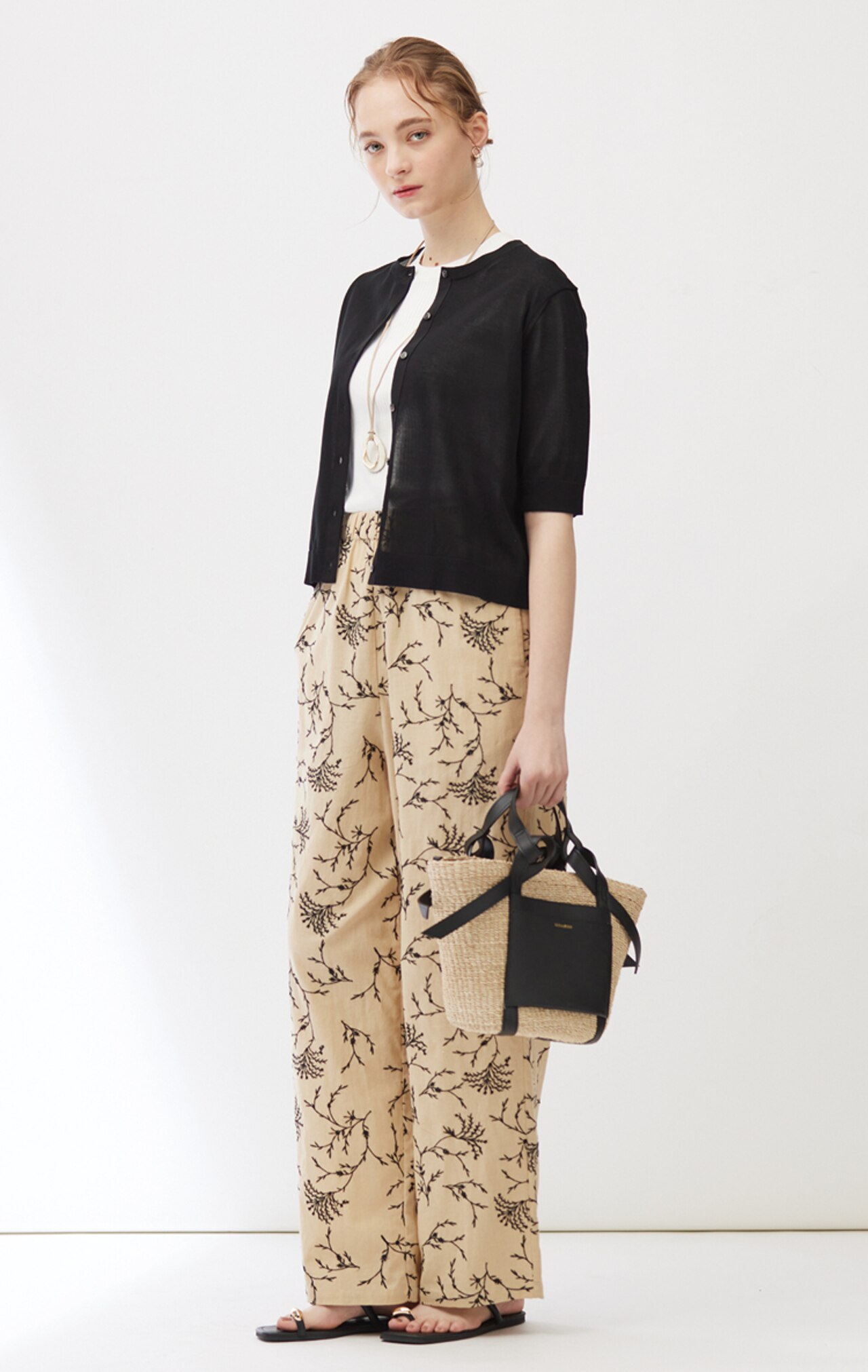 オリジナルの刺繍を施したTブラウス。ゆったりとしたシルエット、カジュアル過ぎないように張りのある素材感を活かし、肩先まで隠れる袖開きデザインに仕立てています。オリジナルの図案で書き起こした繊細な刺繍を、襟回りと袖口に配色で施しポイントに。コットンフレックス エンブロイダリーブラウスコットンフレックス エンブロイダリーブラウス¥20,900(税込)ツイストスムースジャージー ワイドパンツツイストスムースジャージー ワイドパンツ¥18,920(税込)Other Item:イヤリング ブレスレット バッグ