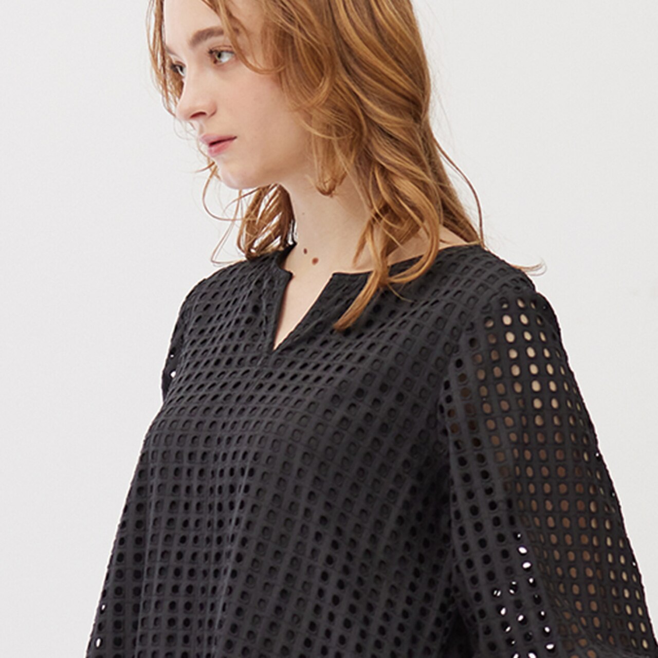 幾何学柄アイレットレースを贅沢に使用した五分袖ワンピース。見た目にも涼やかで美しいレースの透け感やアイレットの軽やかさを楽しんでいただけるデザインです。甘くなりすぎない幾何学柄レースで、オンオフ取り入れやすく仕上げています。