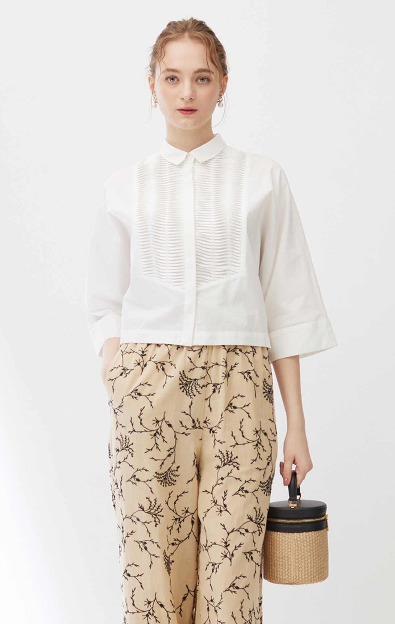 張り感のある綿を使用したブラウス。背面のみティアードデザインにすることで、腰周りを拾わないゆとりのあるシルエットに仕上げています。8分丈の袖にはピンタックを施し、袖先にゆるやかなボリュームを出しています。羽織りとしても着用いただけます。コットンポプリン タックディテール チュニックブラウスコットンポプリン タックディテール チュニックブラウス¥23,100(税込)Other Item:カットソー パンツ イヤリング バッグ
