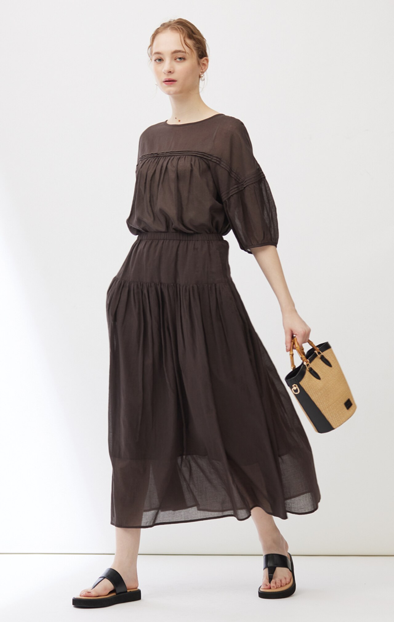 天然素材を活かしたデザインブラウスとスカート。ブラウスは胸元の切り替えから、スカートは高めの位置の切り替えからギャザーにより、生まれる軽やかでゆったりと揺れるシルエットが魅力です。ワンピースのように組み合わせるコーディネートがお勧めです。
