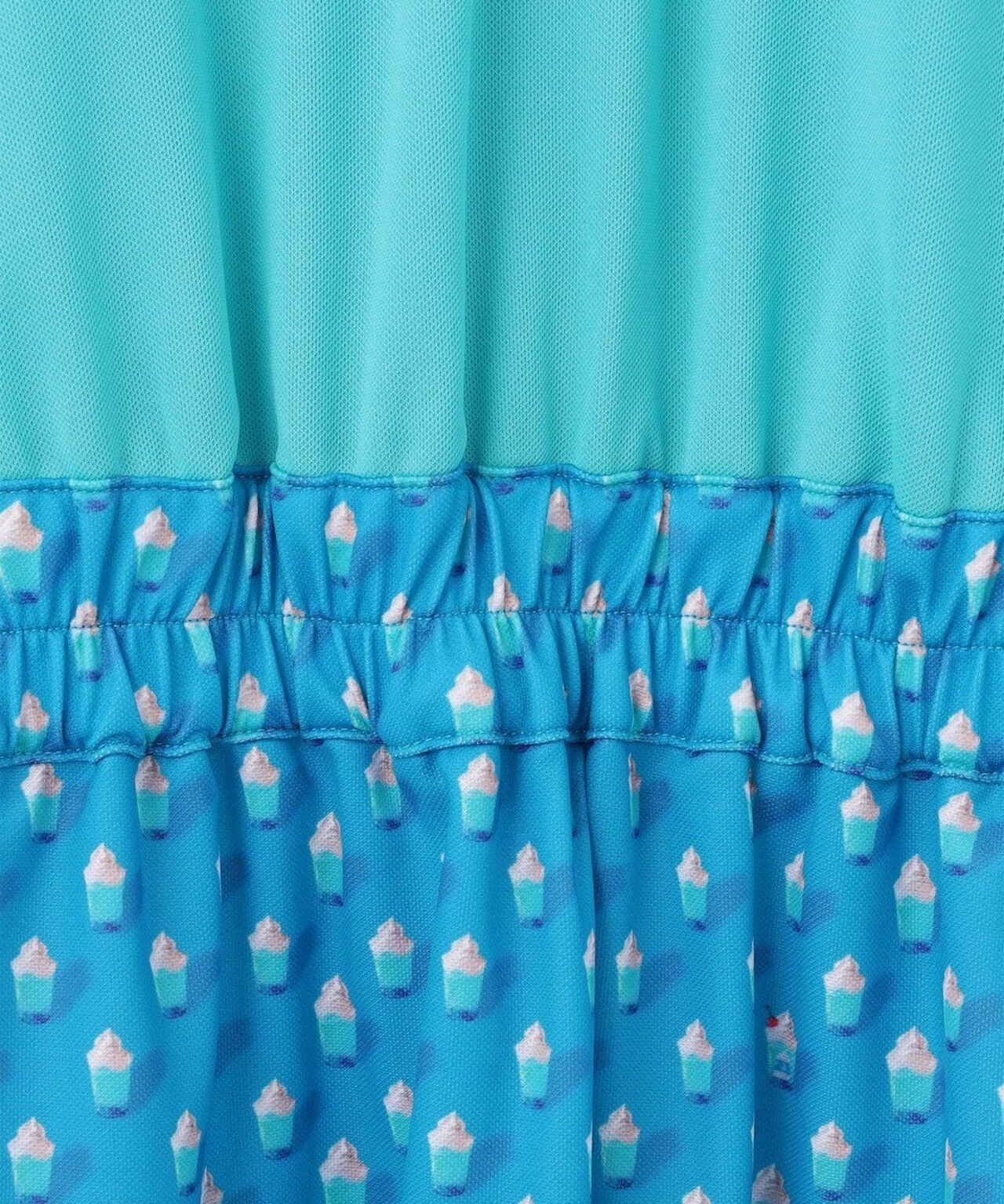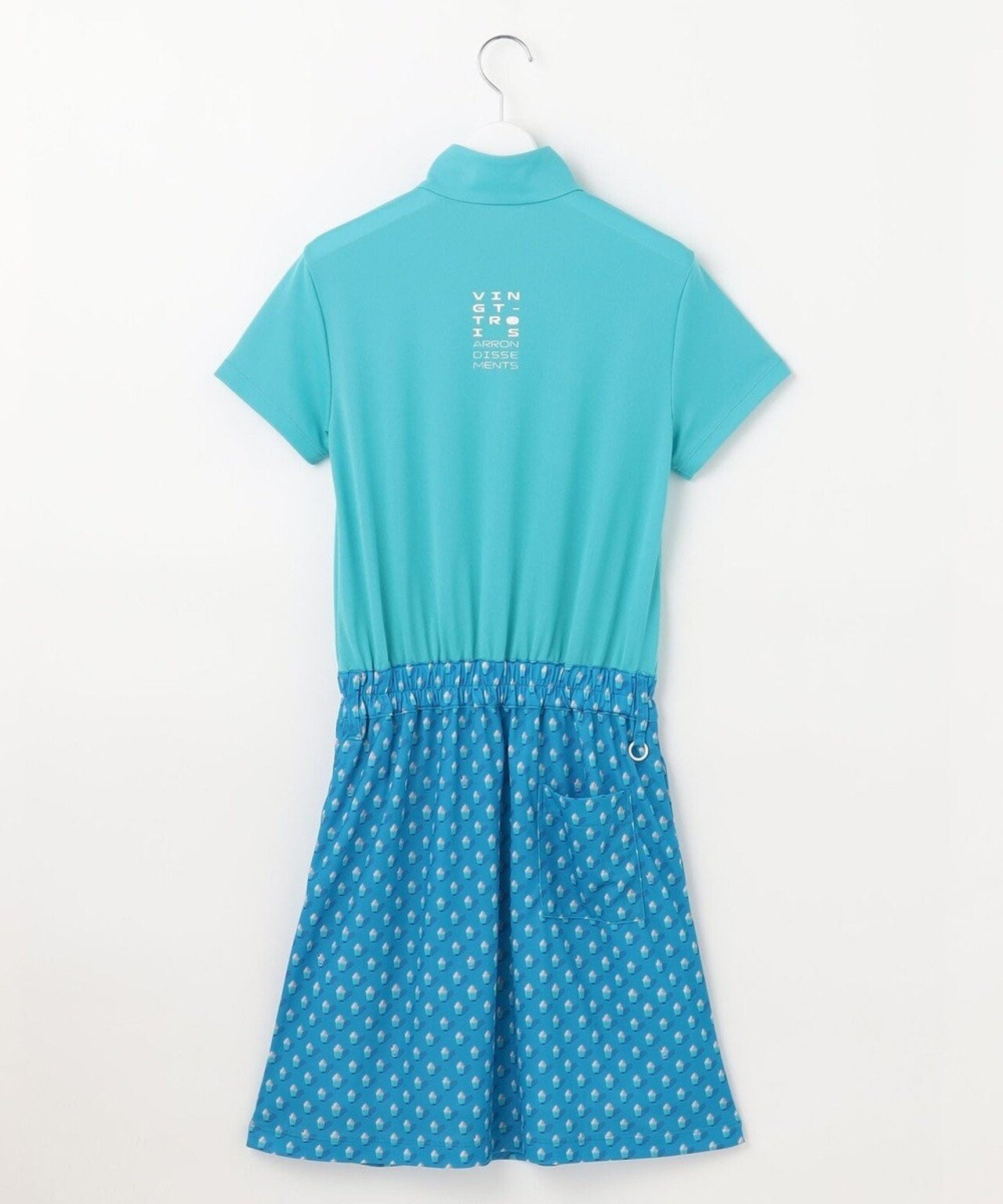毎年大人気で完売必至のアイテム、袖レースモックネックシャツを、お客様からの声を元にワンピースにしちゃいました!控えめでシンプルなデザインながらも袖部分のレースが上品で華やか。レッスンからランチまで、シーンを選ばずデイリーウェアとしても活躍♪後ろポケットや丸カン付きで、コースでも実用的に着用可能◎【HYGRA】アイス柄 切替ワンピース