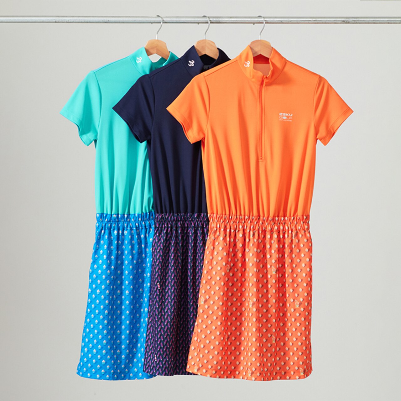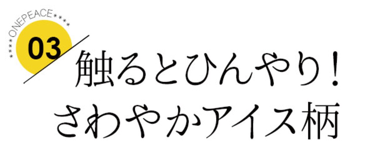 腕を通した時にひんやり感のある、吸放湿繊維の【HYGRA】素材を使用した、無地×アイス柄の切り替えワンピース。左胸と首元に入ったシルバー箔のロゴで、ポップながらもオトナの遊び心を感じさせる1着に仕上がっています♪マンゴ―かき氷(ライトオレンジ)・グレープアイス(ネイビー)・クリームソーダ柄(サックスブルー)と、『COOL』をテーマにした3色展開です。【吸水速乾/UVケア】モックネック ワンピース