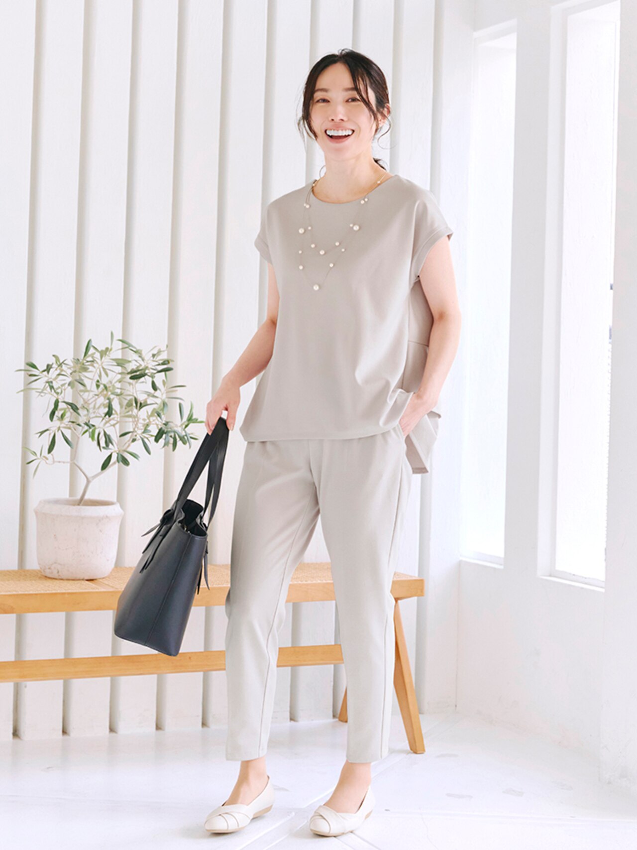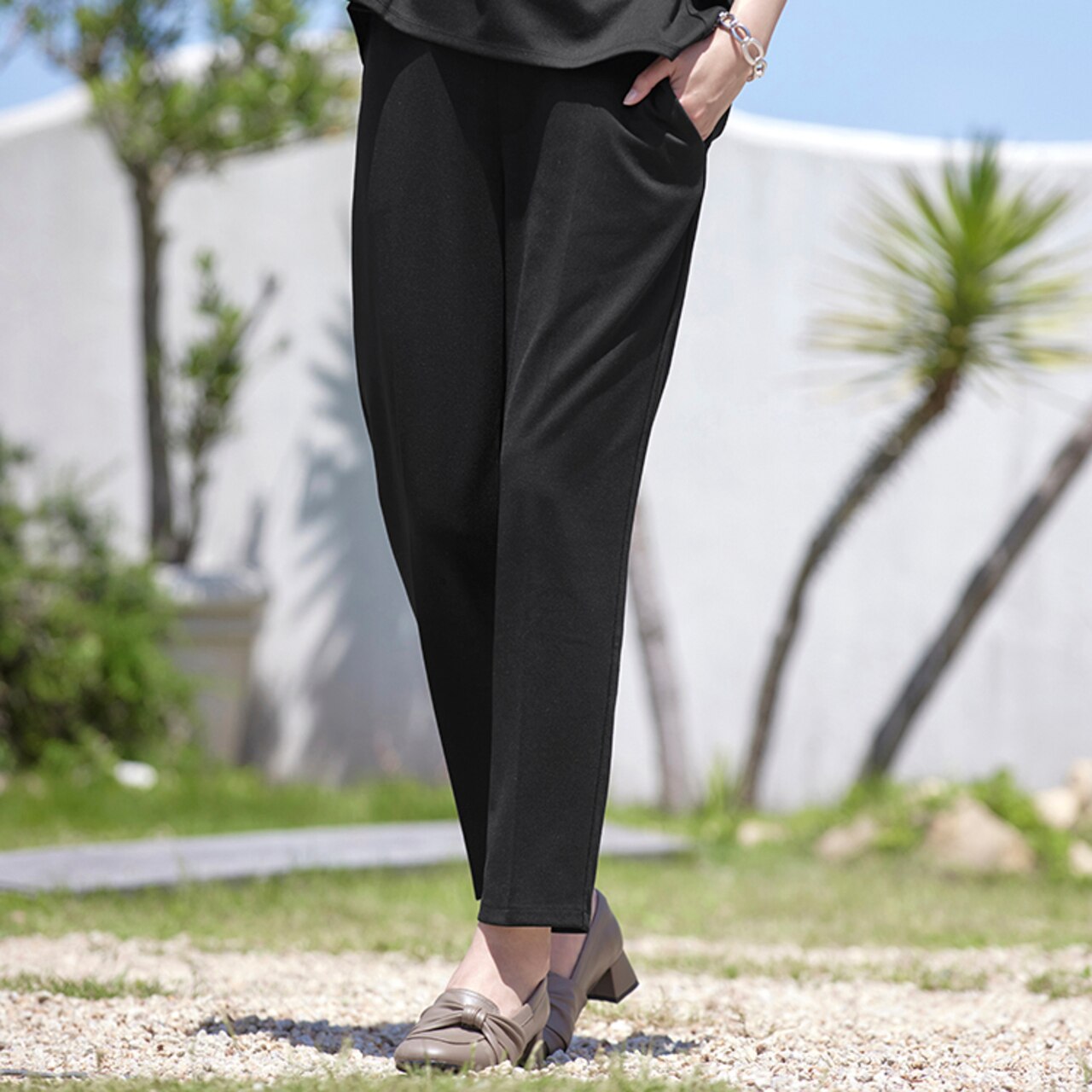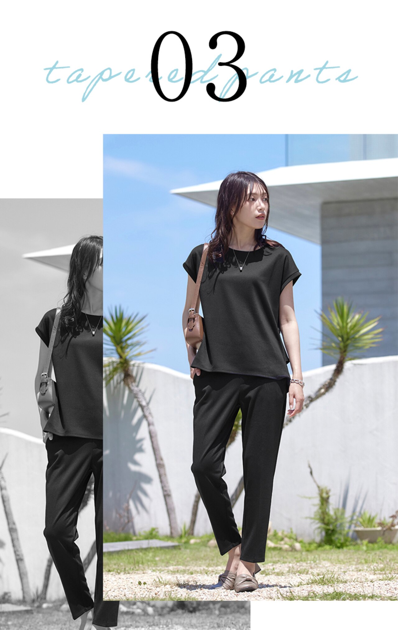脚を「きれい」に見せてくれるシルエットが魅力のテーパードパンツは、履き心地も注目ポイント。まるでスウェットパンツを履いているかのような感覚でありながら、それでも上品に見えるのは、「きれい見え」にこだわってつけたセンタープレスのおかげ。オン・オフ使える快適パンツをぜひ。