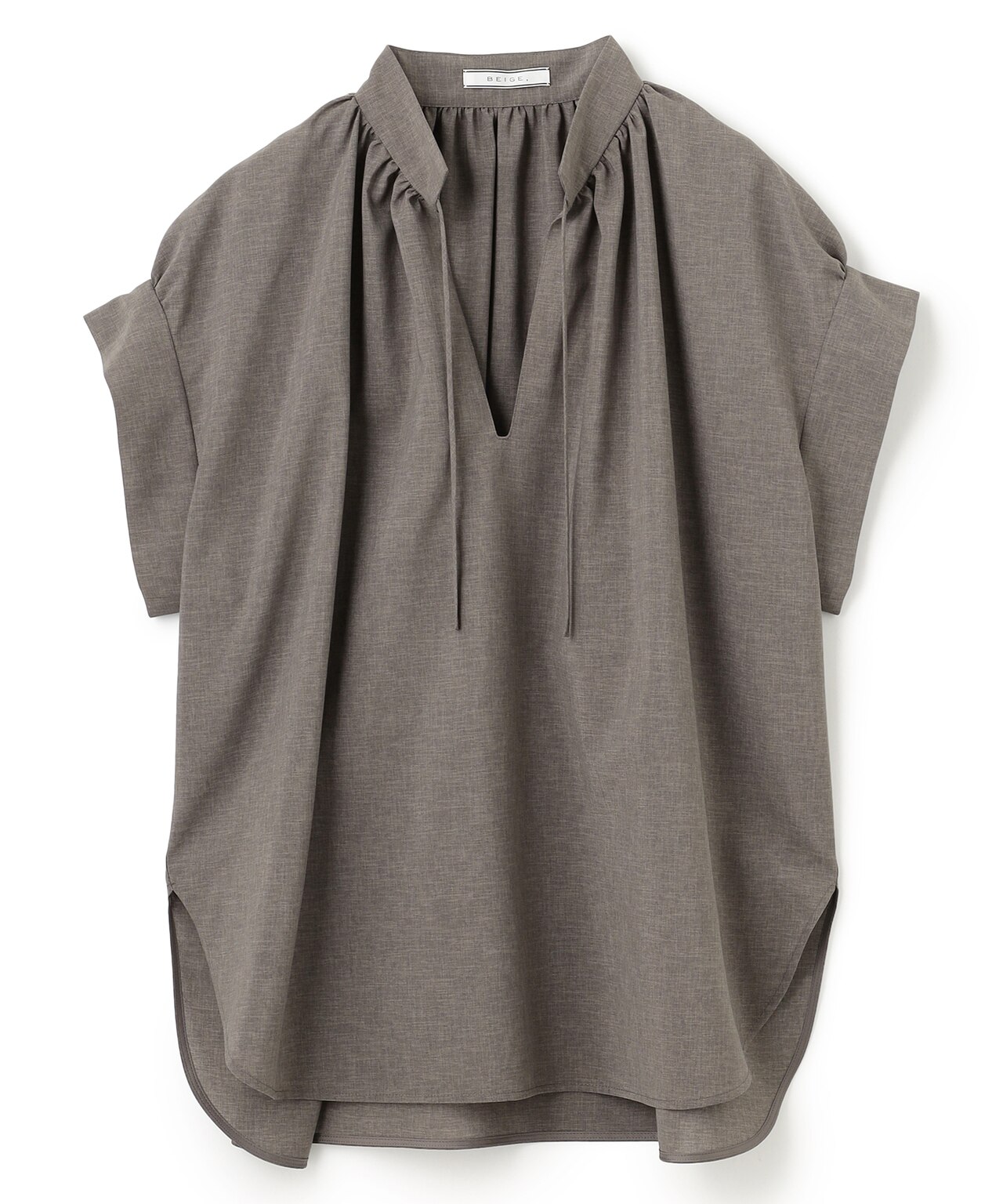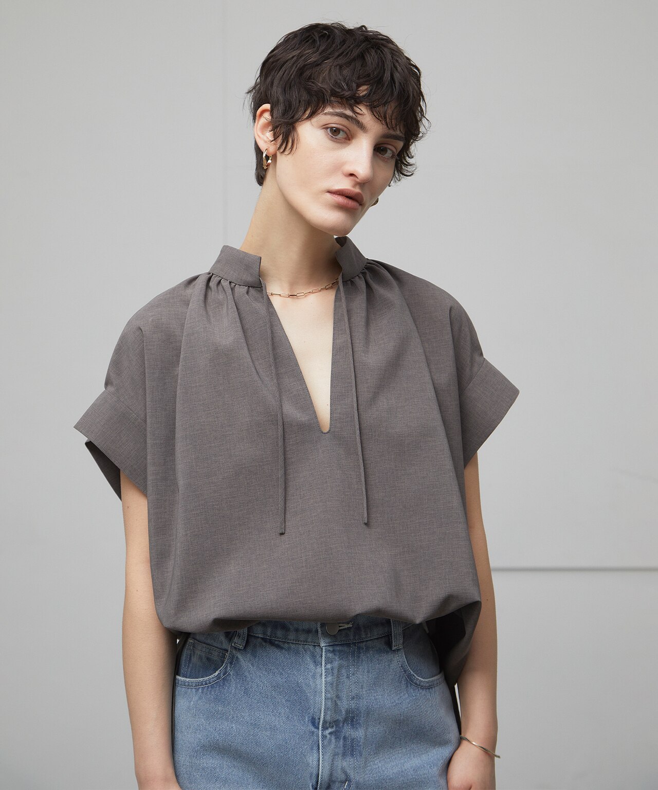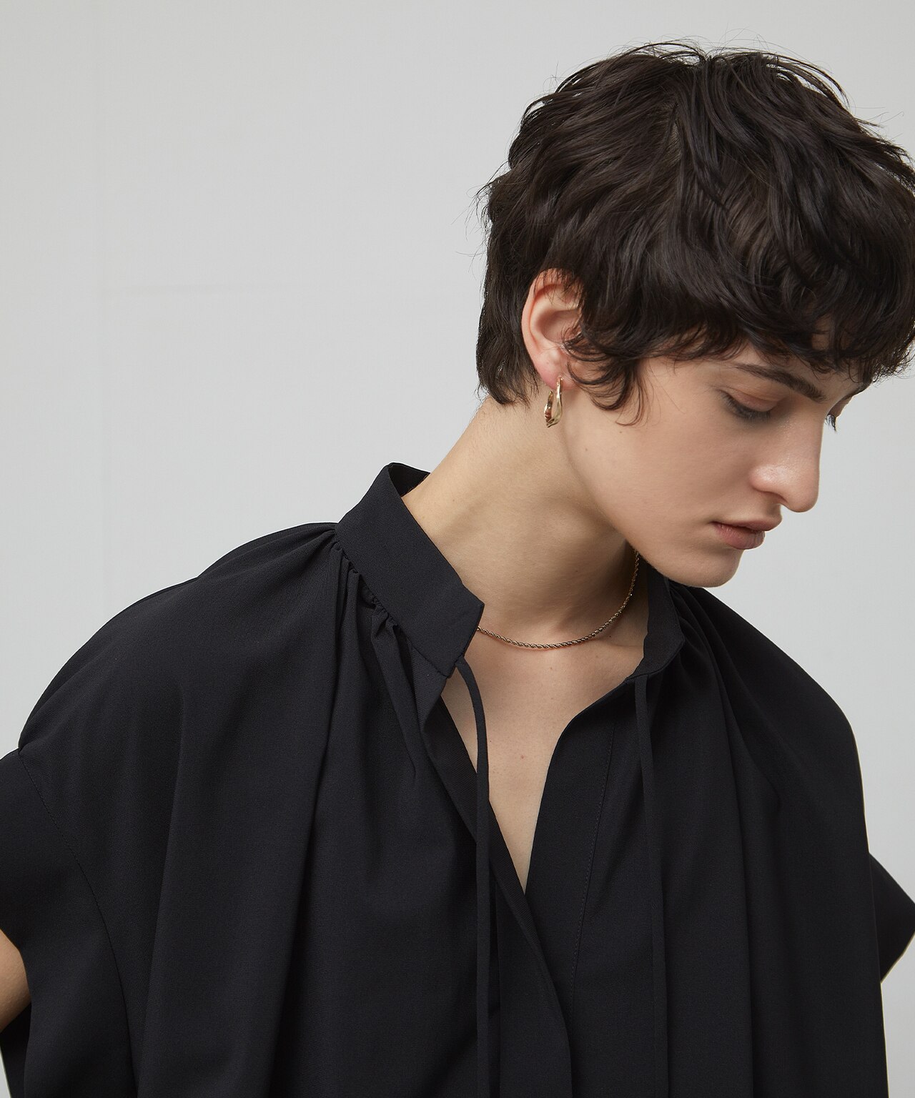 軽やかな素材とボリューム感で夏に涼しく、インでもアウトでも着られるデザイン。高めのスタンドカラーについた共地のリボンは結ばずに揺れ感を楽しむのがおすすめ。