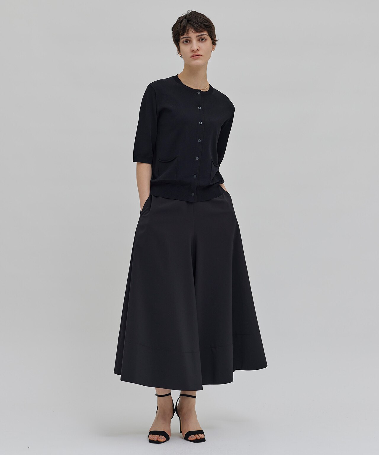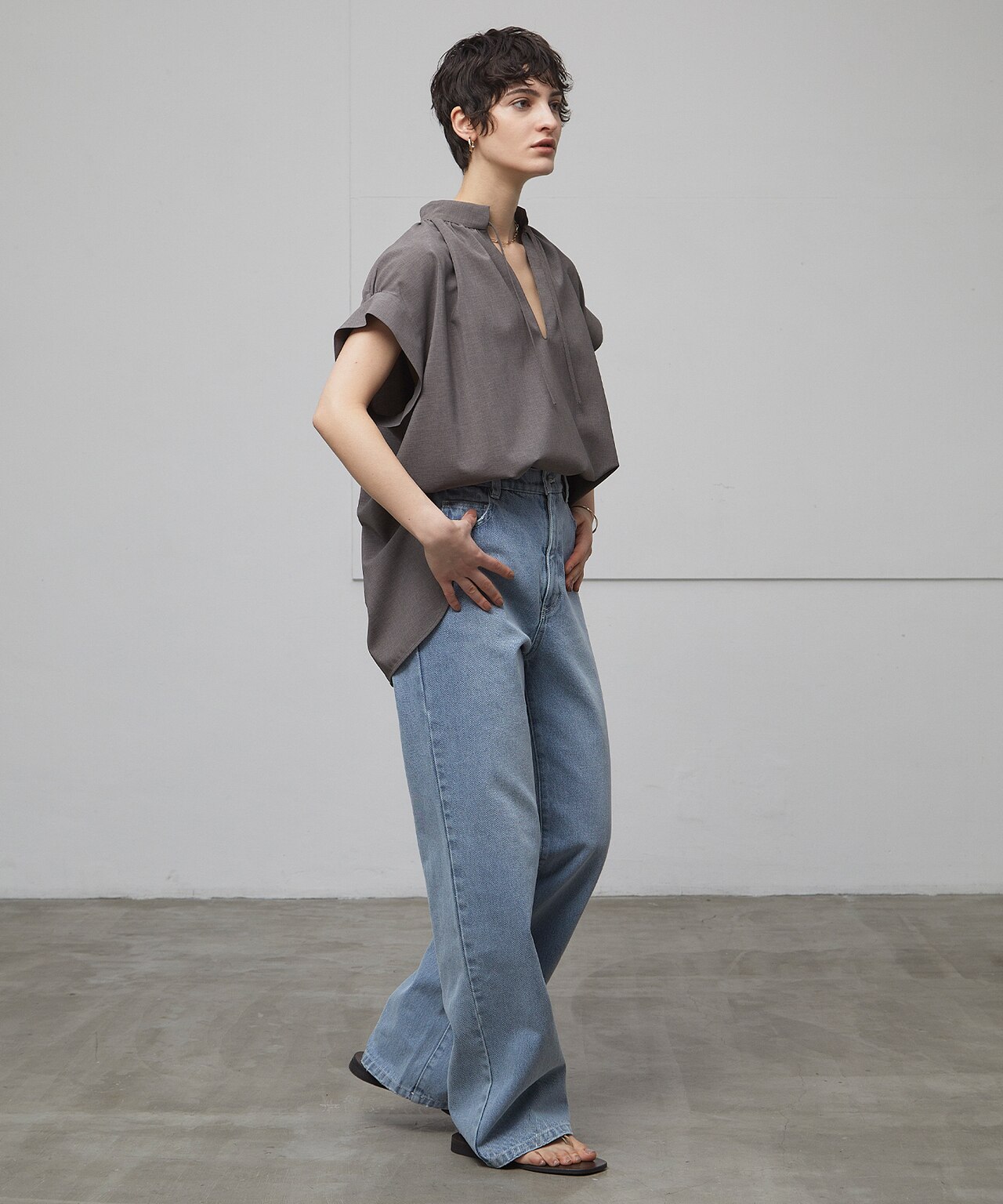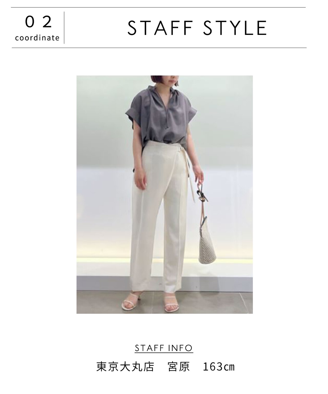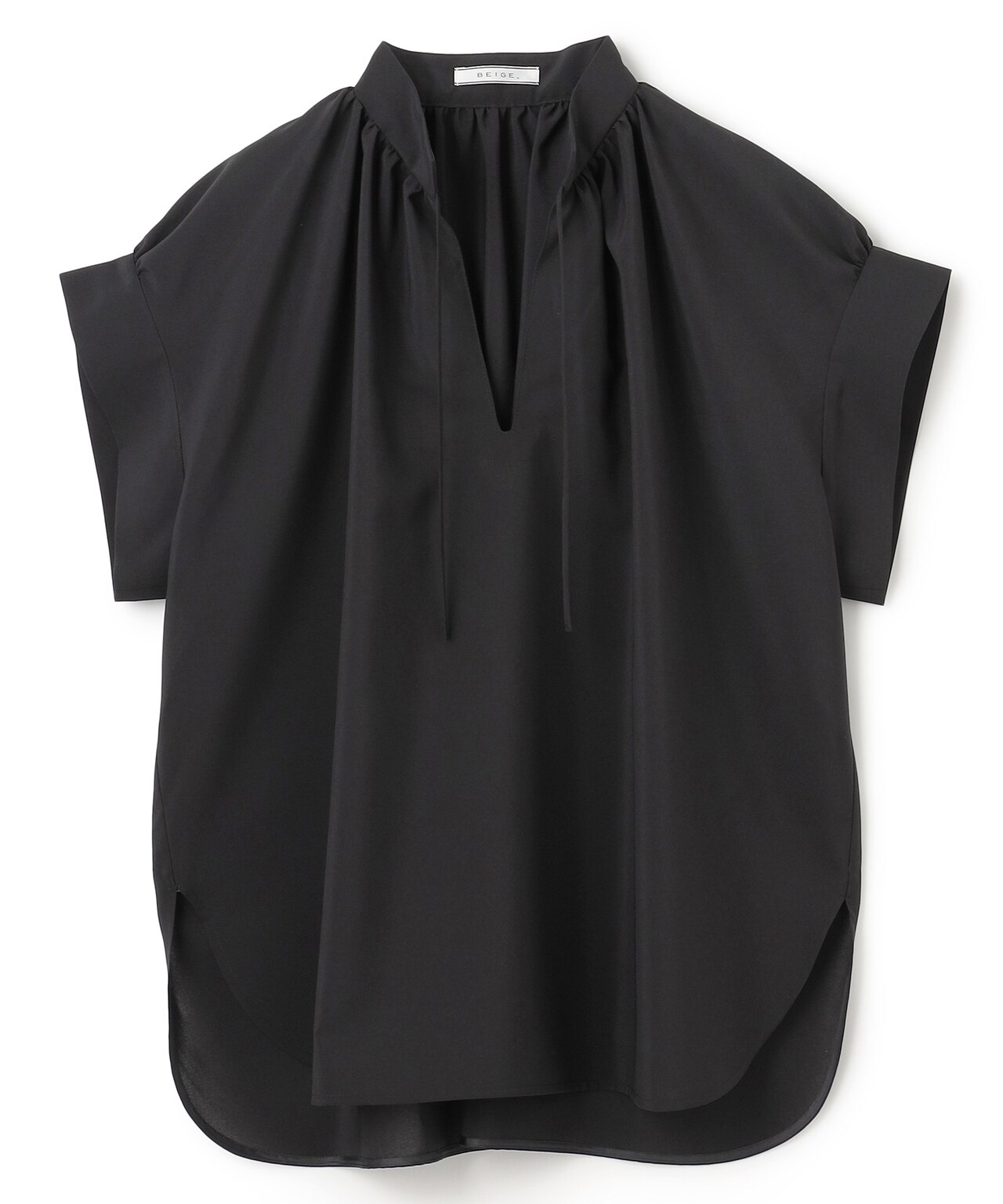 軽やかな素材とボリューム感で夏に涼しく、インでもアウトでも着られるデザイン。高めのスタンドカラーについた共地のリボンは結ばずに揺れ感を楽しむのがおすすめ。