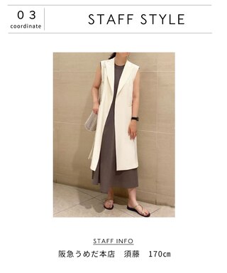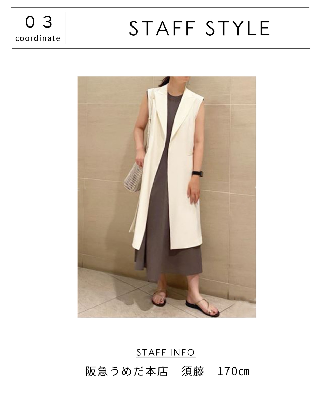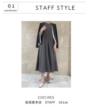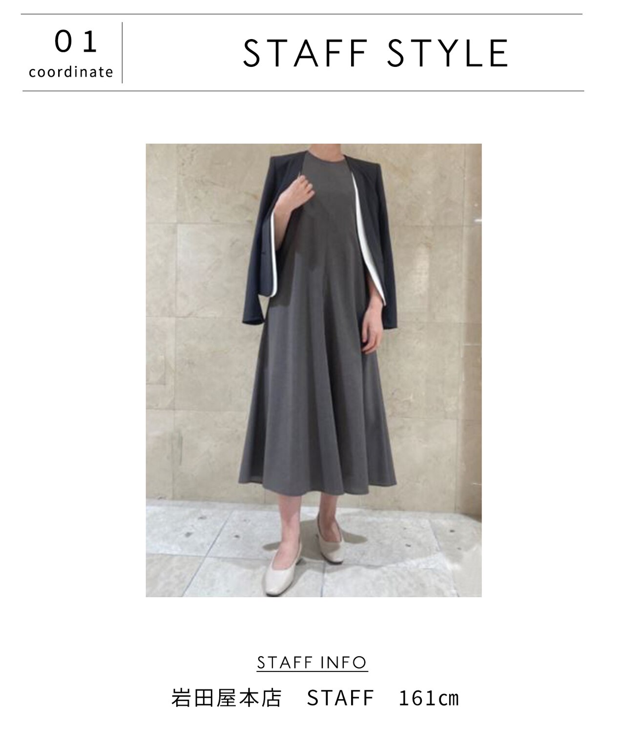 上品なAラインワンピースにBEIGE,定番CINDYのジャケットを合わせました。ワンピースはジャケットやカーディガンを合わせれば初秋まで着られまます。