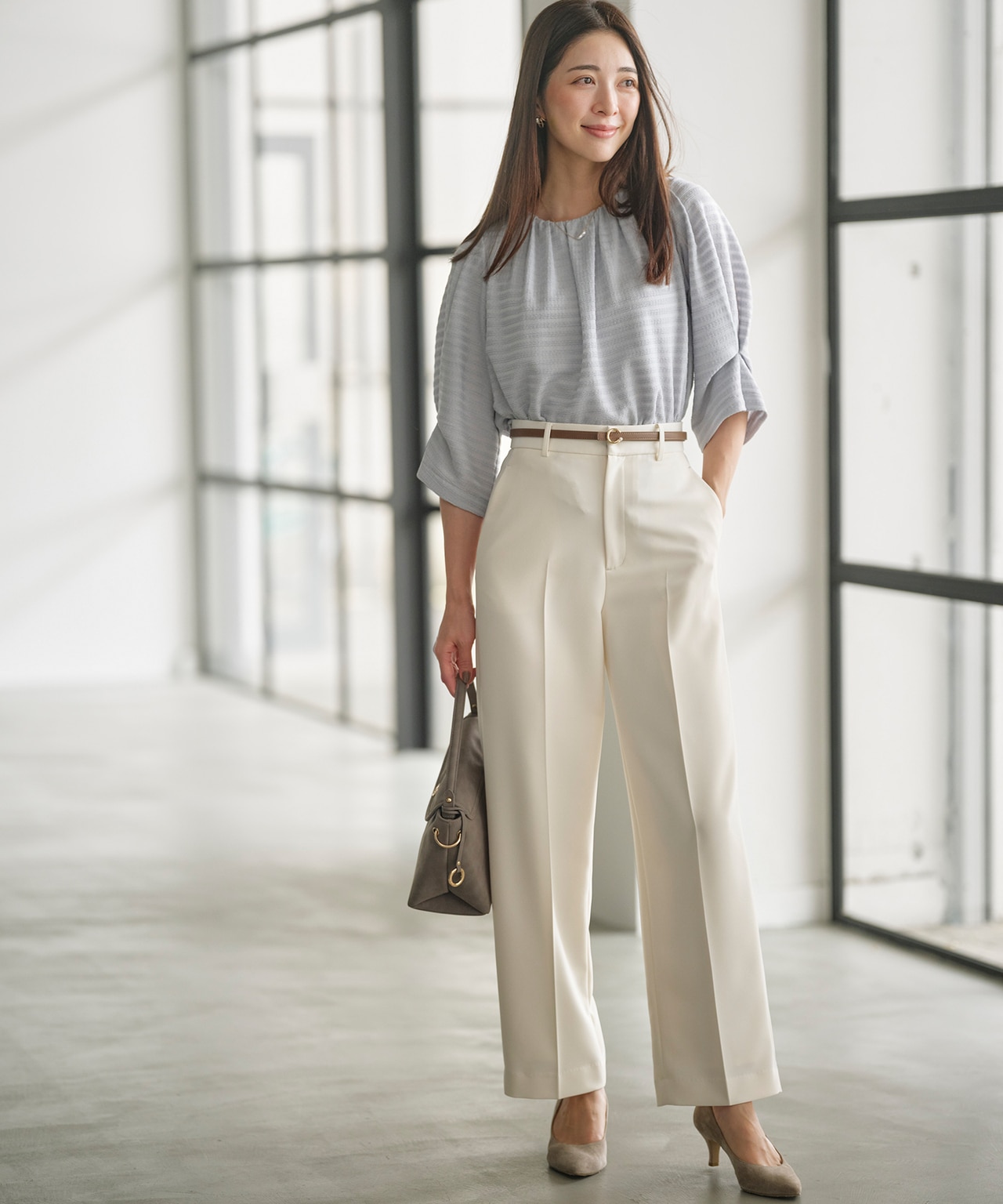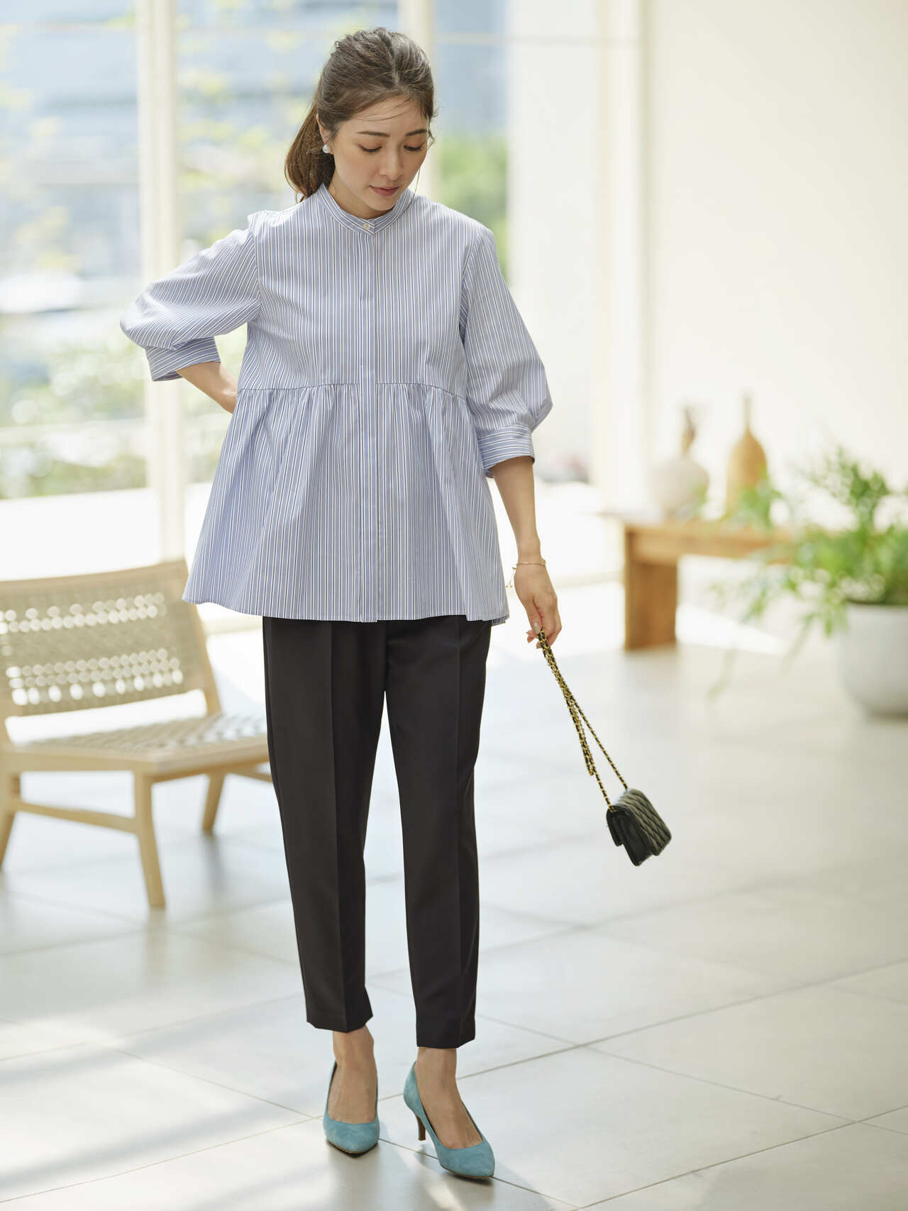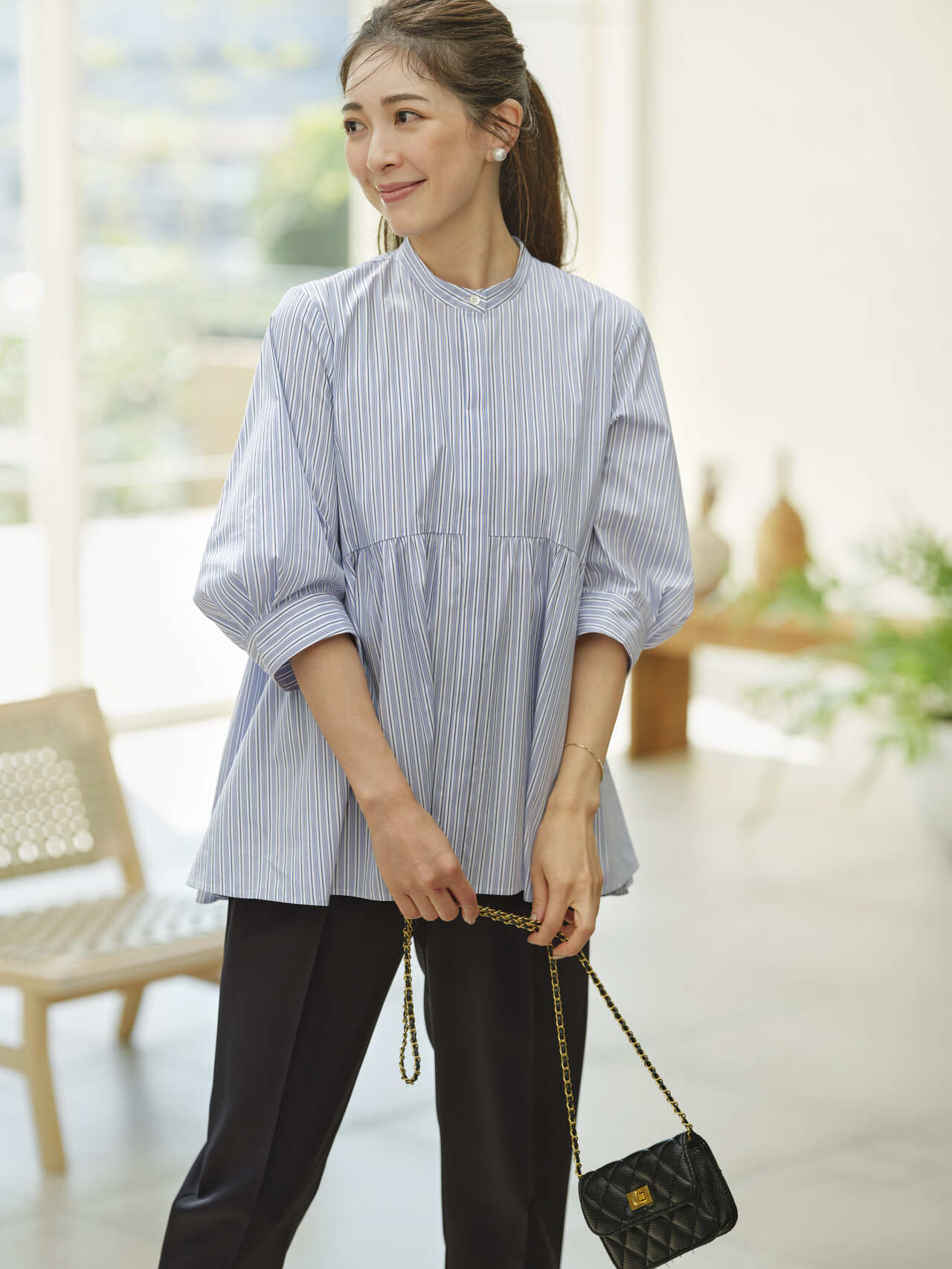 上質なシャーティング生地や、ボーダージャガードなどきれいめ素材がポイントの洗練されたデザインブラウス。夏から秋にかけて活躍する万能アイテムです。