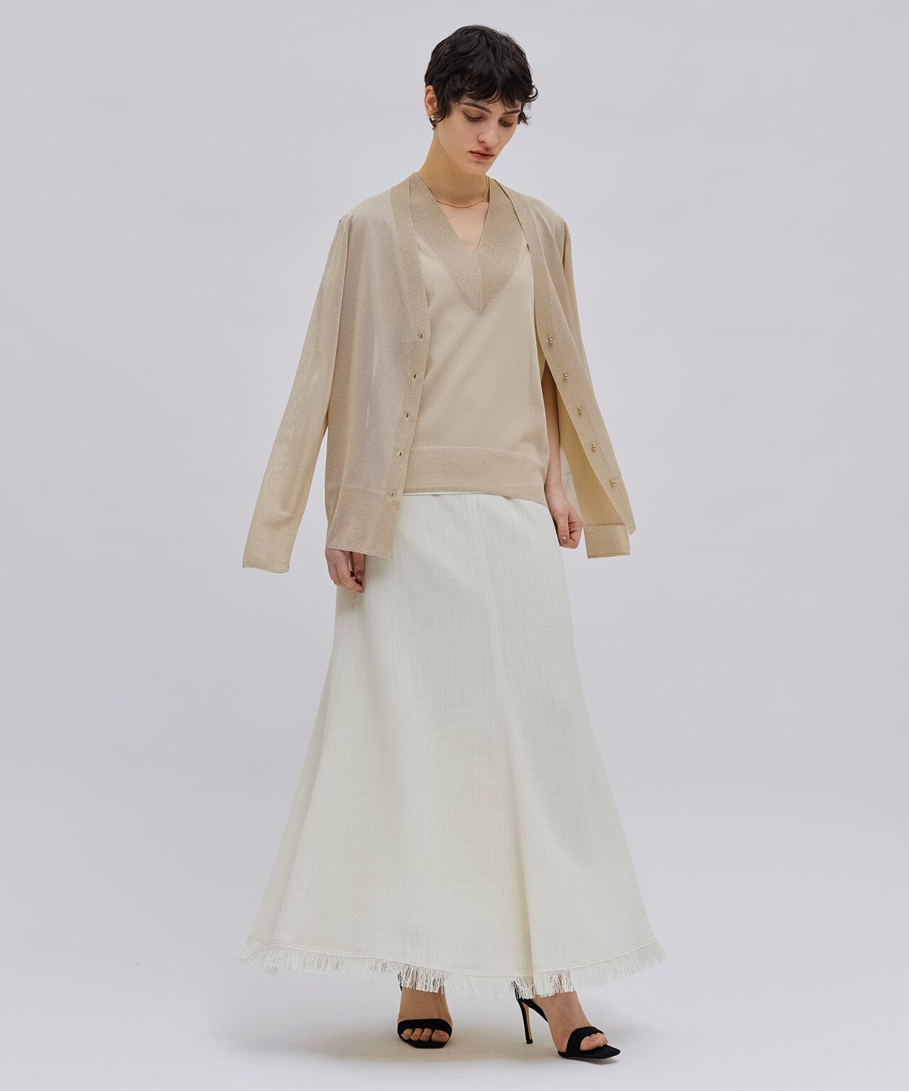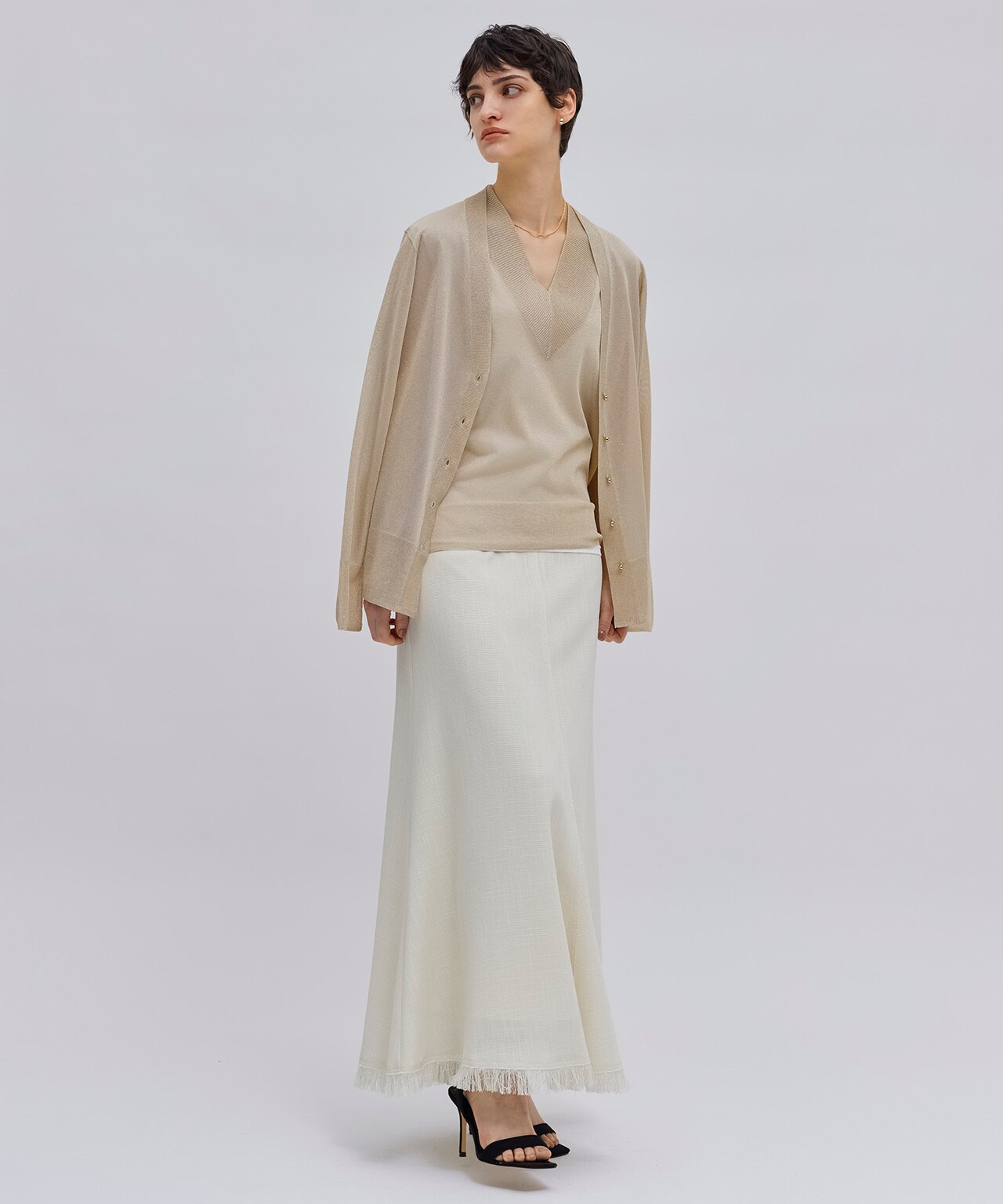 Vネックのすっきりとした首元が大人の装いにぴったりなトップス。細やかなラメと透け感で、アクセサリー無しでも、女性の魅力が引き立ちます。