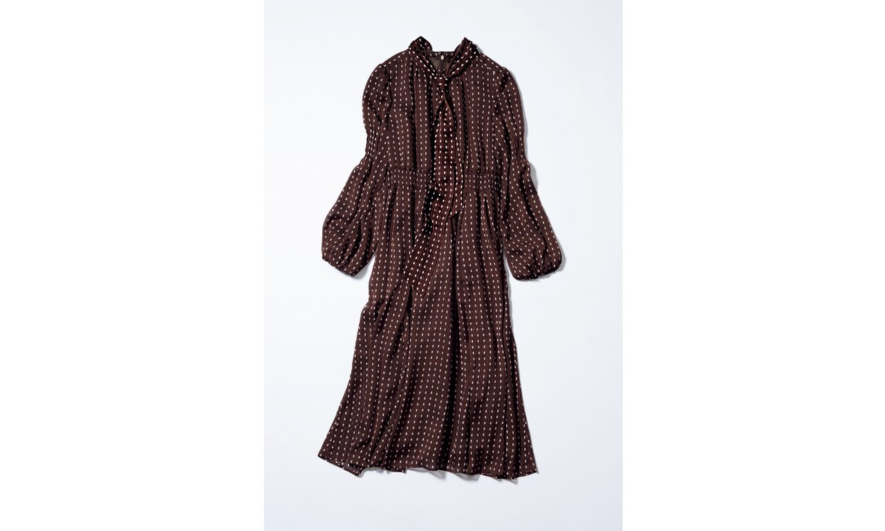 色違いは、大人っぽさの中に甘さもあるブラウン×ピンクのプリント。トレンドカラーのブラウンがおしゃれな印象です。