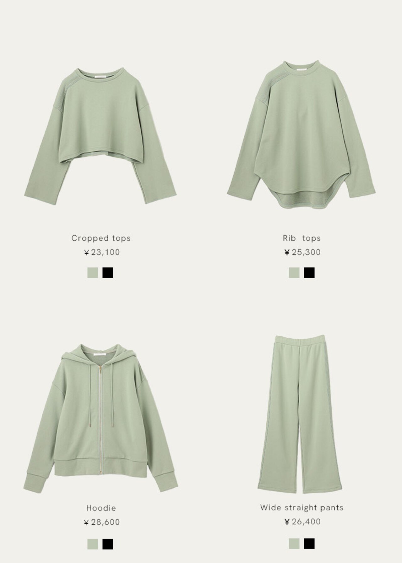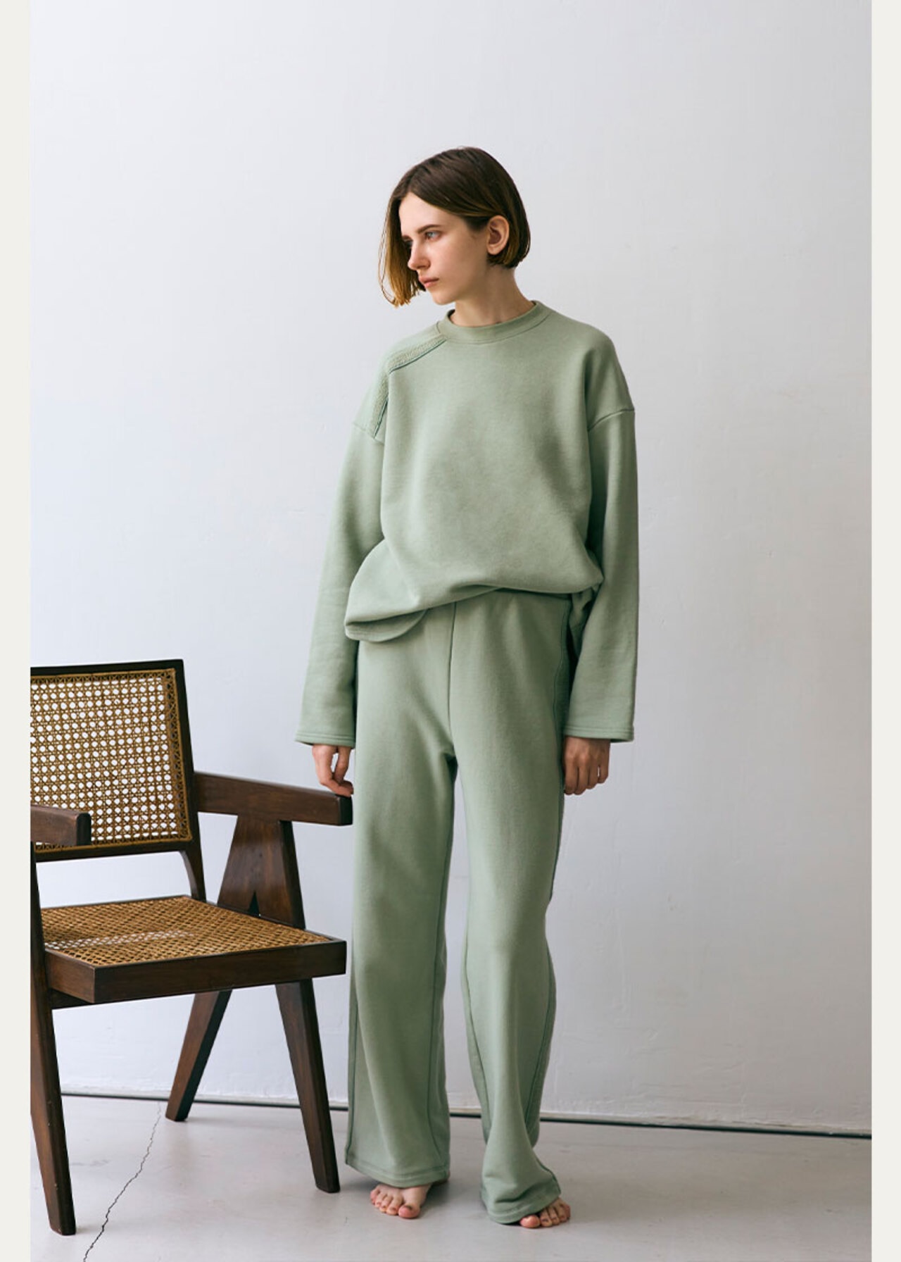 裏毛の裏側の素材を表に出し、端をメロウステッチで抑えた接ぎ目でデザインをプラス。素材の風合いを楽しむことができます。