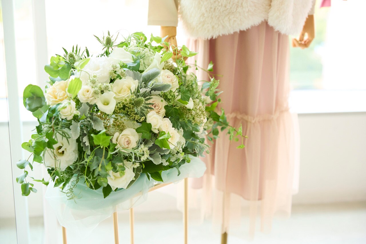 ふんわりドラマティックなフレアワンピースはバックスタイルが大振りのリボンデザイン。ブラウスのパフスリーブと合わせて、女性らしいスタイリングが楽しめる。