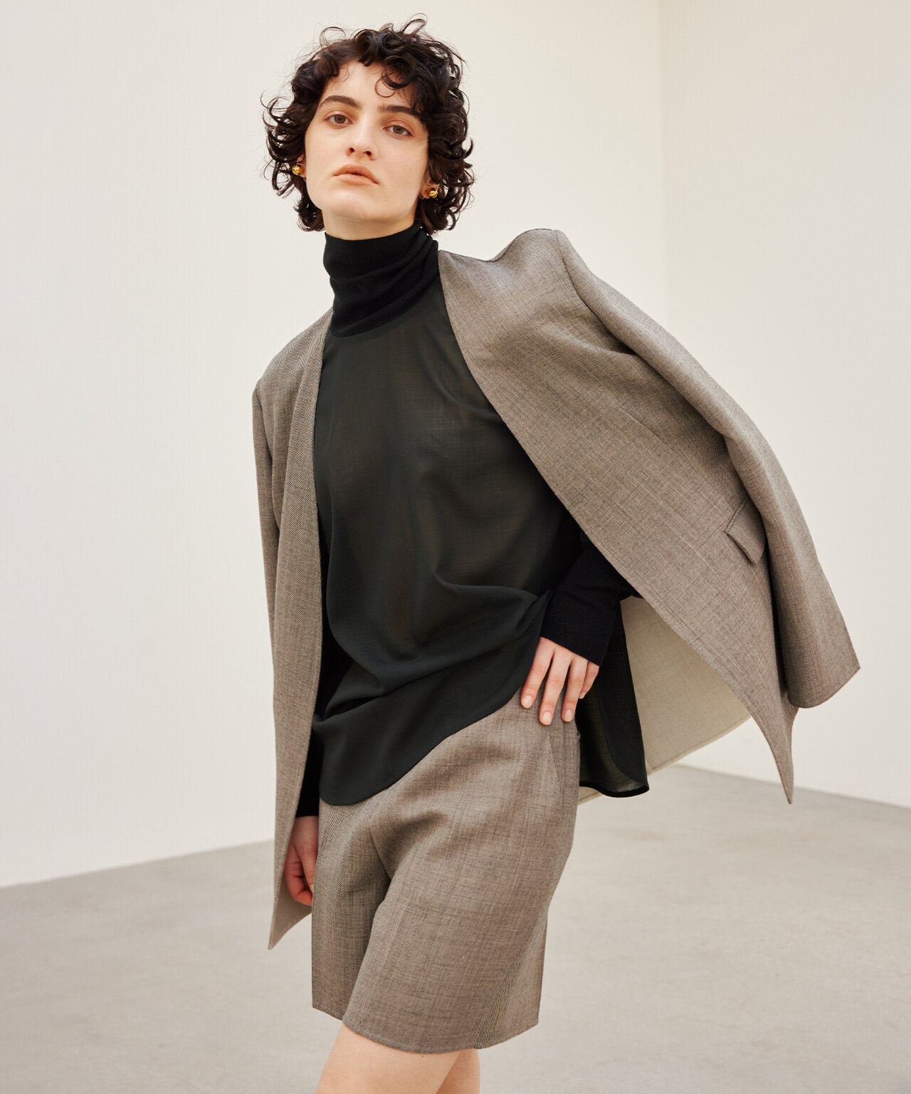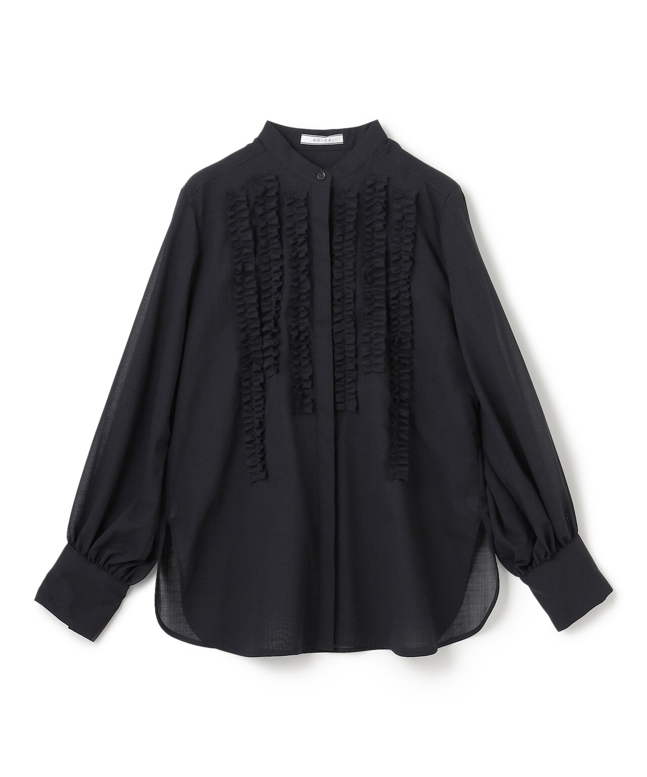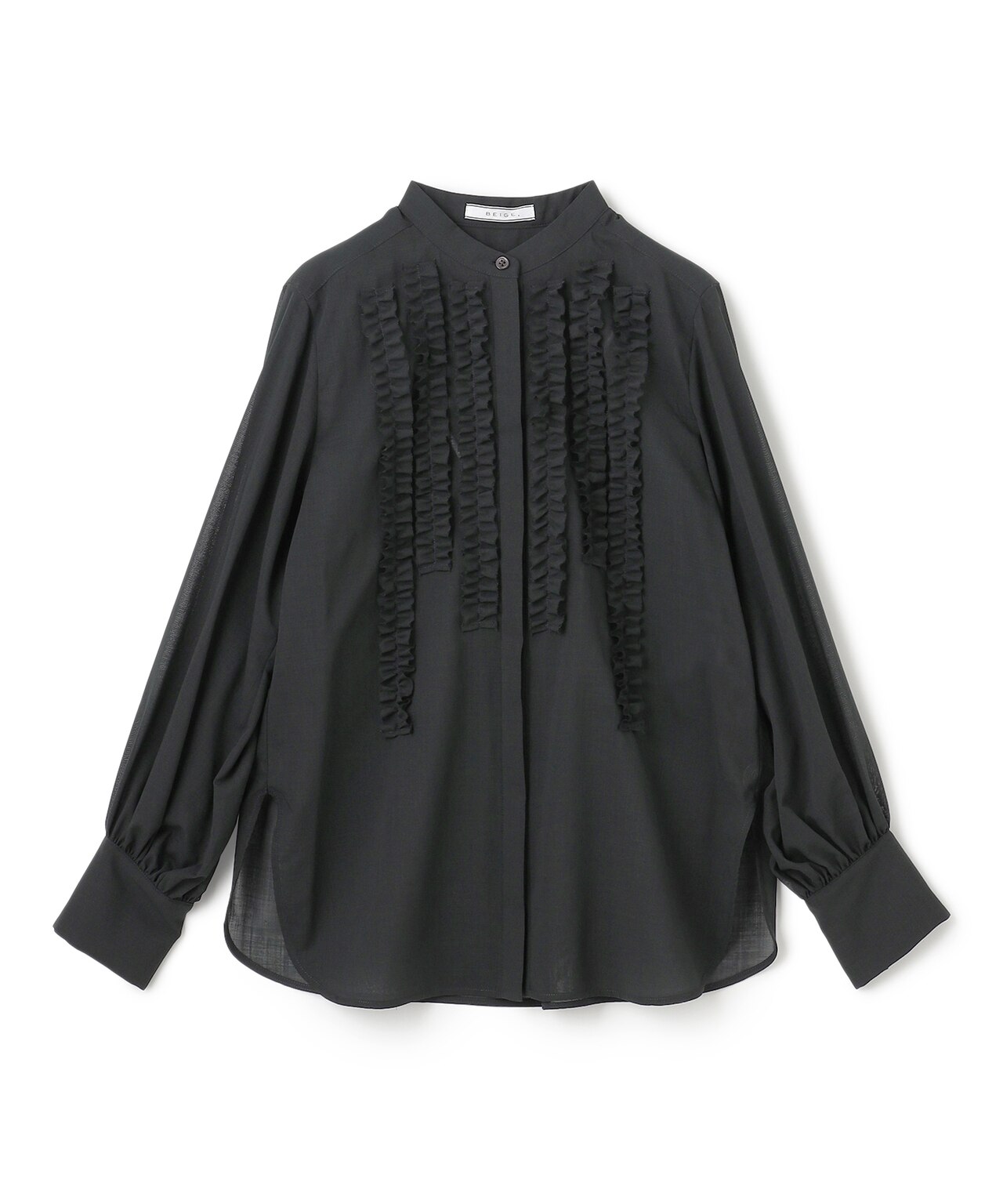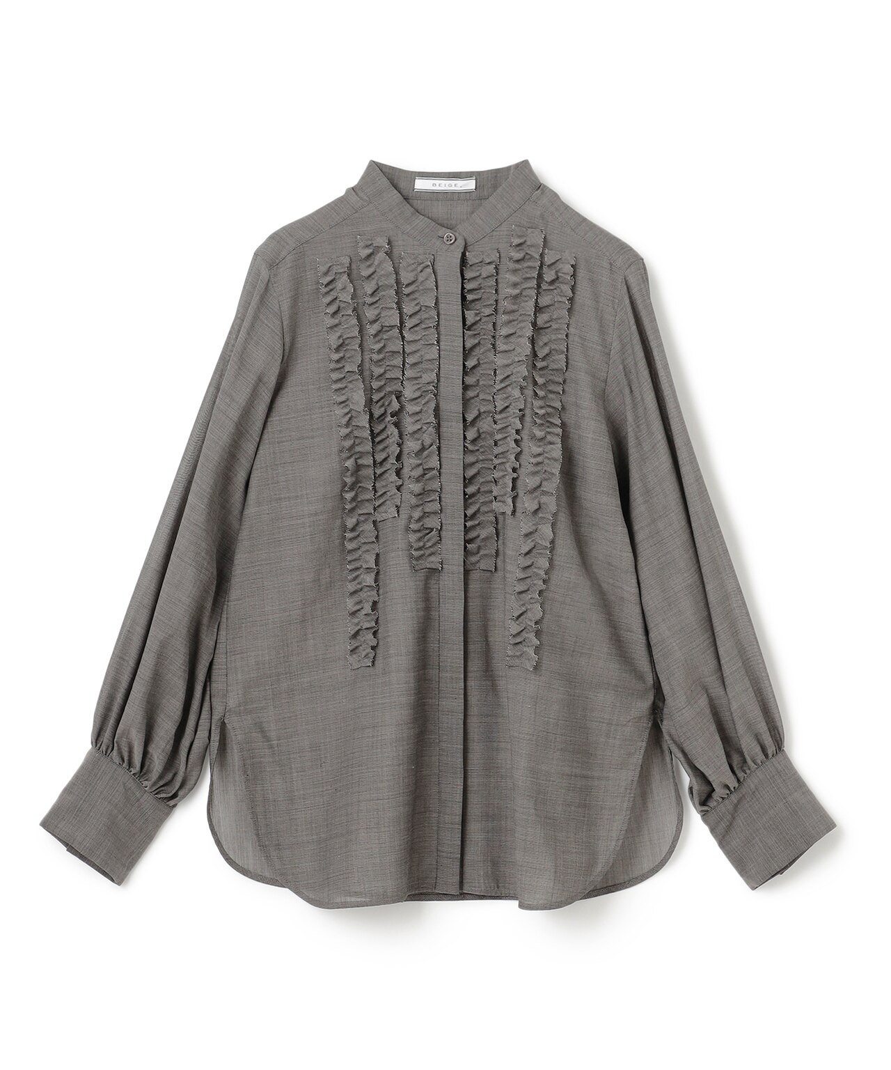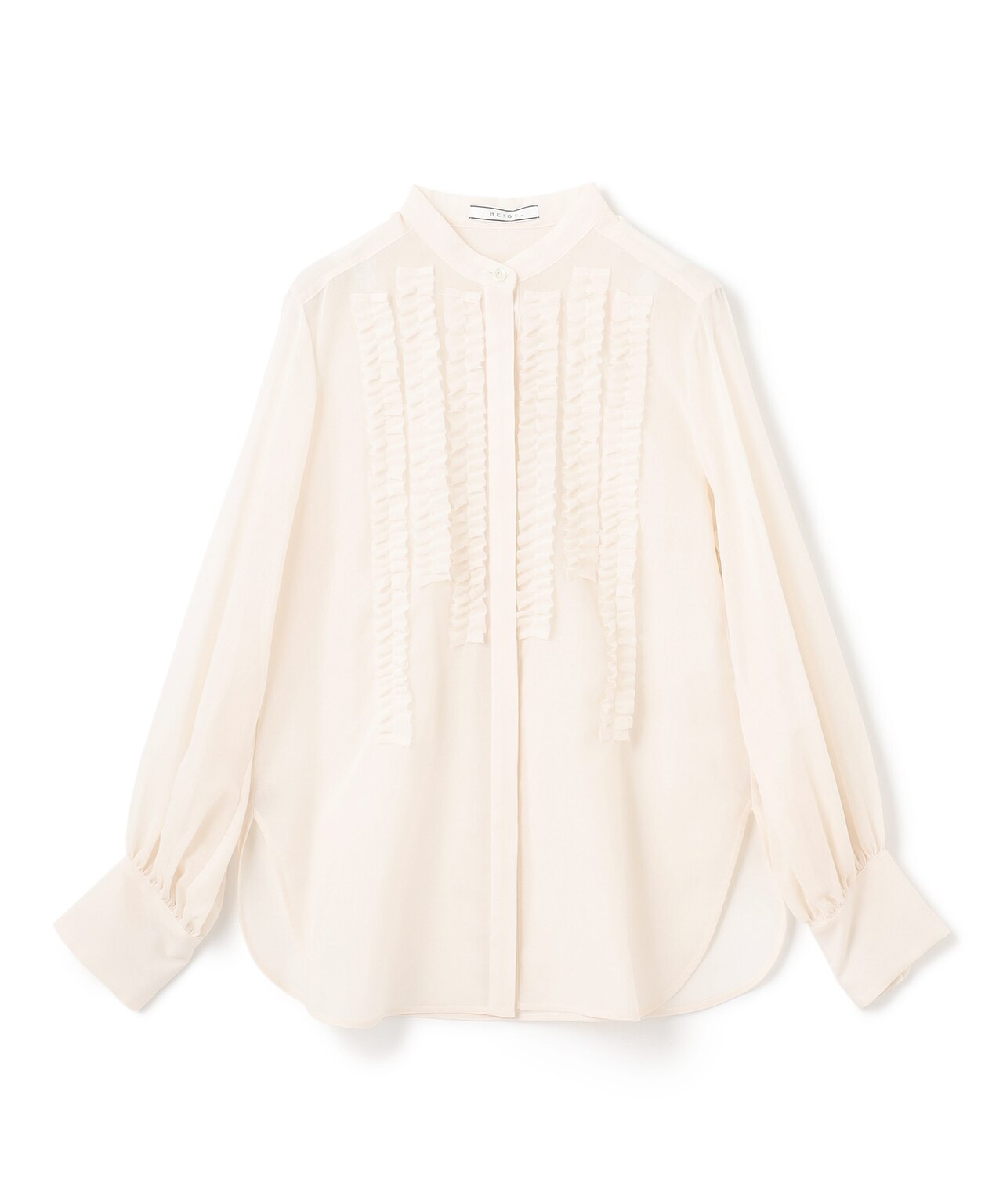 甘さのあるフリルとパフスリーブを、シャツディテールで辛さを加えたブラウス。少し首元を開けてニュアンスを出したりと、着方次第で印象が変わり、女性らしさを存分に楽しめるデザイン。