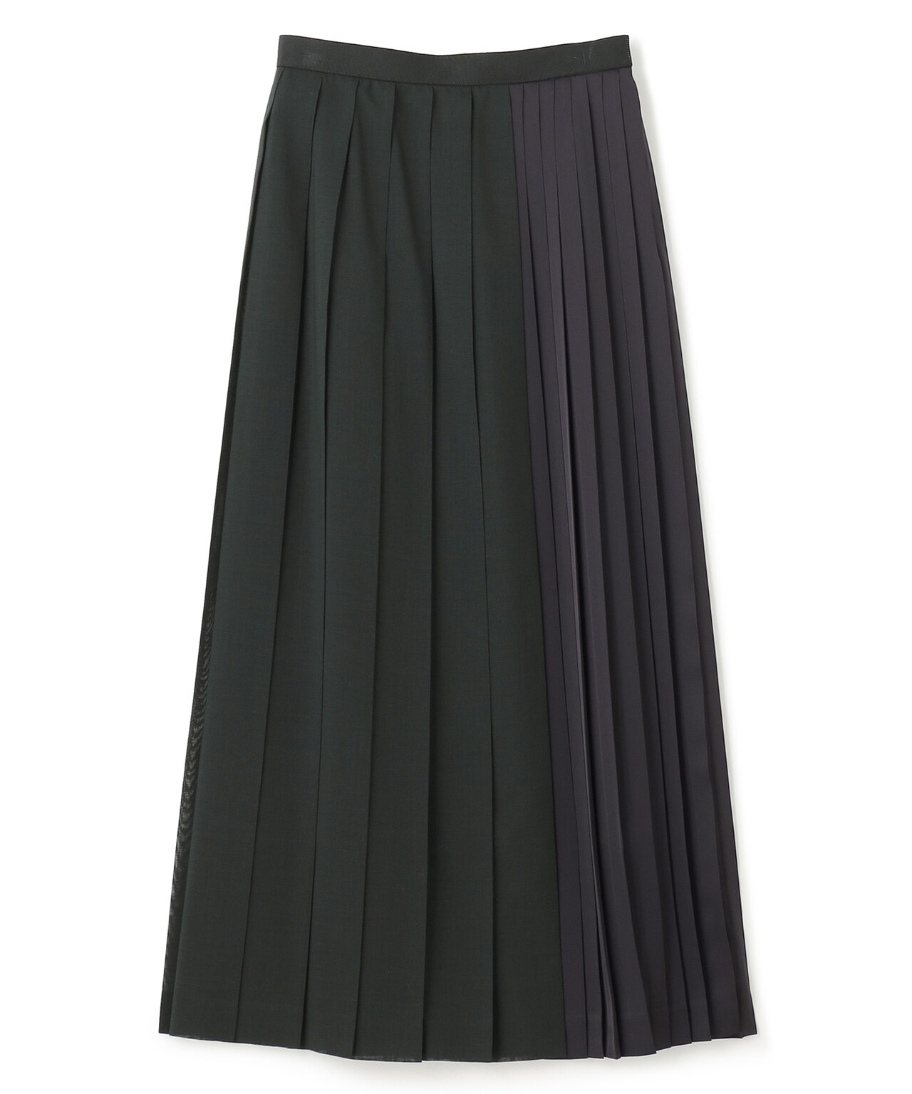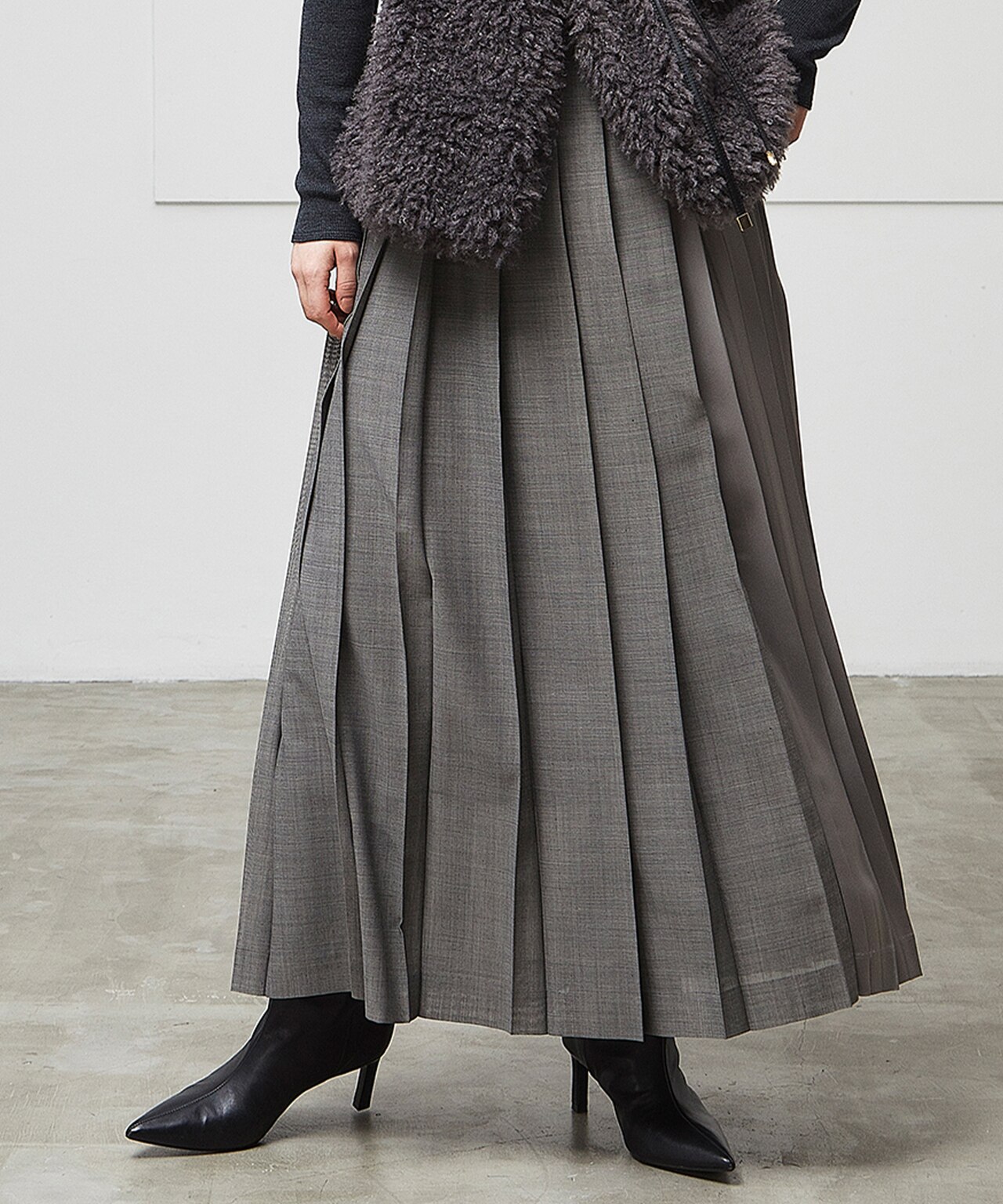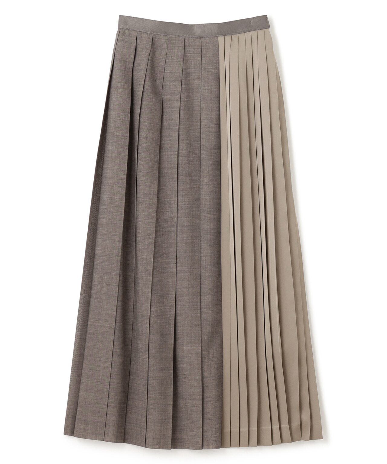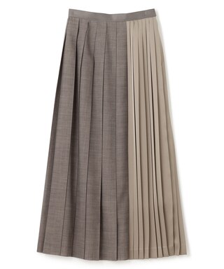 異なるプリーツを組み合わせ、色合いや素材の違いを一枚で感じるエレガントなスカート。素材に変化があることでベーシックなトップスの合わせはもちろん、一枚で華やに印象的なデザインに。