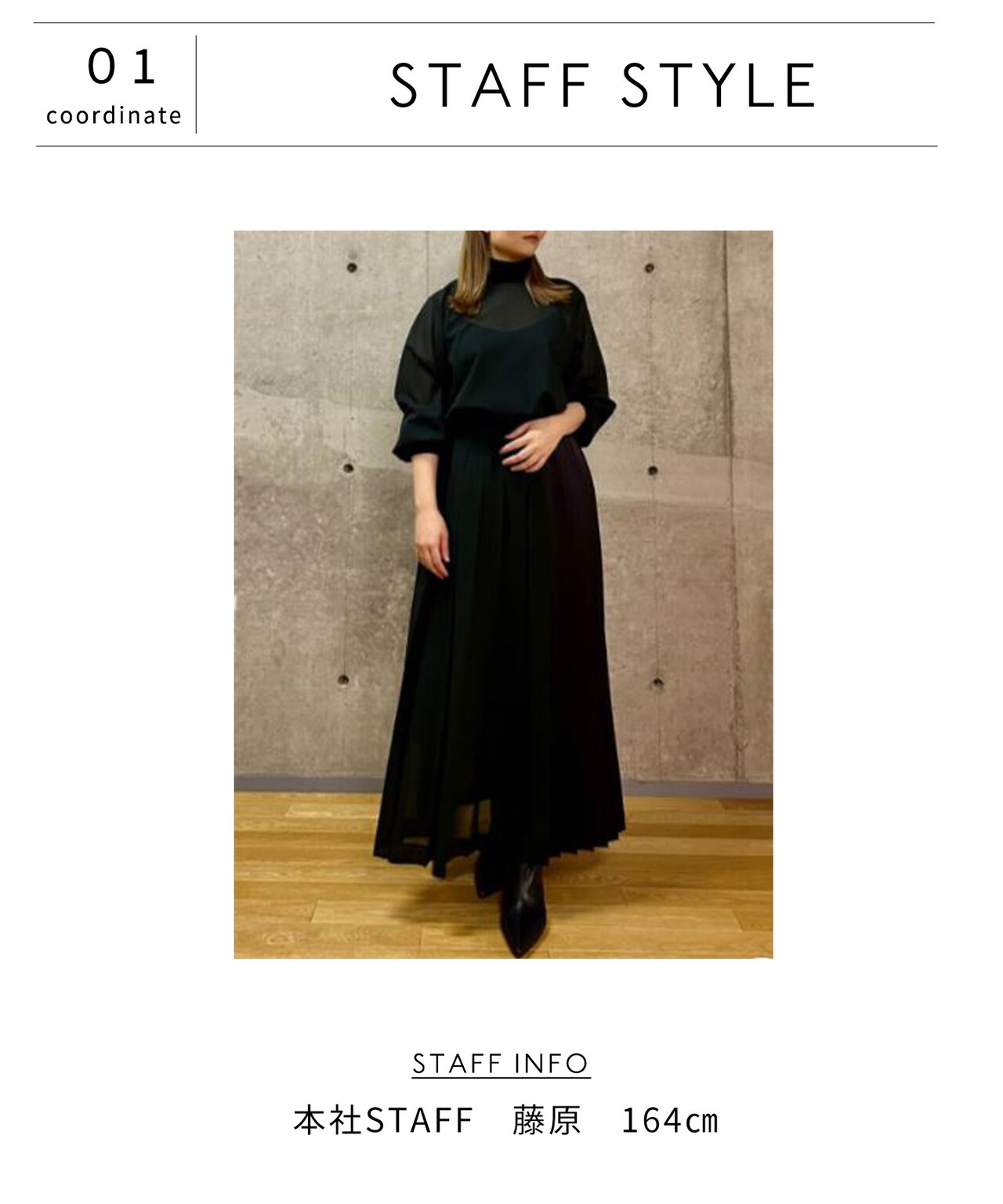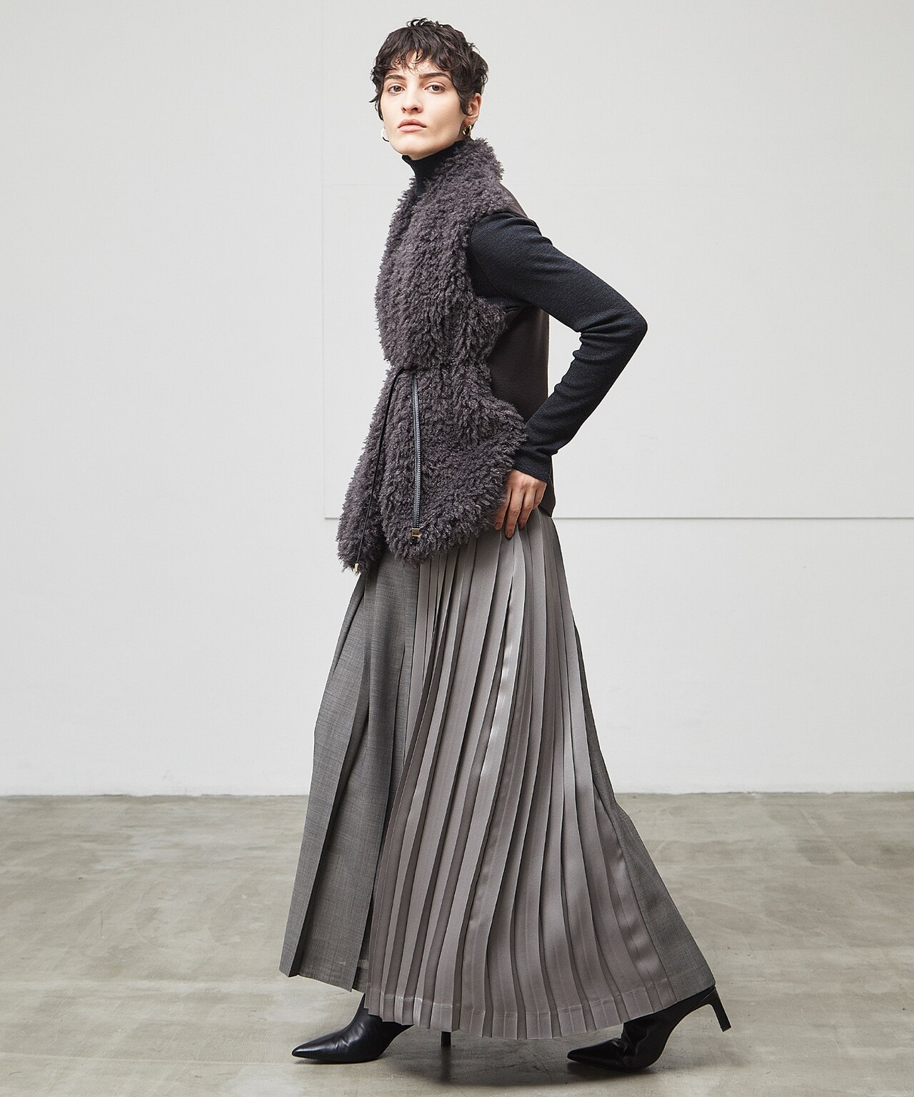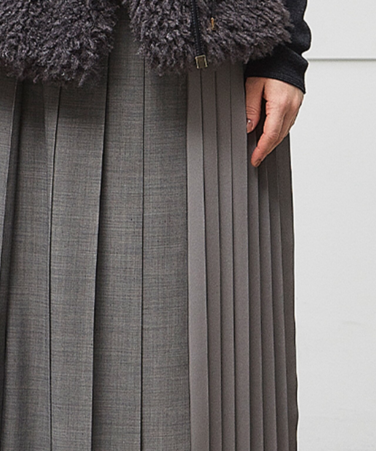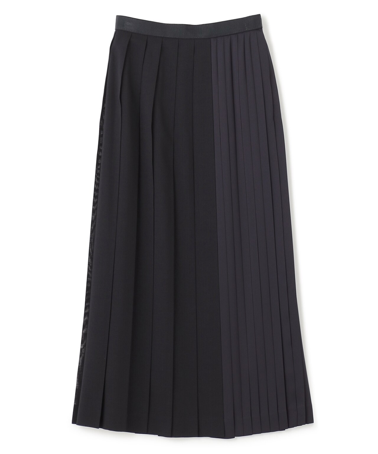 異なるプリーツを組み合わせ、色合いや素材の違いを一枚で感じるエレガントなスカート。素材に変化があることでベーシックなトップスの合わせはもちろん、一枚で華やに印象的なデザインに。