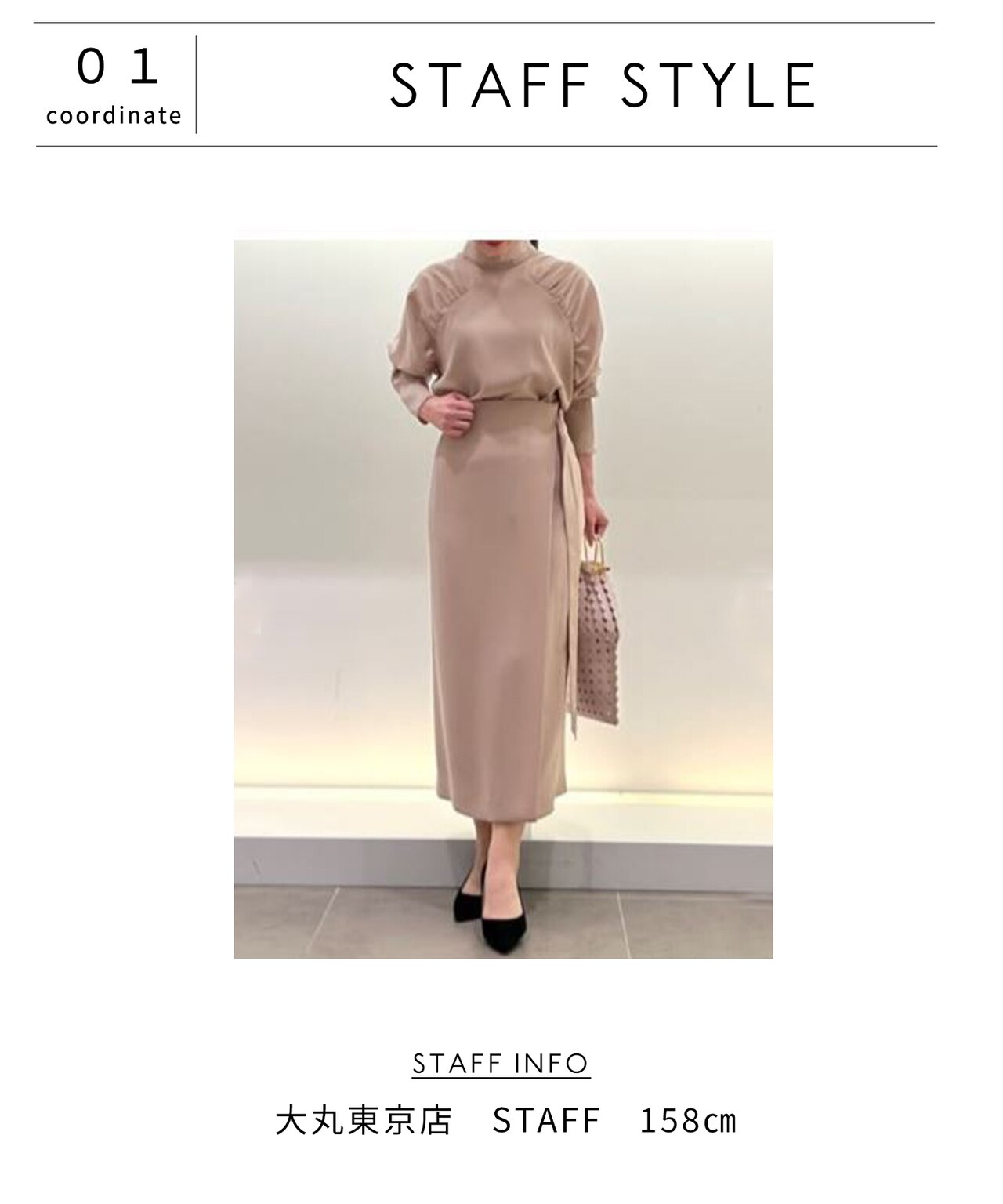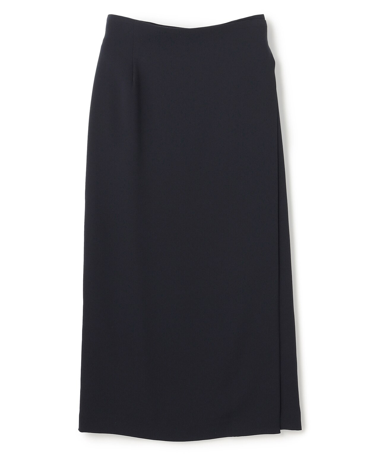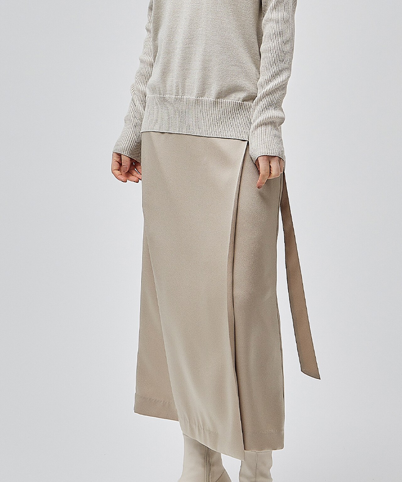 着るだけで、ニュアンスのある表情を与えるラップスカート。同素材のブラウスを合わせてワンピース風な着こなしや、シンプルなトップスと合わせてロングタイがバックスタイルのワンポイントに。