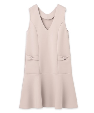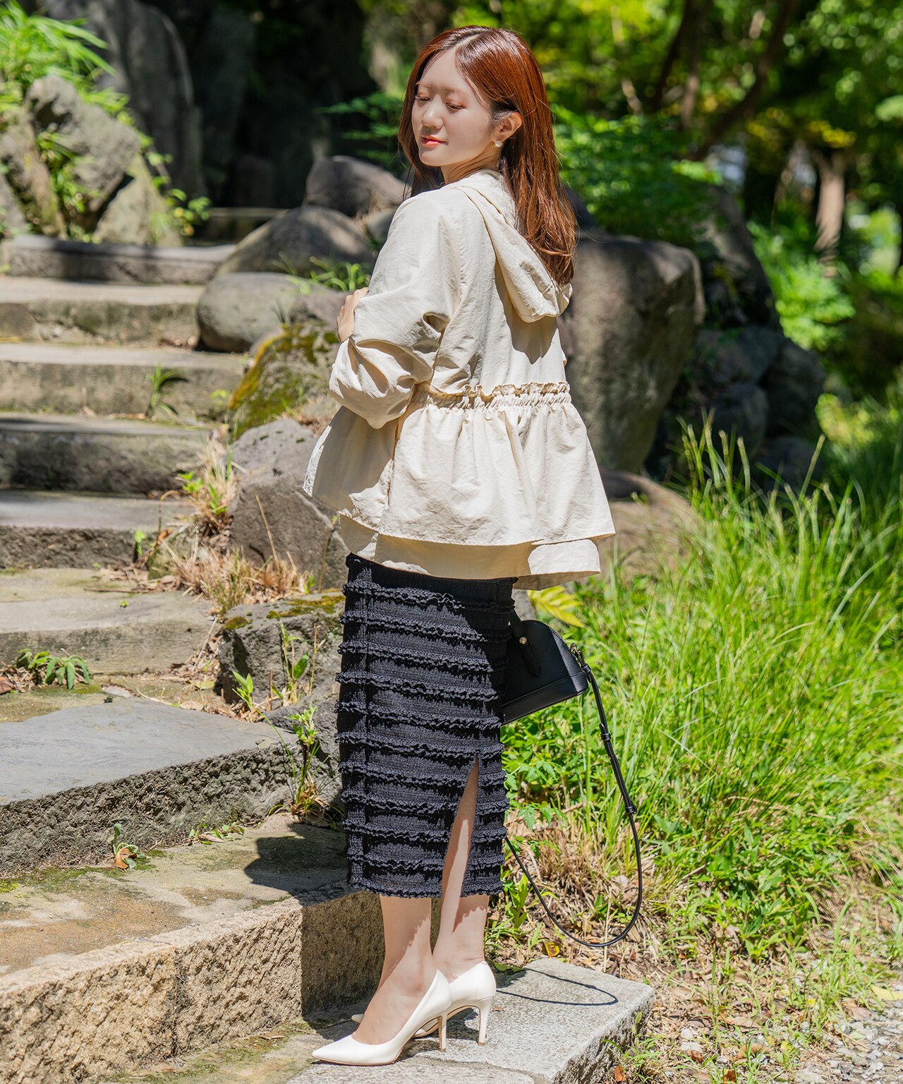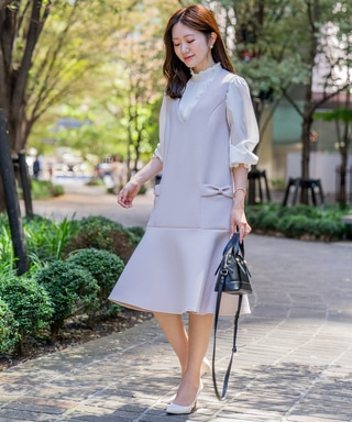 ずっと触りたくなる質感のダンボールシリーズは軽くて着心地バツグン。ブラウスの上品なギャザーがワンピースと好相性。