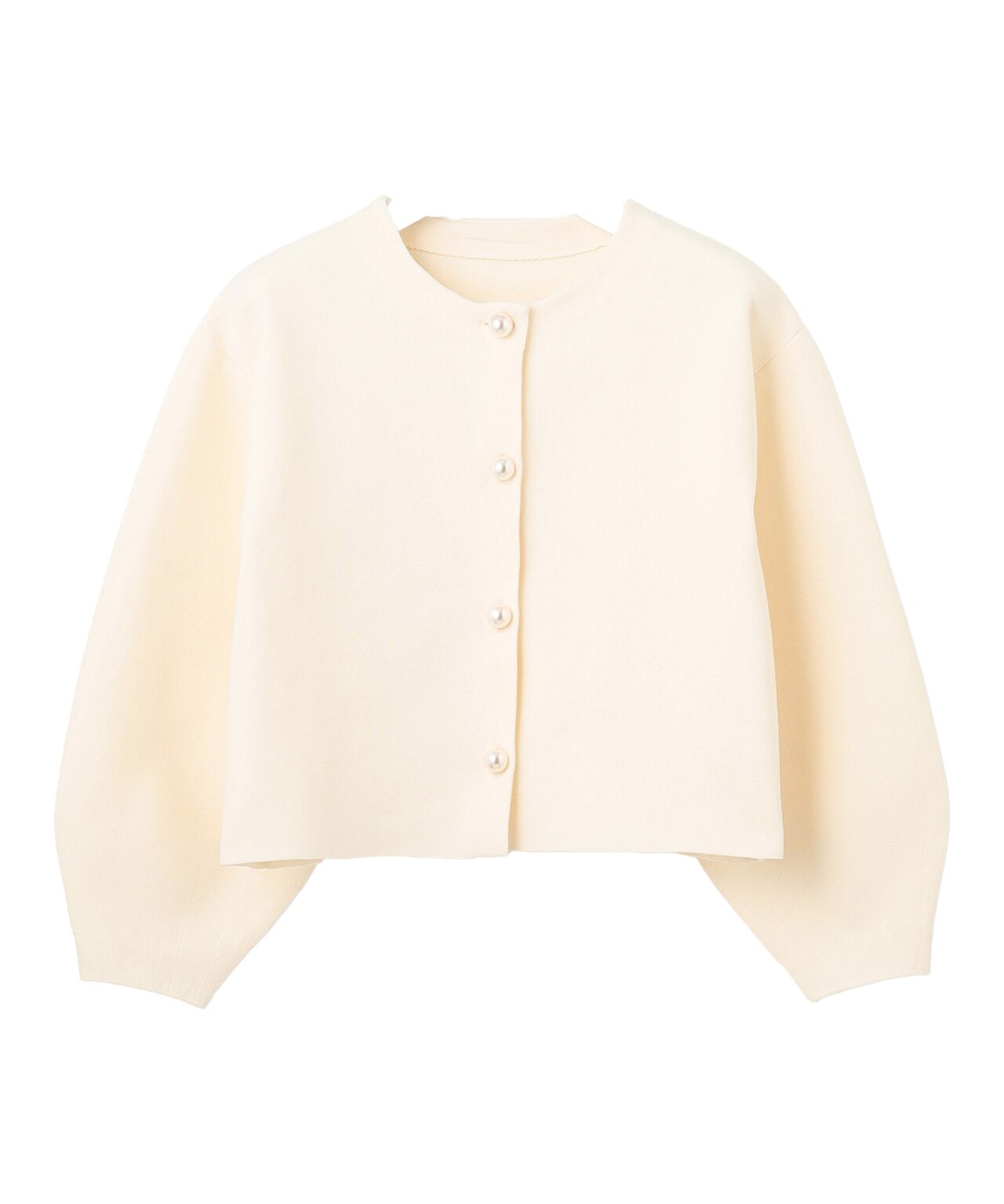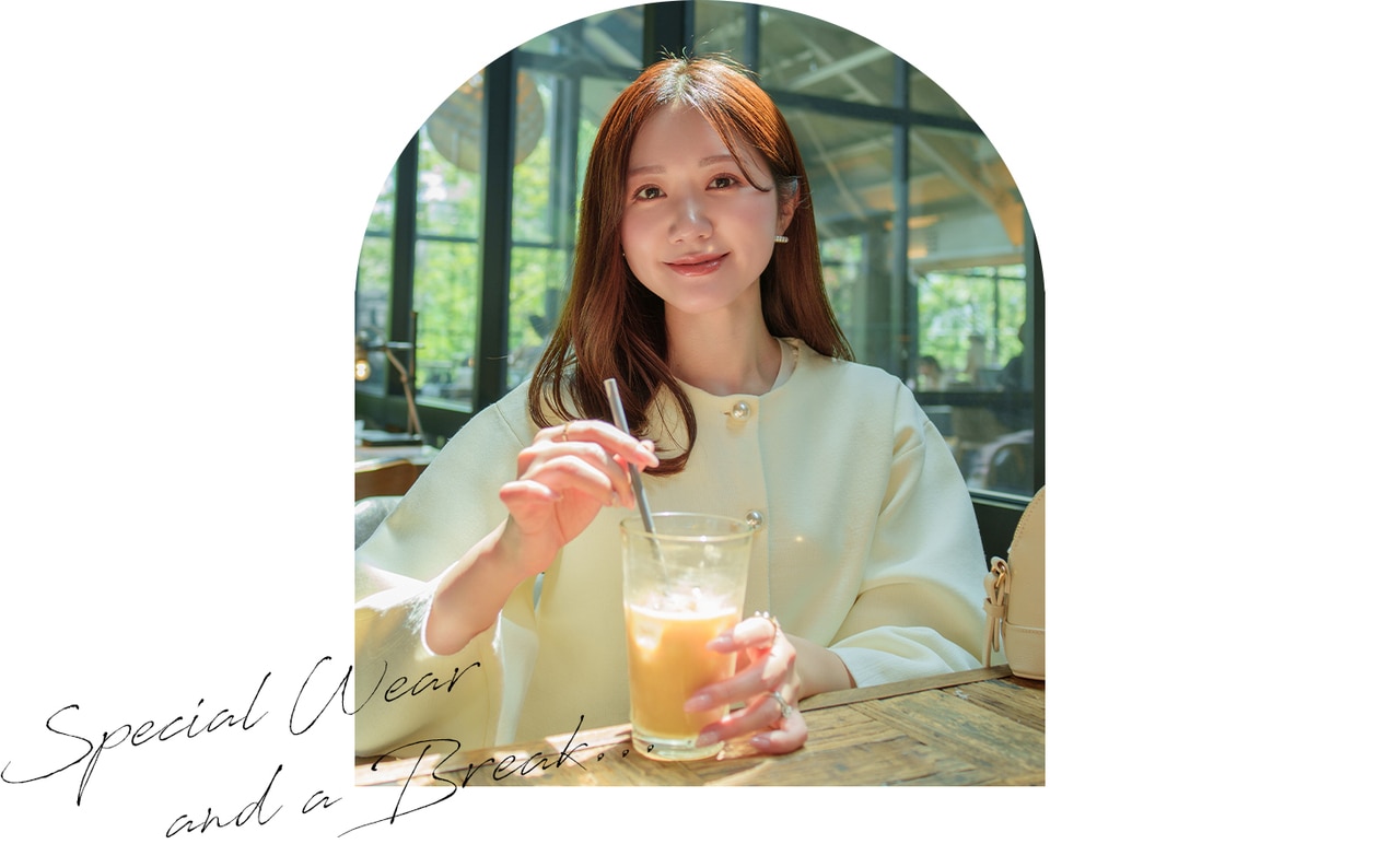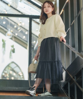 パフっとしたお袖と大き目のパールがお気に入りのポイント。キラッと光るチュールスカートはレディなムードを漂わせてくれる。