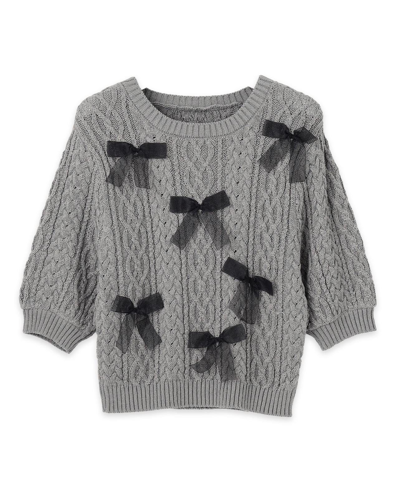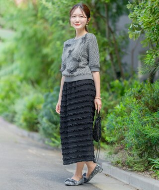 ランダムリボンの愛らしいニットと大人っぽIラインスカートで大人の甘辛MIXスタイルに。