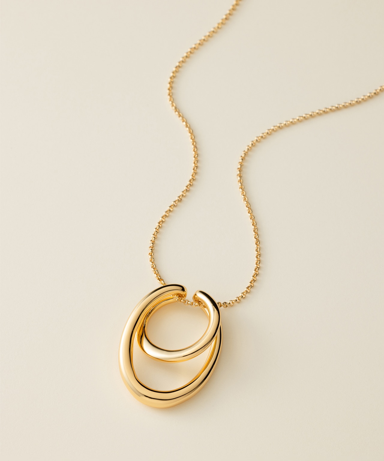 モードながら女性らしく着用いただけるリングを重ねたデザインのワントップネックレス。トップはコンパクトですが、ダブルリングなので存在感があり、シンプルなコーディネートに映えます。