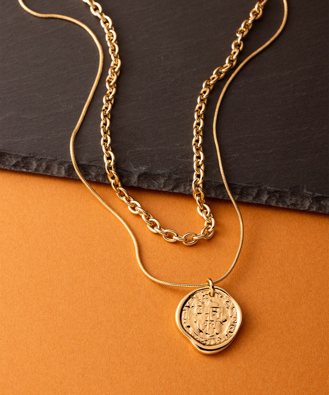 シーリングスタンプをイメージしたメタルトップデザインにスネークチェーンとあずきチェーンを使用たデザイン性の高い1本。2way仕様なので、それぞれ単品でもお使いいただけます。テールも取り外し可能なので自分好みの長さにアレンジも楽しめます。