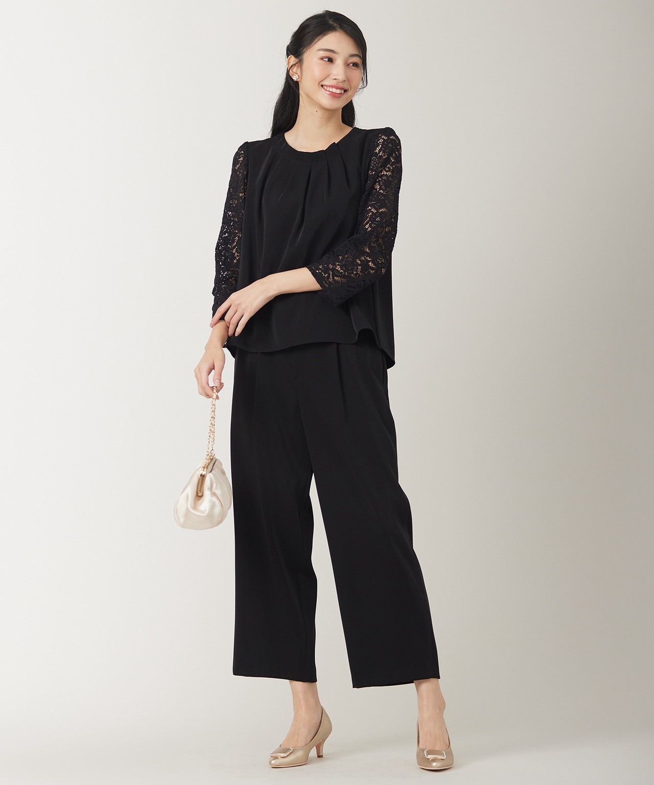光沢感のあるサテンのバッグやパンプスを合わせることで地味にならずバランスのとれた着こなしに仕上がります。