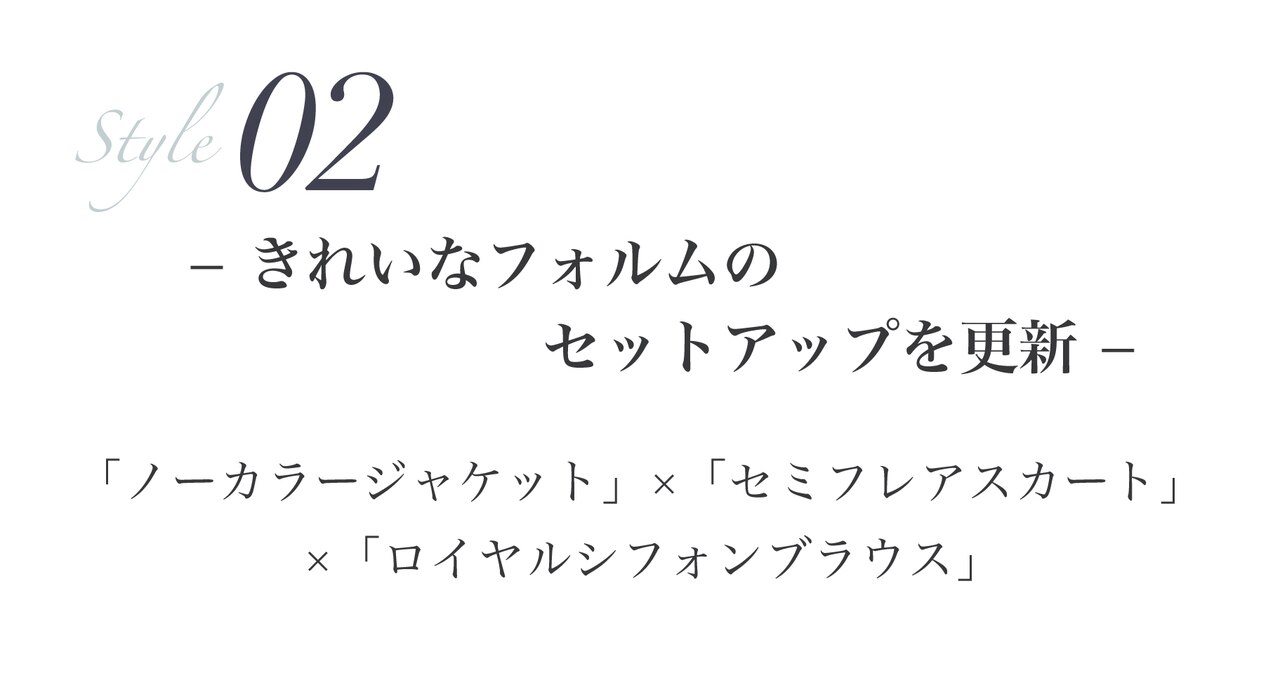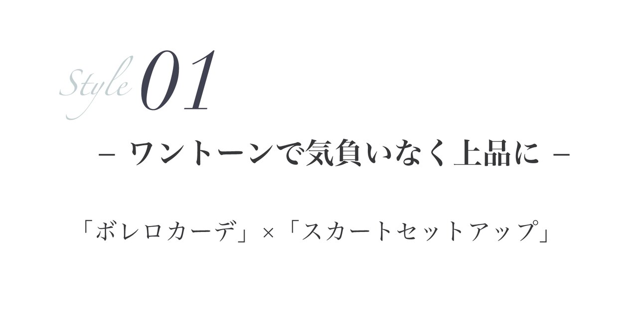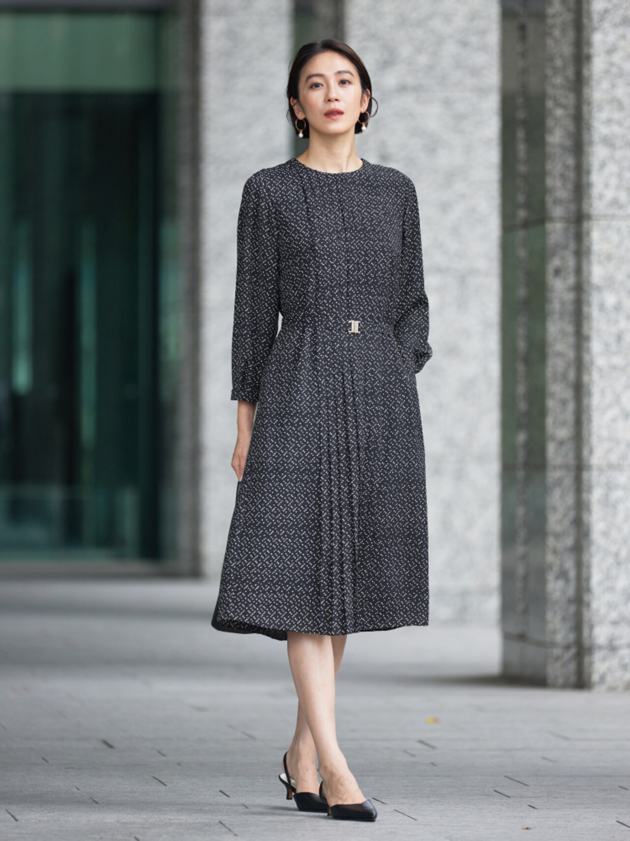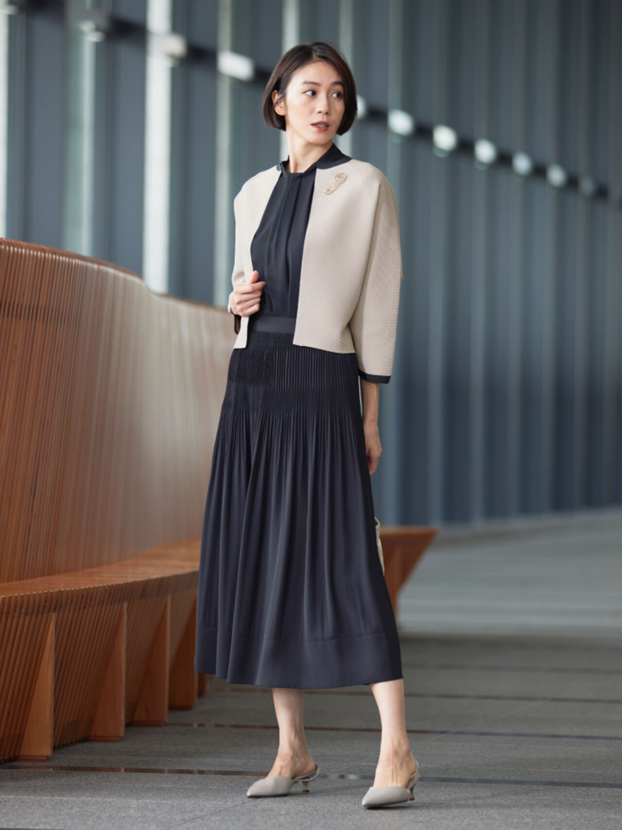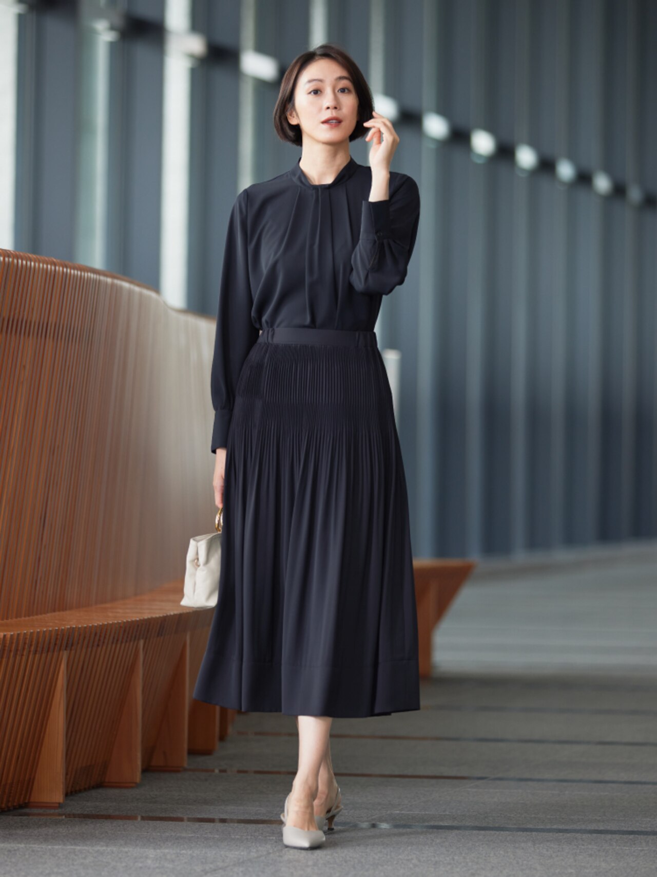 フロント部分がボウタイのようなデザインブラウスと同素材の繊細なプリーツが特徴のスカートをセットアップ着用し、きちんとワンピース見えに。ホールガーメントのニットジャケットを重ねて、今年らしくアップデート。