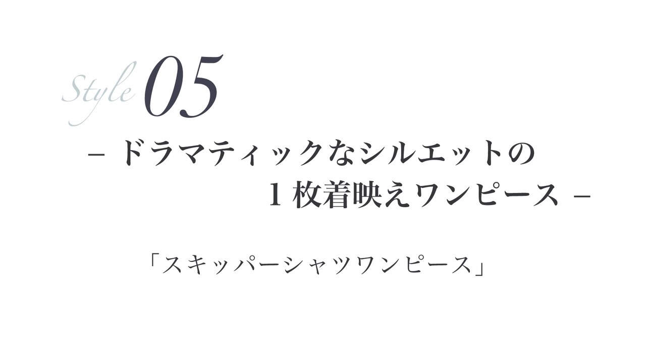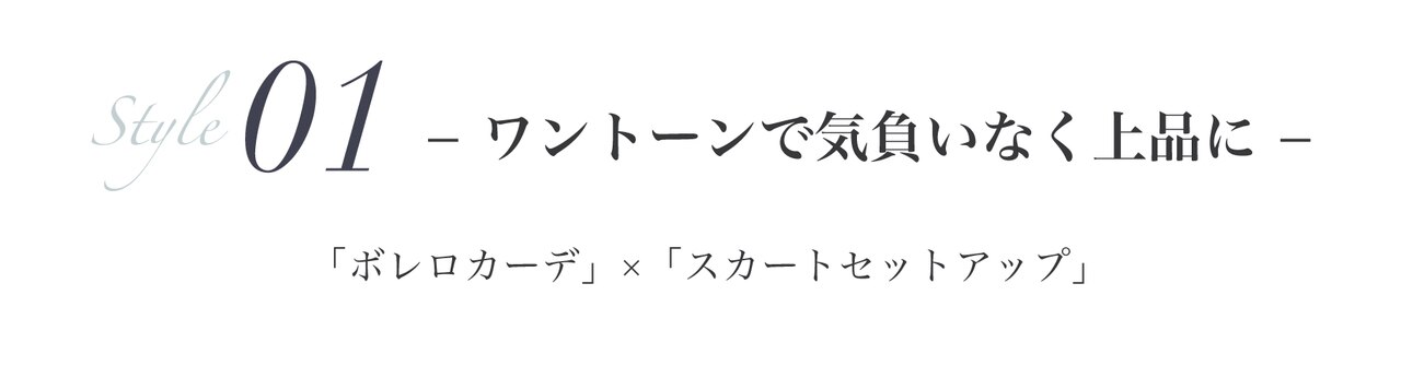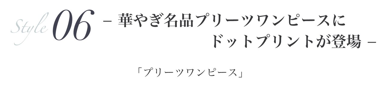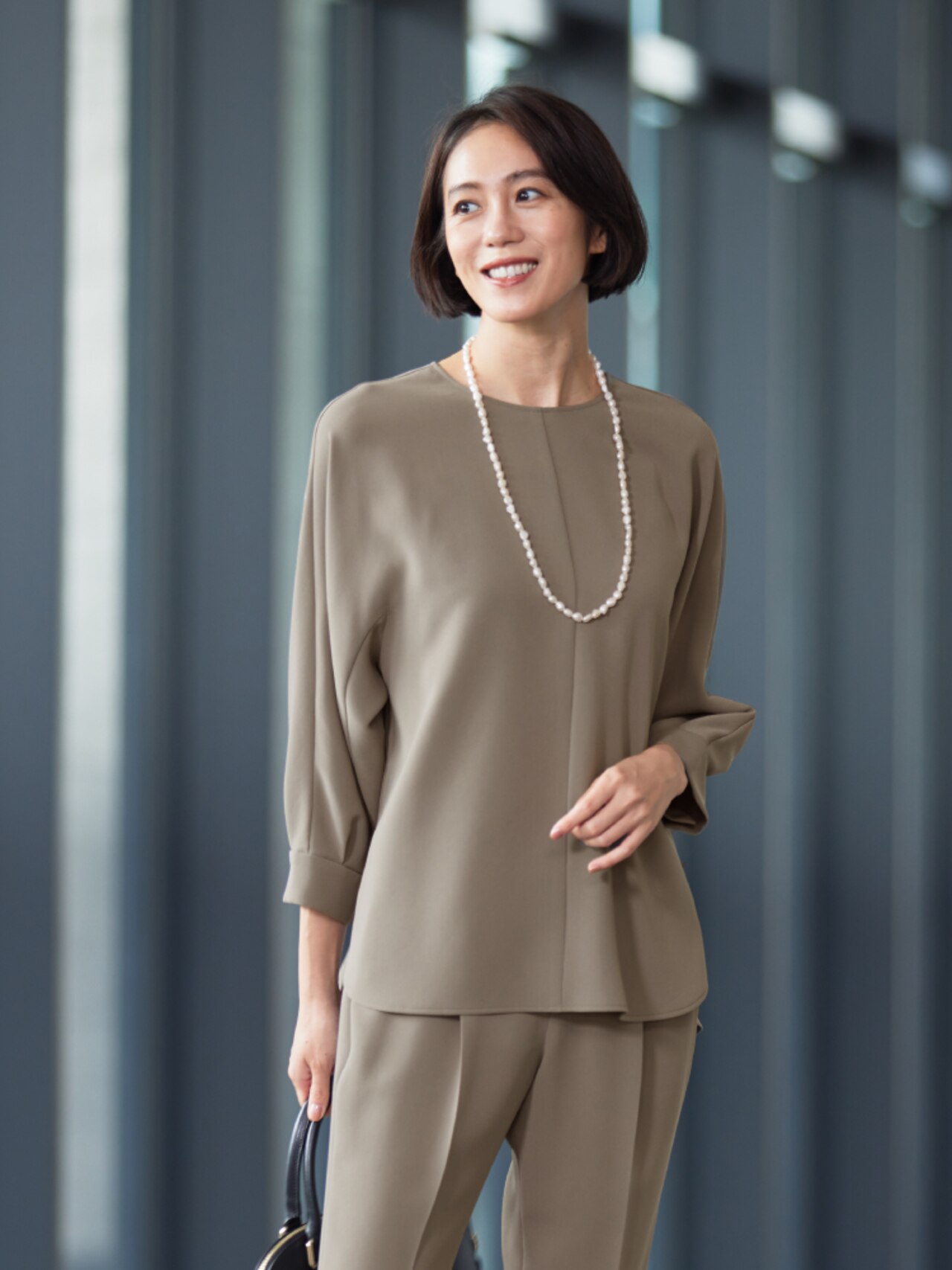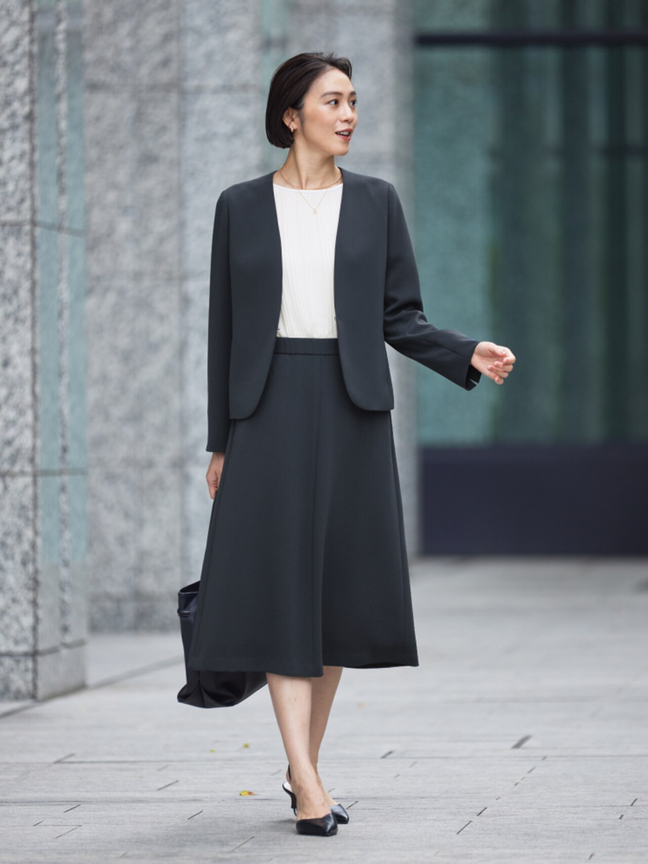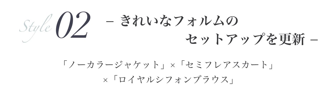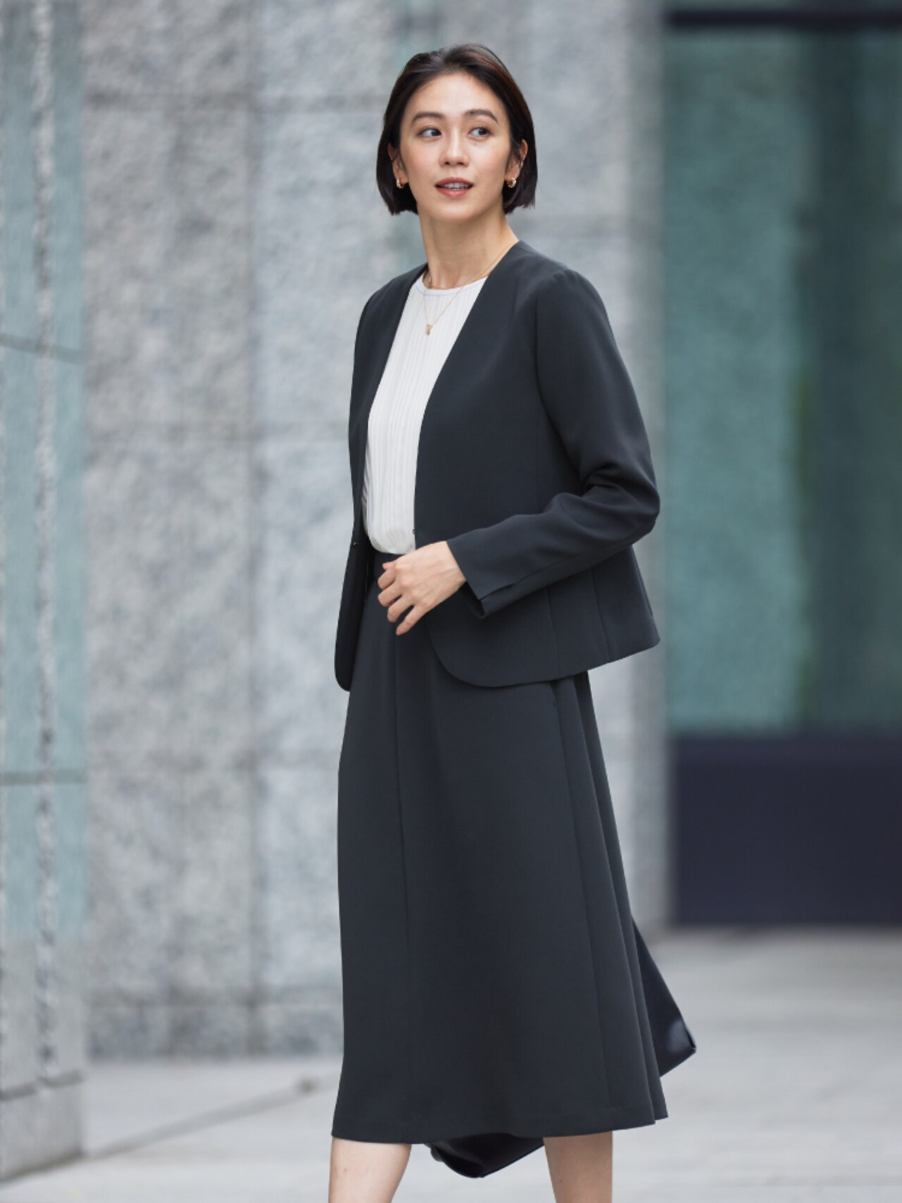 フロント部分がボウタイのようなデザインブラウスと同素材の繊細なプリーツが特徴のスカートをセットアップ着用し、きちんとワンピース見えに。ホールガーメントのニットジャケットを重ねて、今年らしくアップデート。