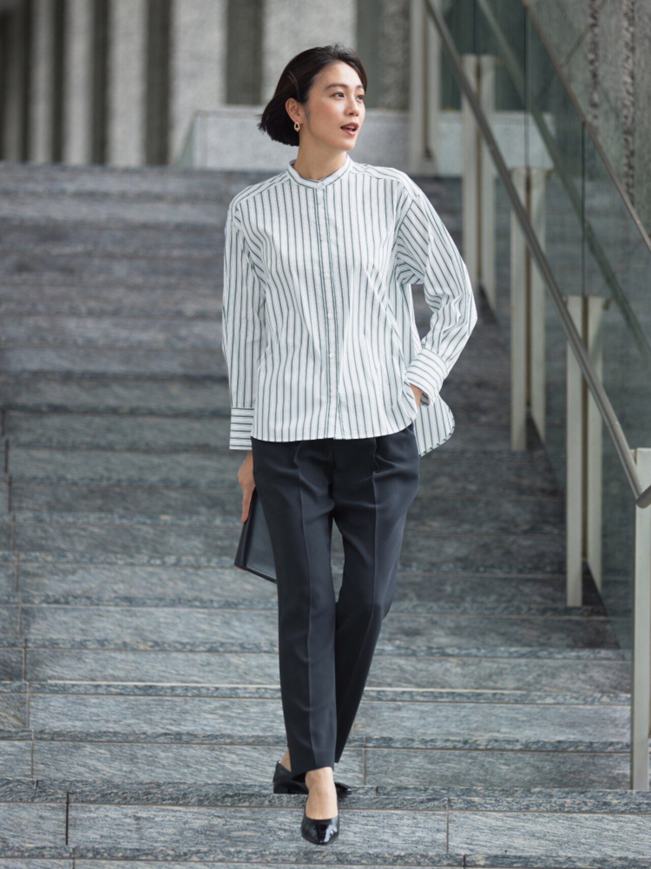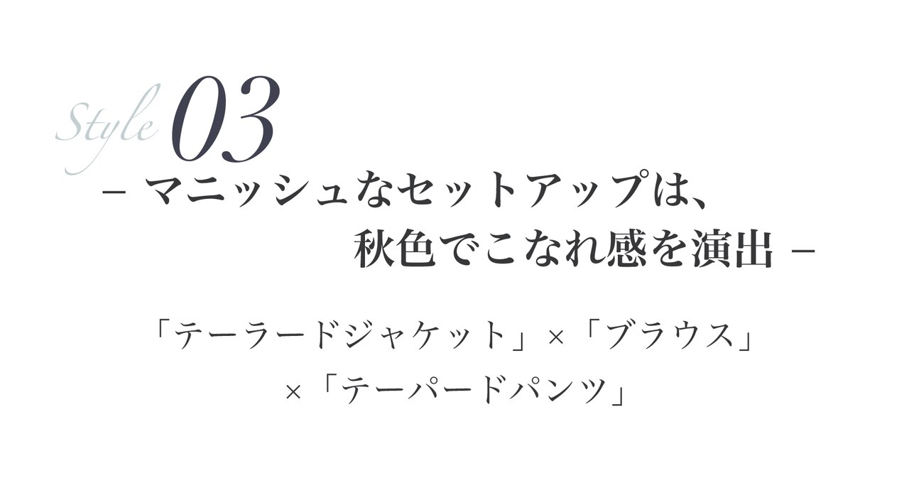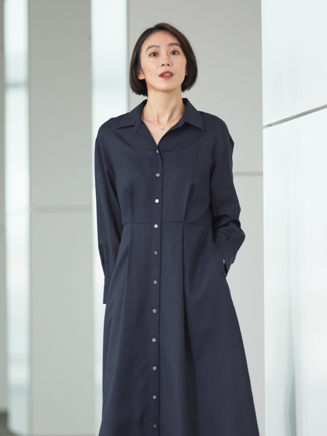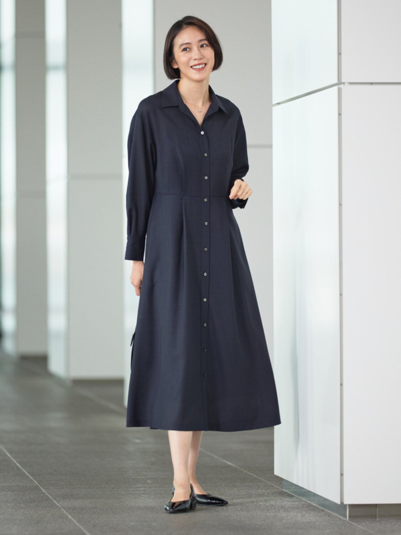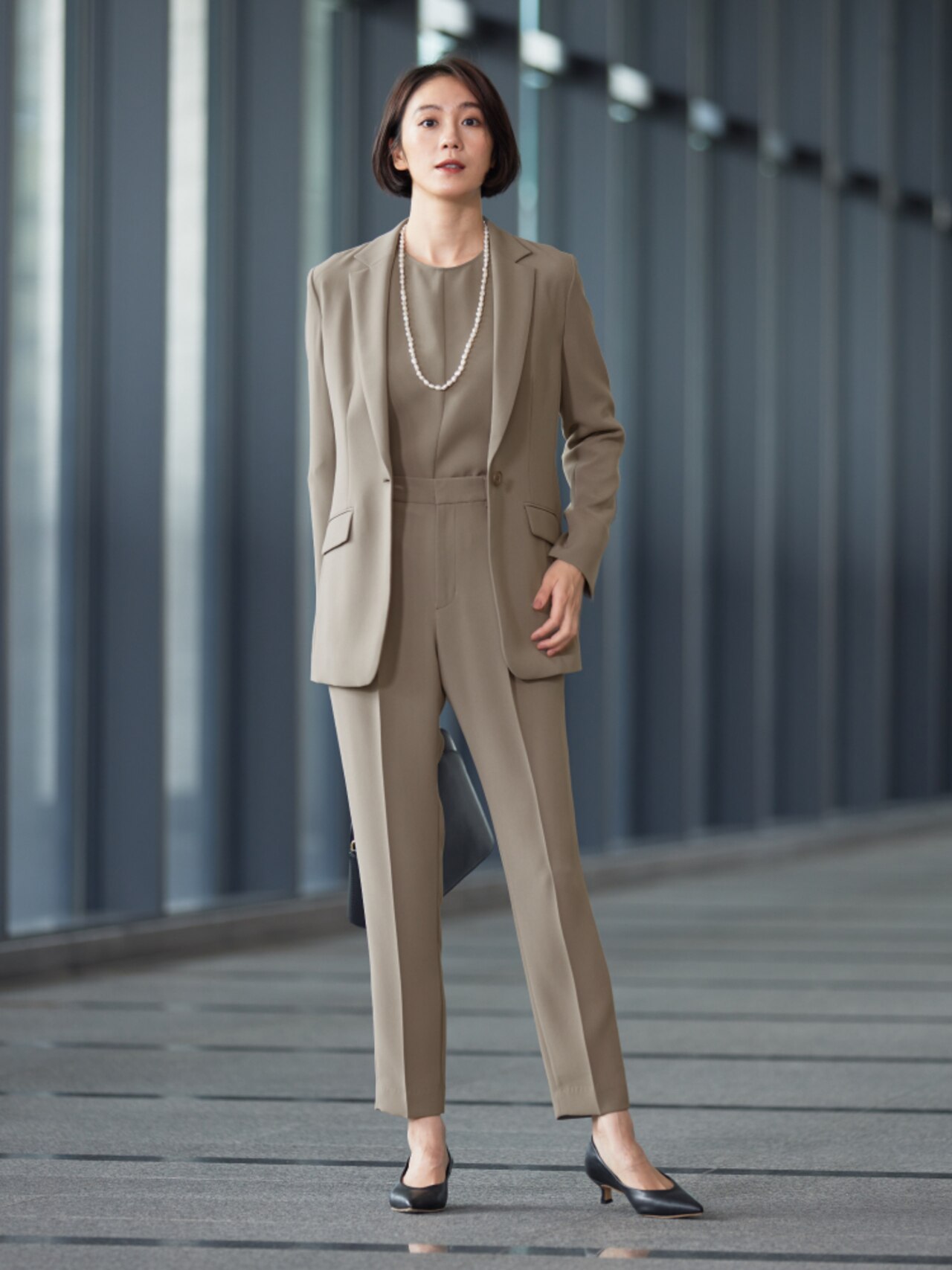 フロント部分がボウタイのようなデザインブラウスと同素材の繊細なプリーツが特徴のスカートをセットアップ着用し、きちんとワンピース見えに。ホールガーメントのニットジャケットを重ねて、今年らしくアップデート。