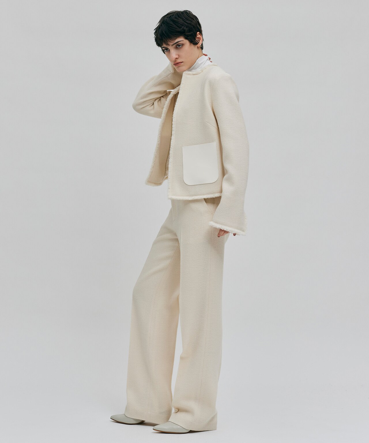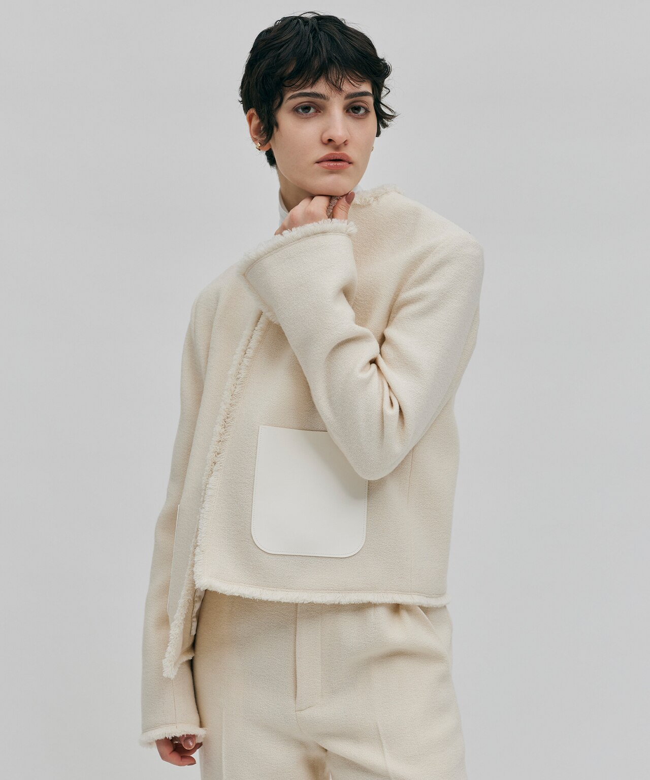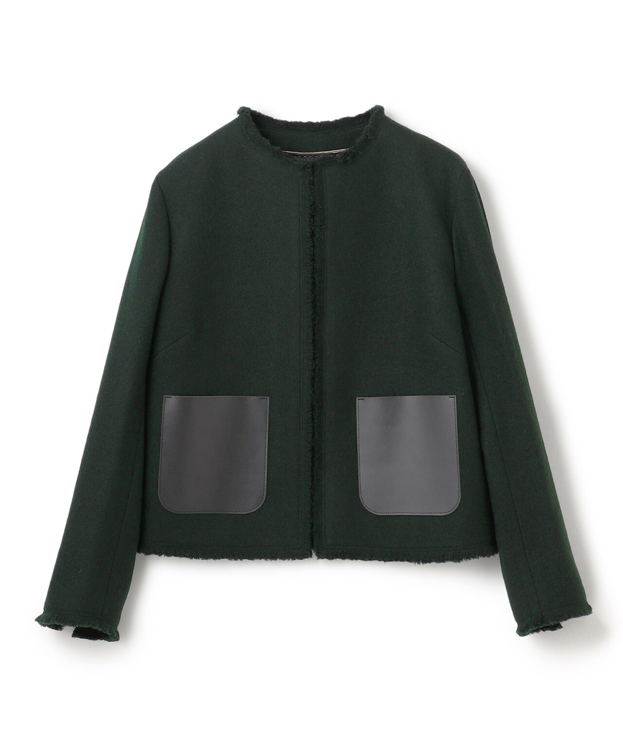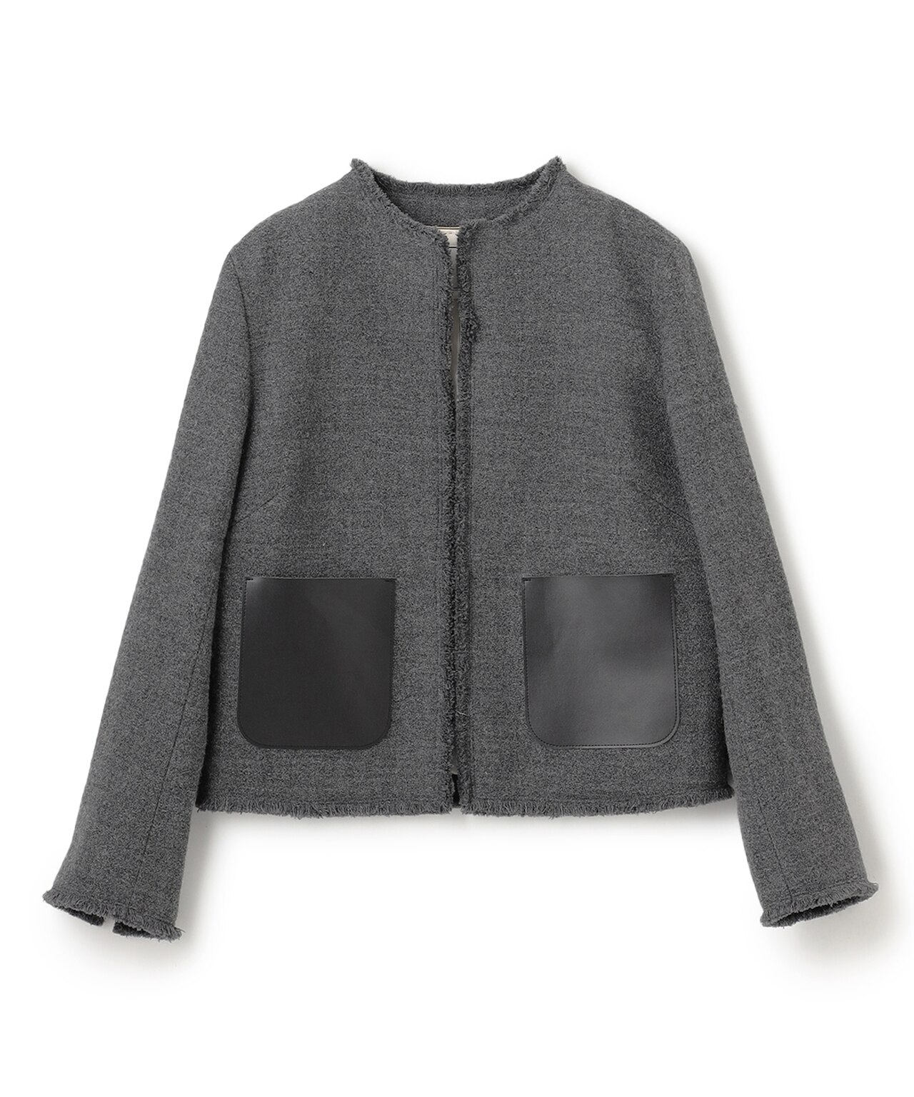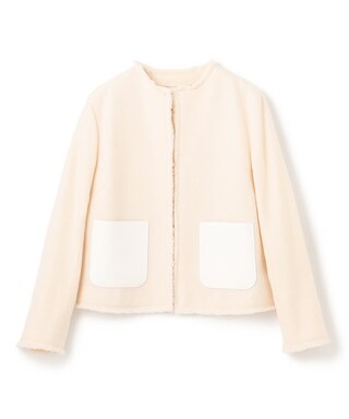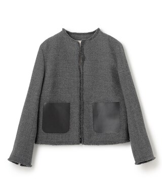 ツイードの柔らかさと、フェイクレザーのハードな組み合わせがモードなノーカラージャケット。をあしらったジャケット。カジュアルにデニムやワイドパンツに合わせたスタイリングや同素材のパンツとセットアップで、幅広く着こなせるジャケットです。