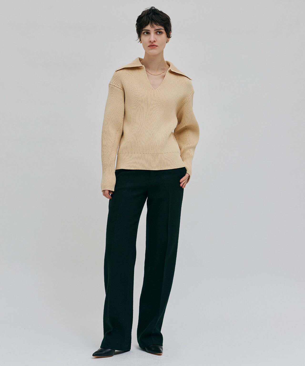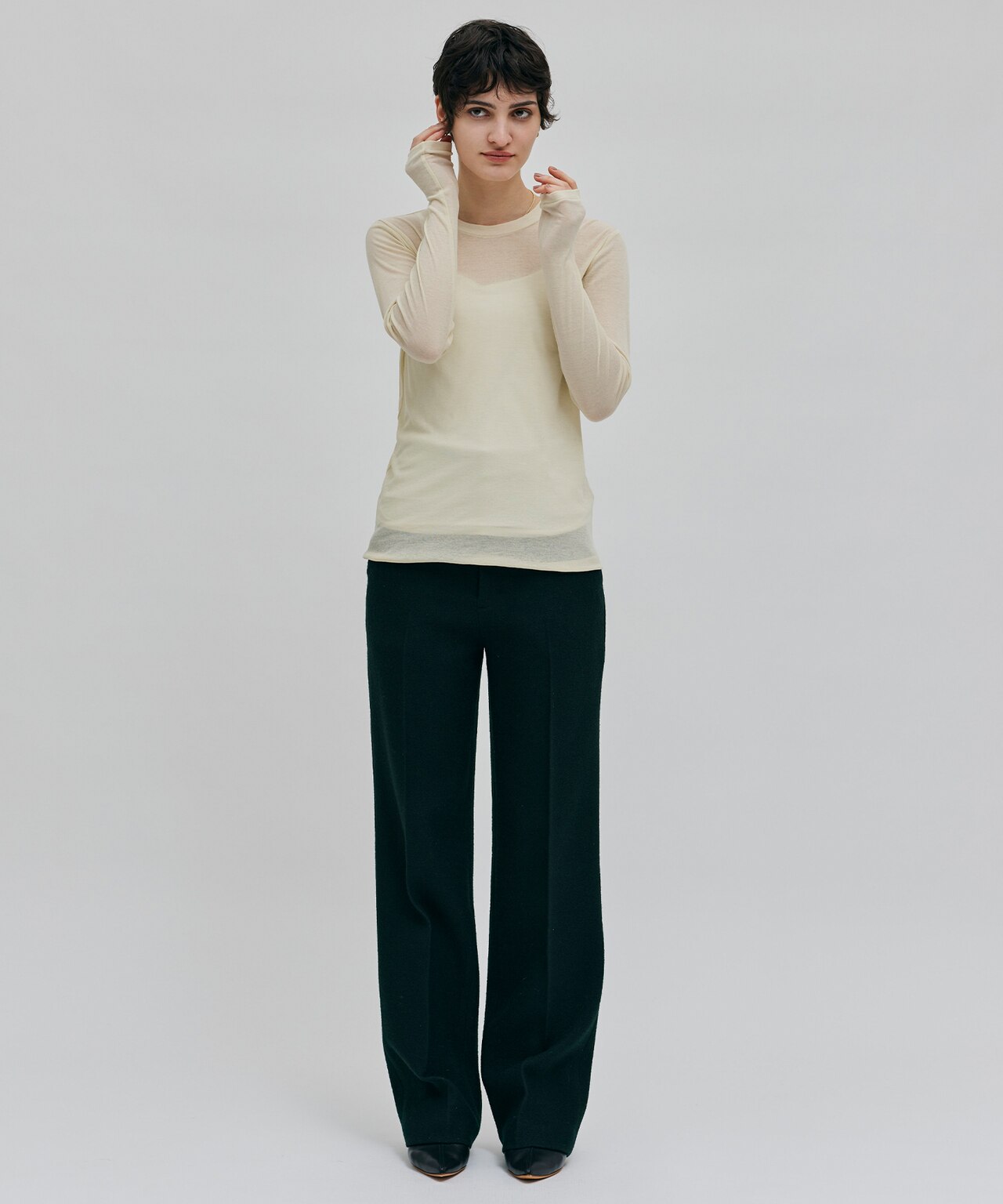 滑らかで上品なツヤ感が大人の女性を演出してくれるロングシャツを主役に、スタイリングのポイントになってくれるツイードの綺麗見えパンツを合わせました。シャツは下のボタンを少し開け、軽さを出し、一枚でも勿論、羽織やレイヤードアイテムとしても大活躍なロングシャツです。