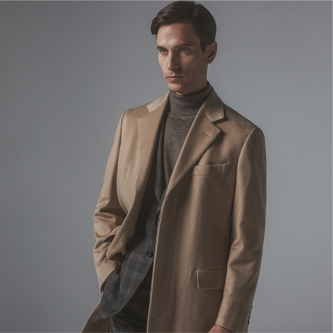 ヘビーウェイトツイードのタップリとしたオーバーコートはシンプルながらモードな雰囲気。