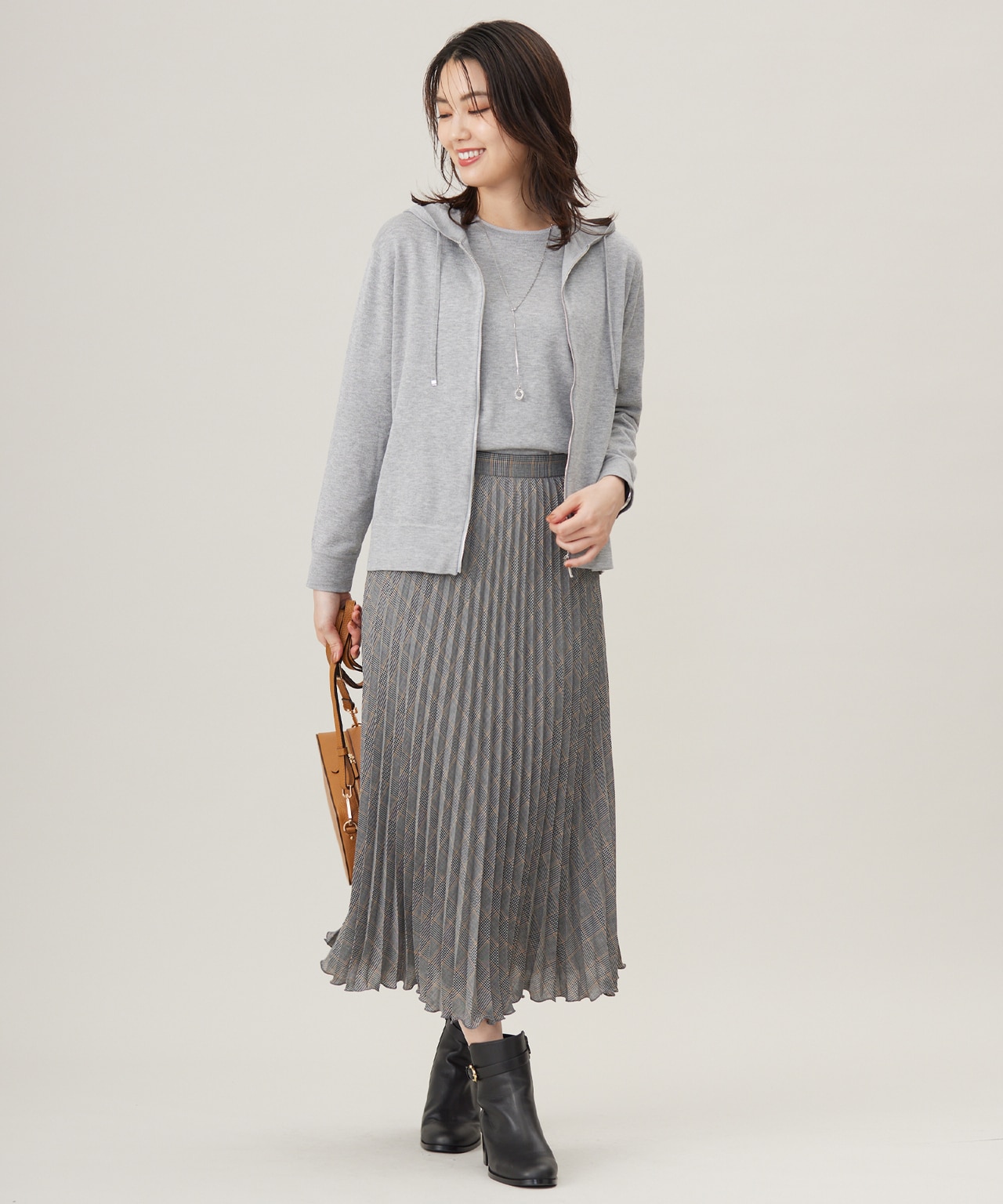 ラメの配色で顔まわりを明るく演出する、滑らかなドレープ感の薄手ニット