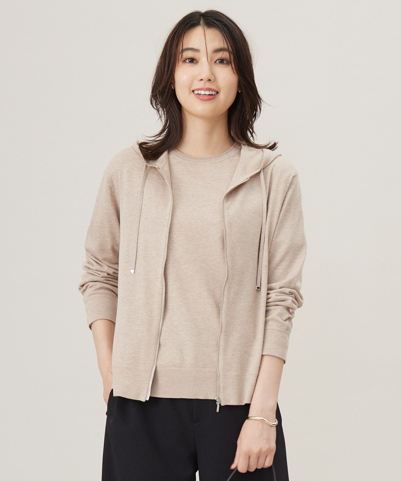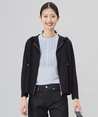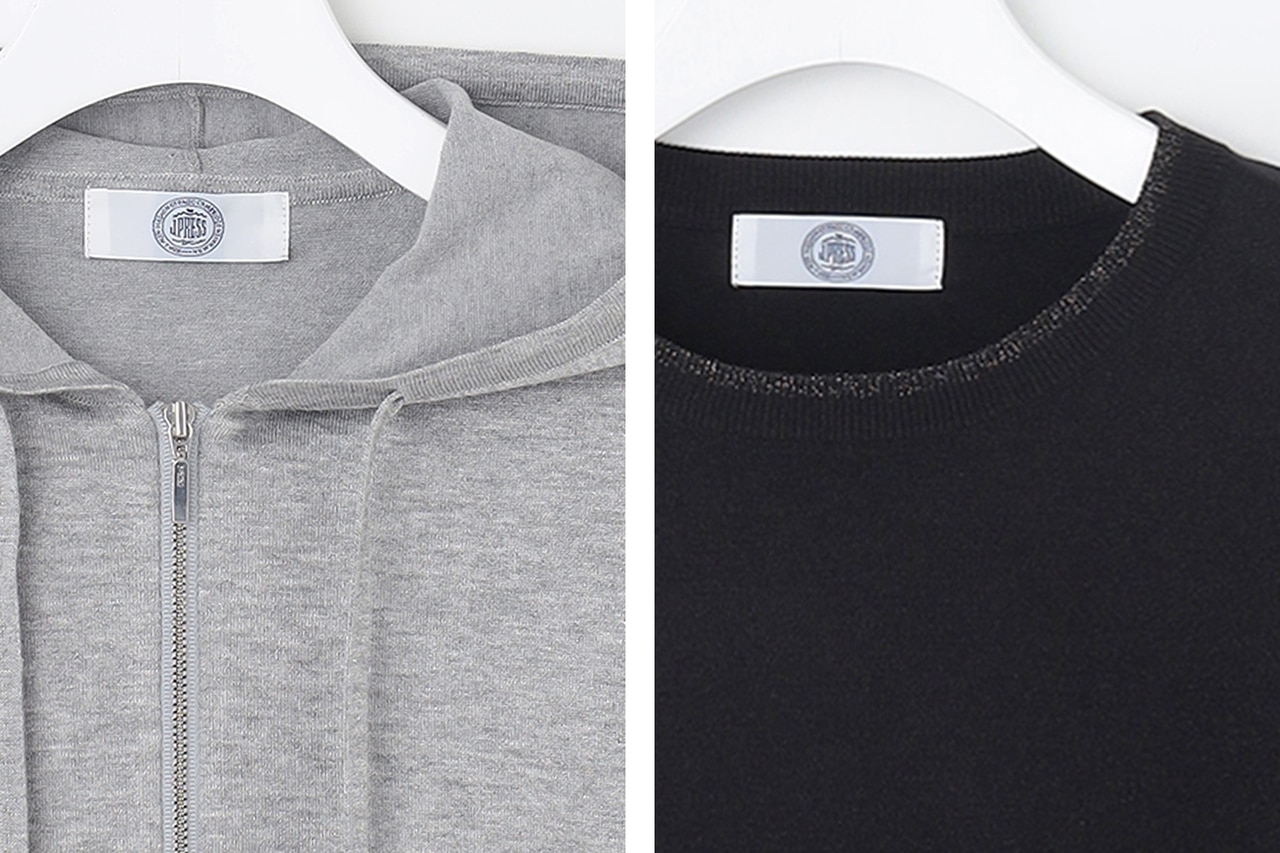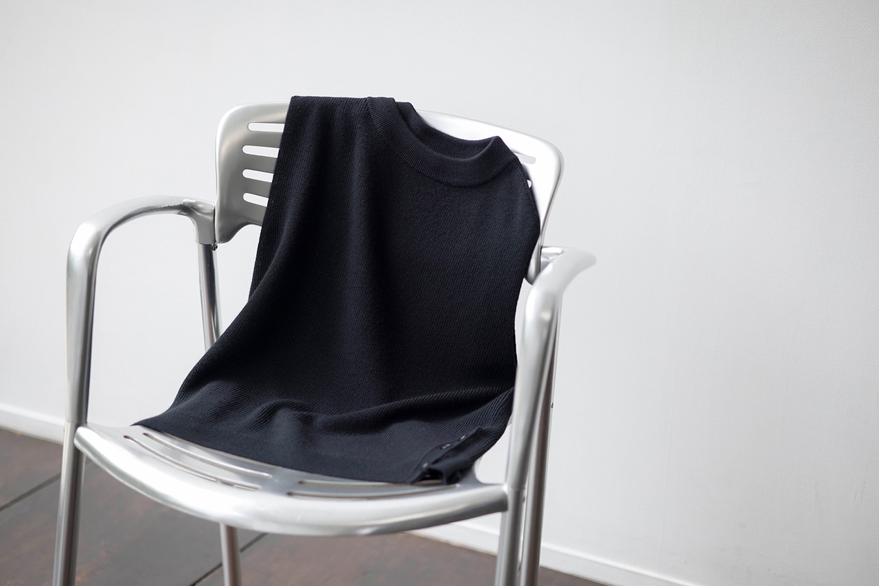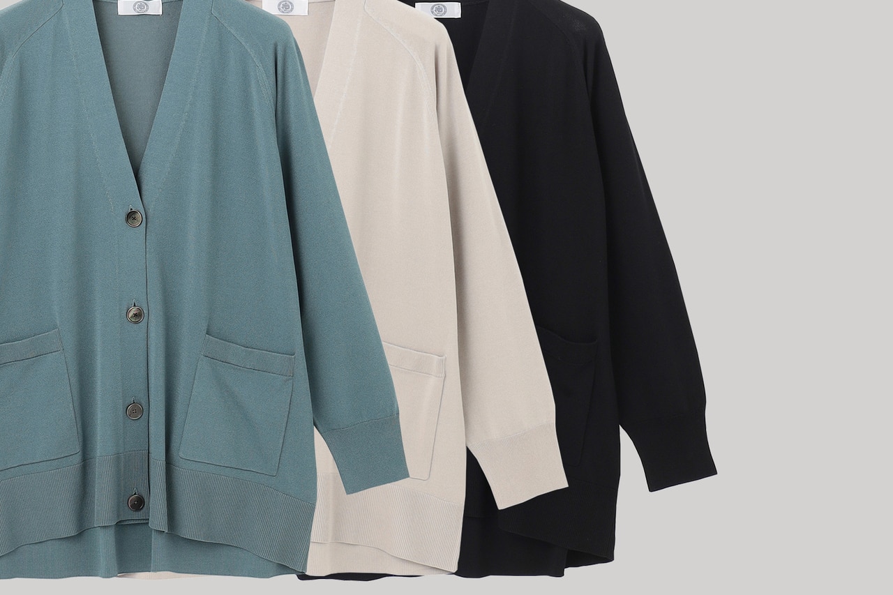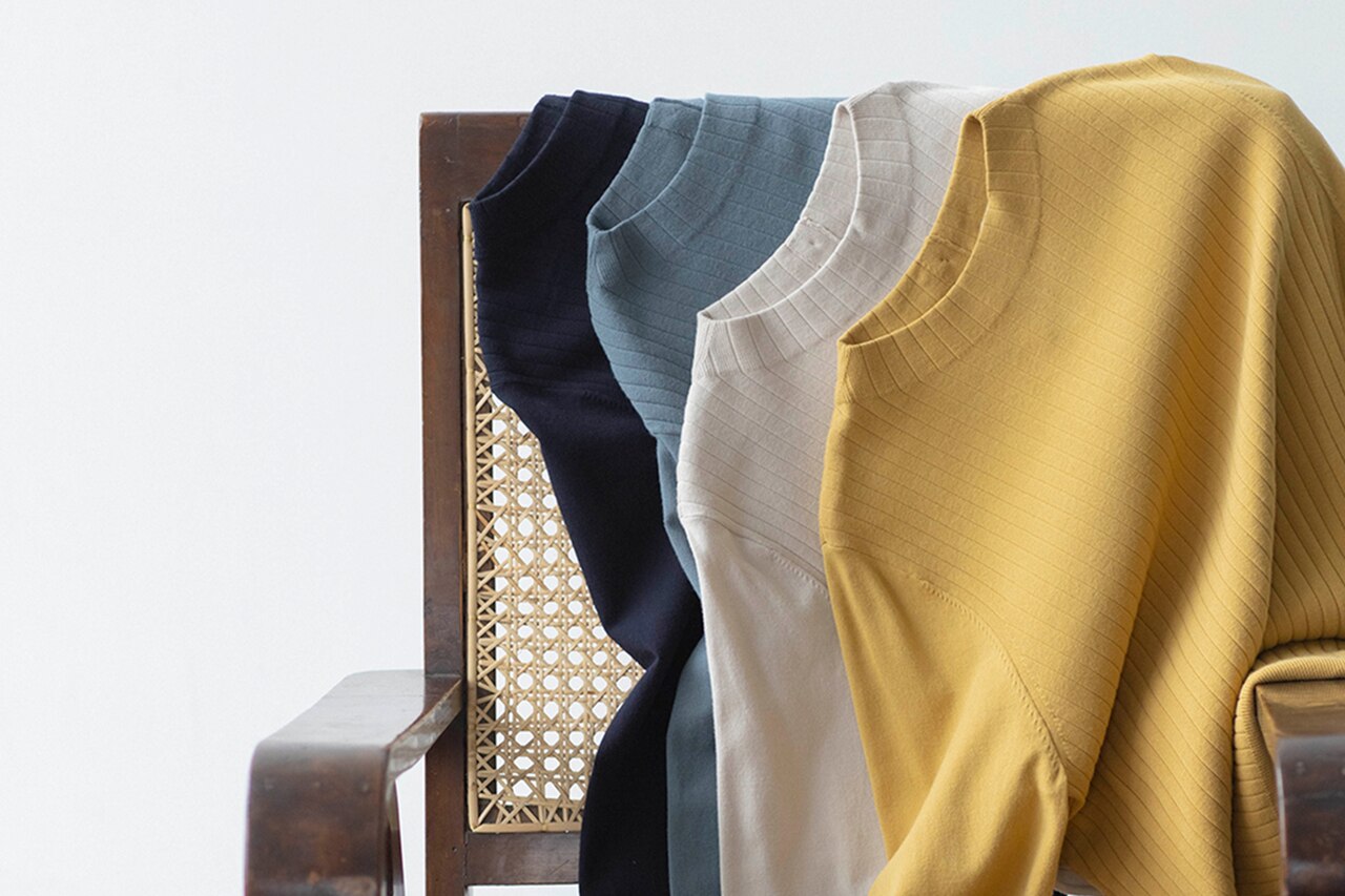 ストレッチ糸を芯に、ソフトでコシのある超極細のビスコース糸を巻く特別な撚糸方法の素材で、軽くてきれいに目の詰まった表面が特徴のニットシリーズ。ハイツイストを効かせつつ、滑らかな肌触りで伸縮機能性もあり、シーズンレスな風合いです。