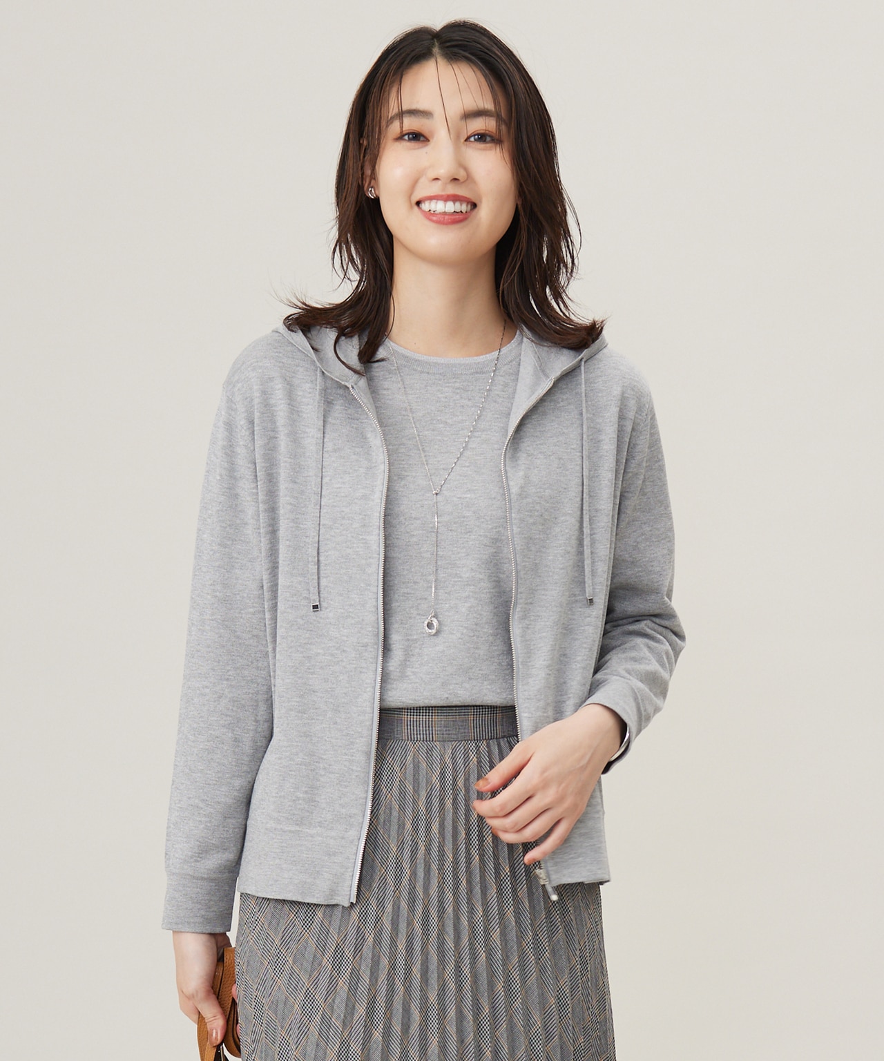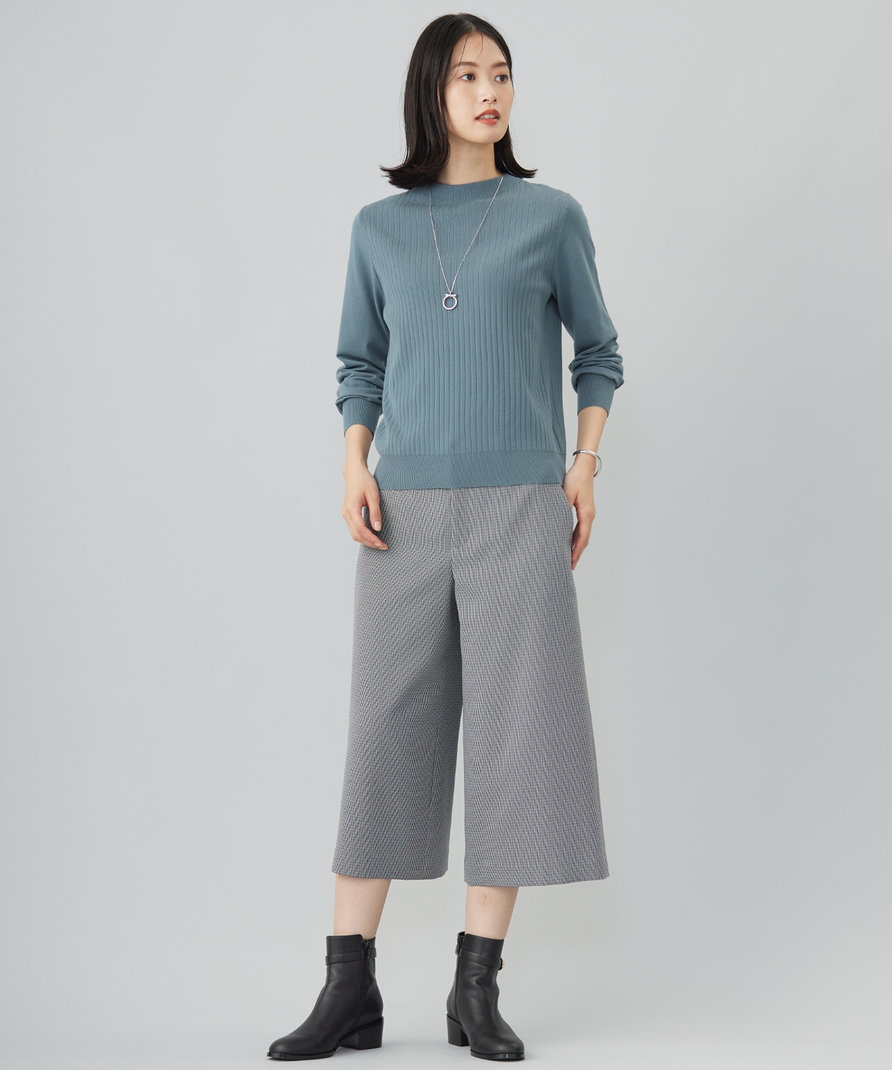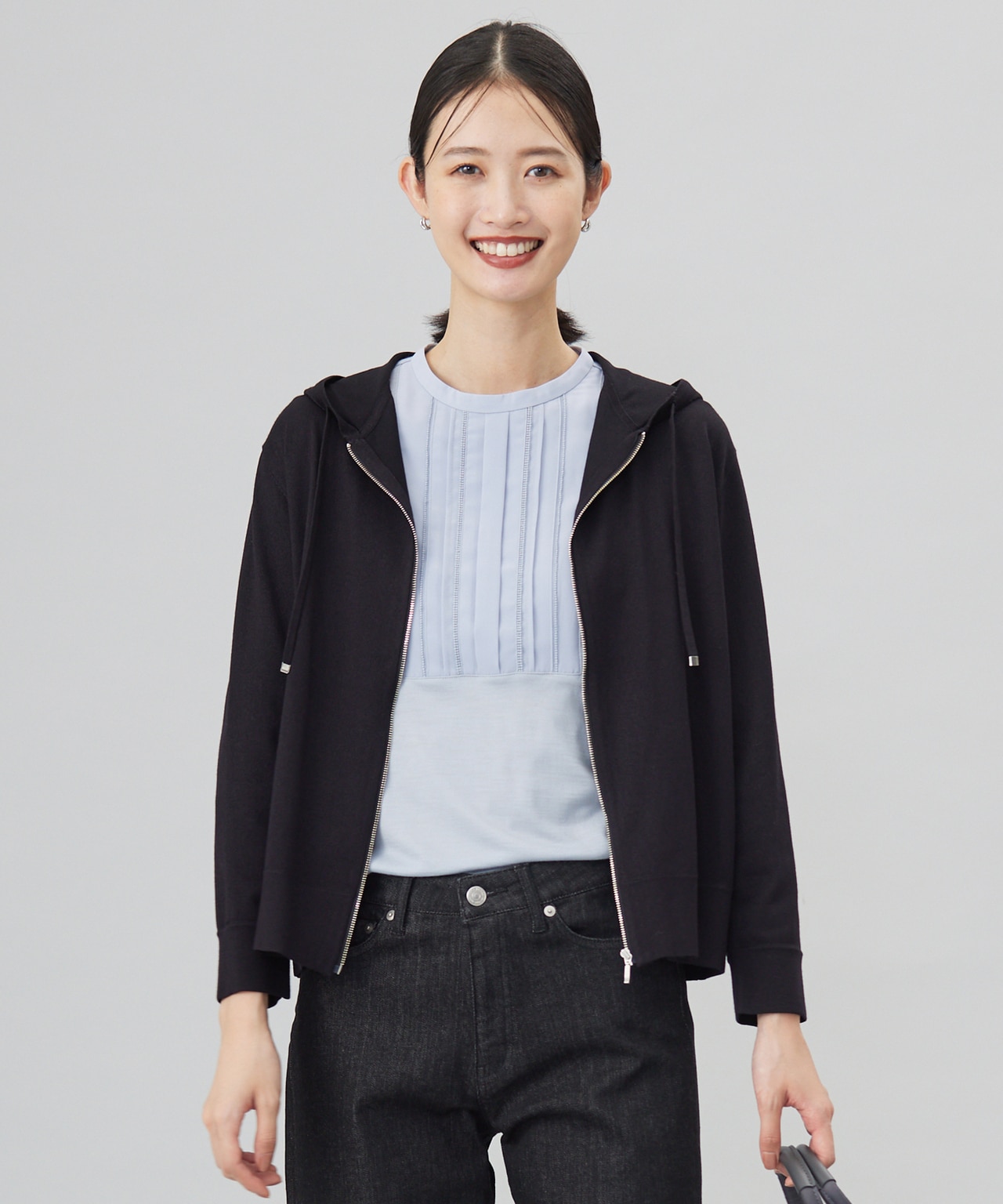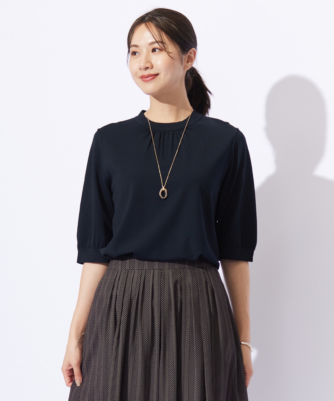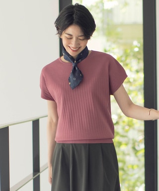 秋を感じさせる艶感に加え、残暑に嬉しい清涼感もあり、ボディラインに貼り付くことなくシーズンレスに使える素材感のシリーズ。強撚レーヨンナイロン素材にナチュラルなシルクを撚糸することにより、ワンランク上の光沢感を表現しました。交撚糸をベースに、肌にあたる裏面には爽やかな綿をプレーティングすることで着心地も追求しています。