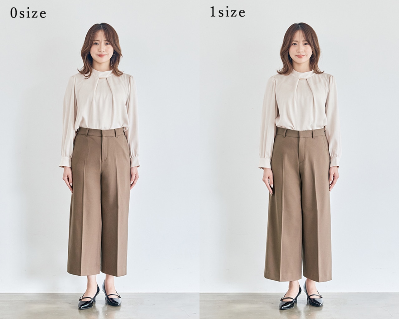 ワイドパンツを小柄さんが穿きこなすには、足首をみせてすっきり着こなすのがおすすめ!クロップド丈で着用できる0サイズがバランスのよい着こなしが叶います♪