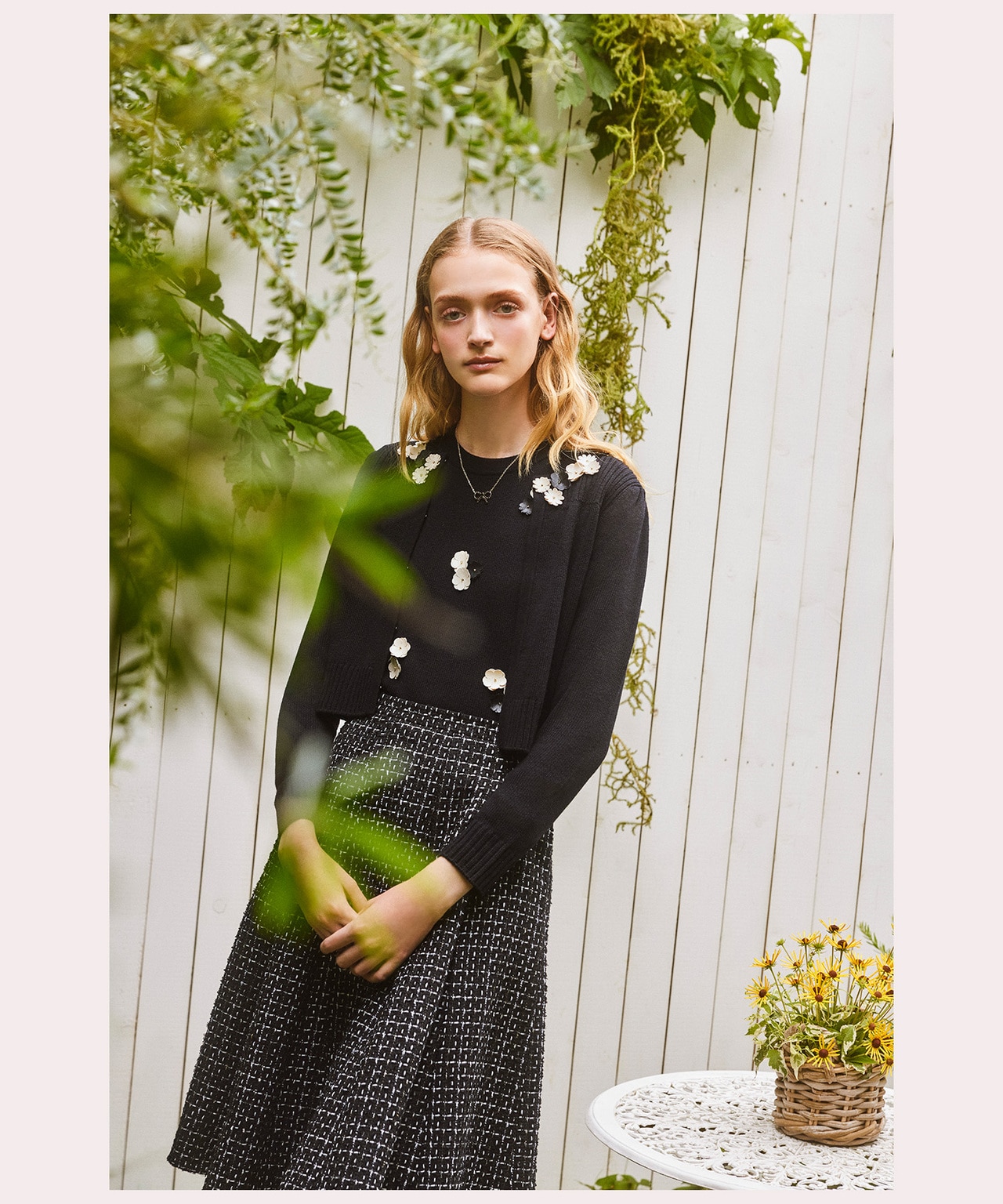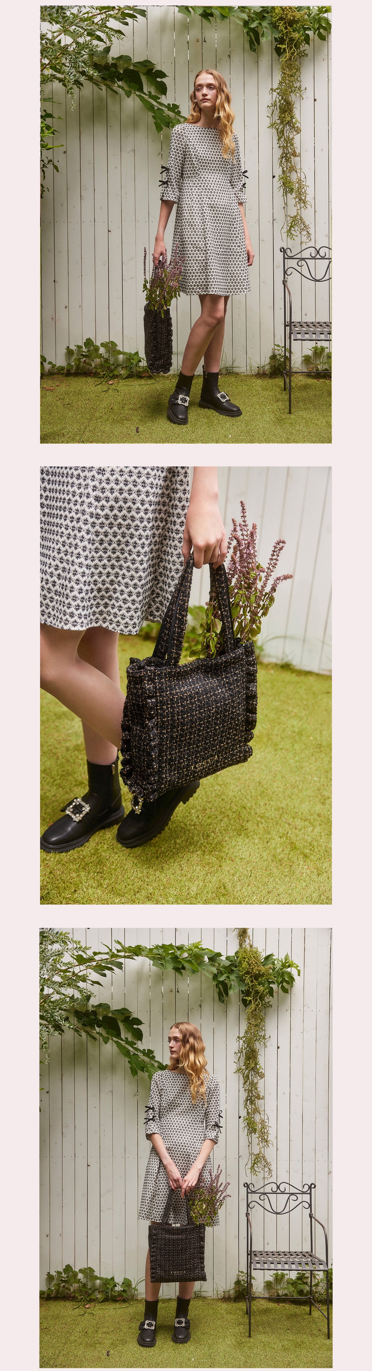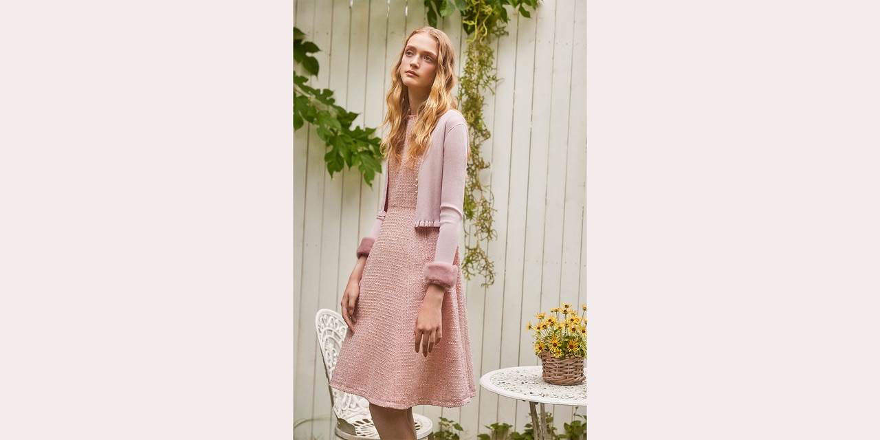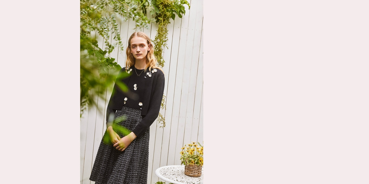 ラメ感のあるツイードが秋の光を受けてきらめき、お花のニットと合わせて優しい印象をプラスします。