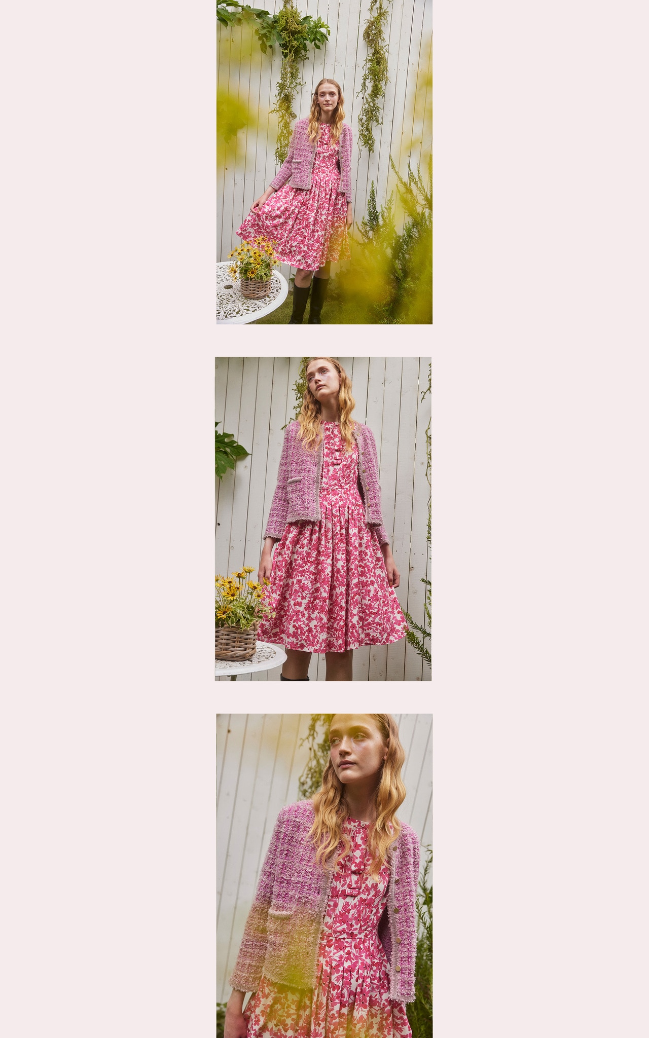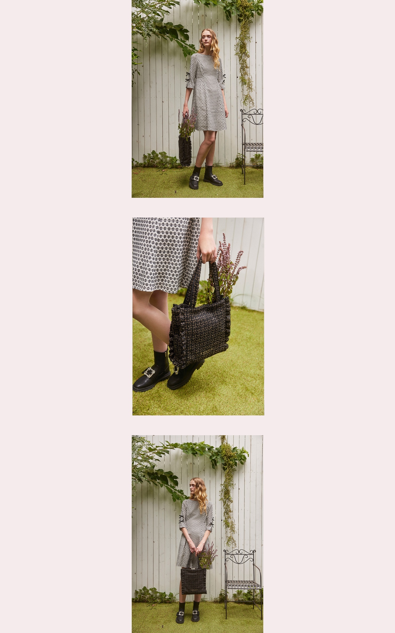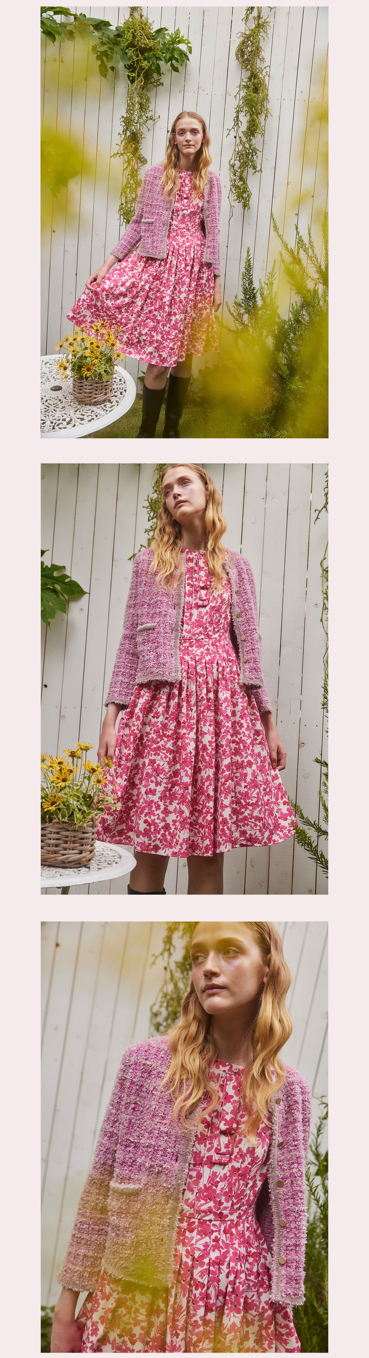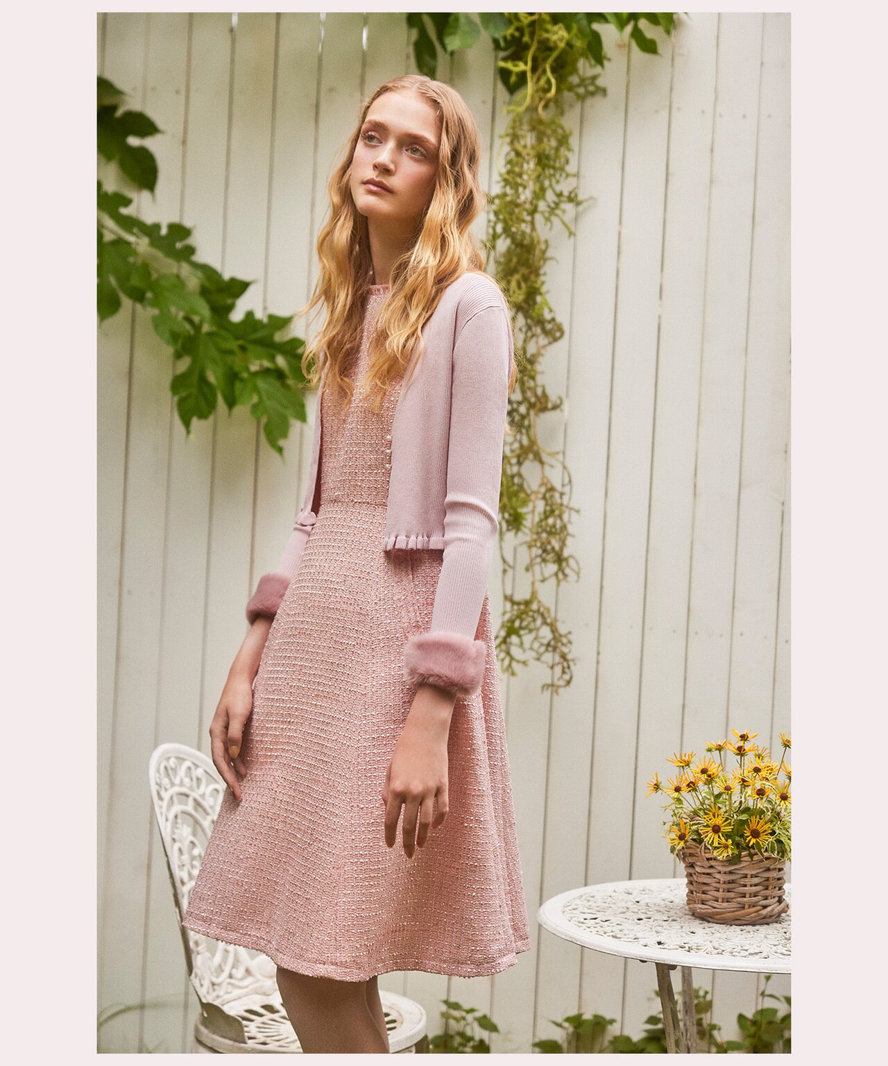 ラメ感のあるツイードが秋の光を受けてきらめき、お花のニットと合わせて優しい印象をプラスします。