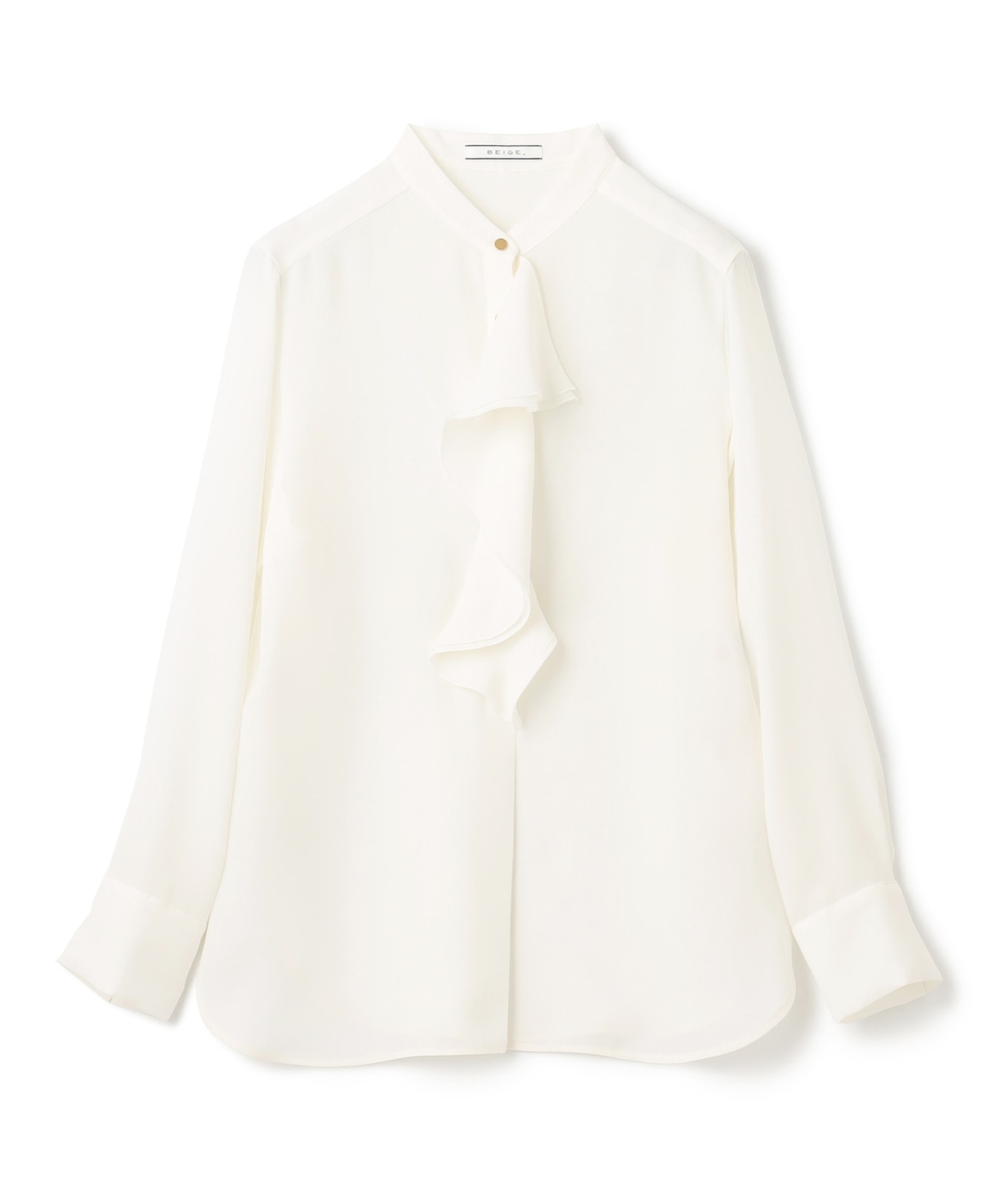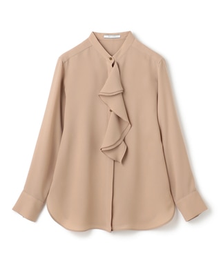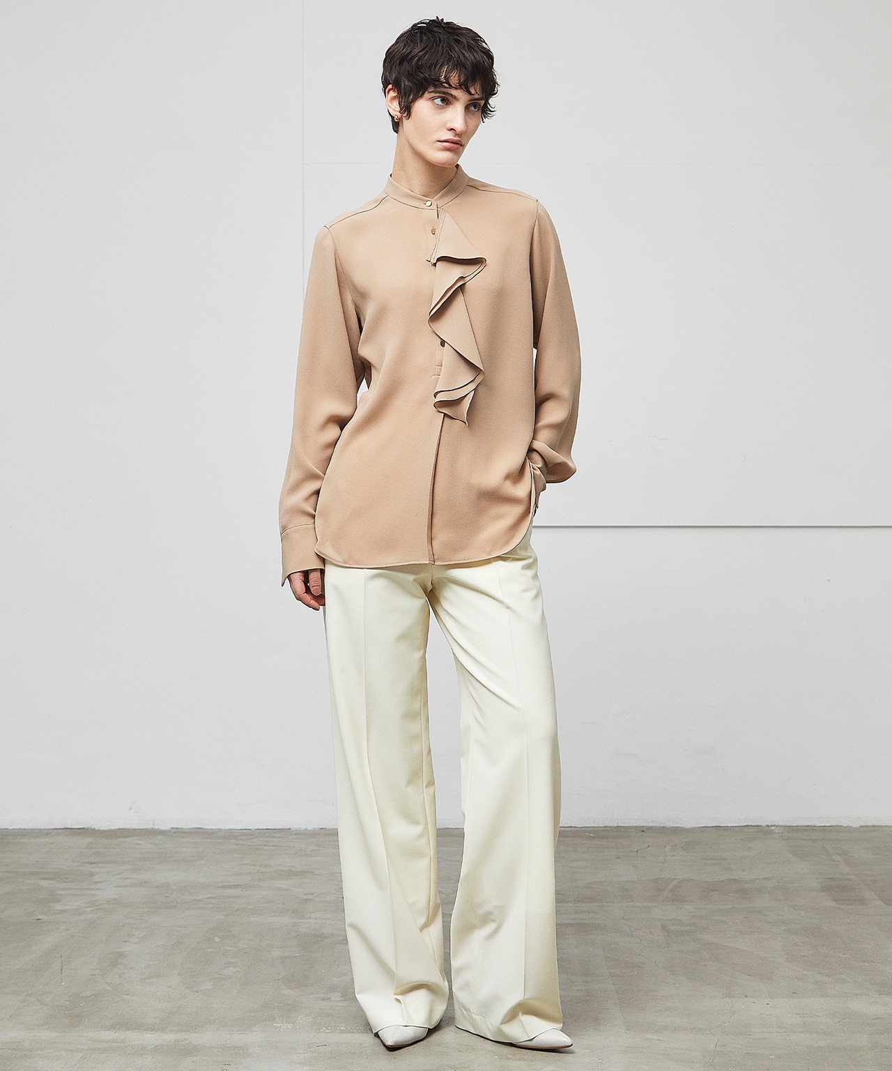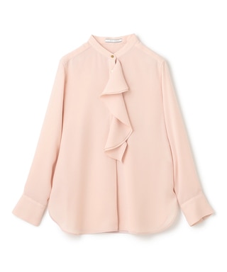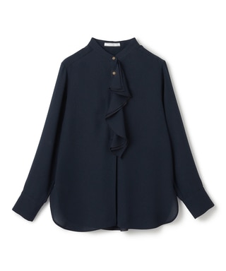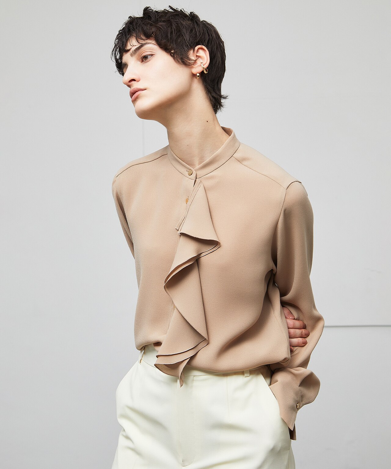 太めの二重フリルが華やかで、インした時にもフリルがウエストにかからず存在感がありつつもすっきりとした見え感。シャツのようなマニッシュさとゴールドボタンがスタイリングを引き締め、とろみ感のあるさらりとした人気素材で幅広いシーンで着られるブラウス。