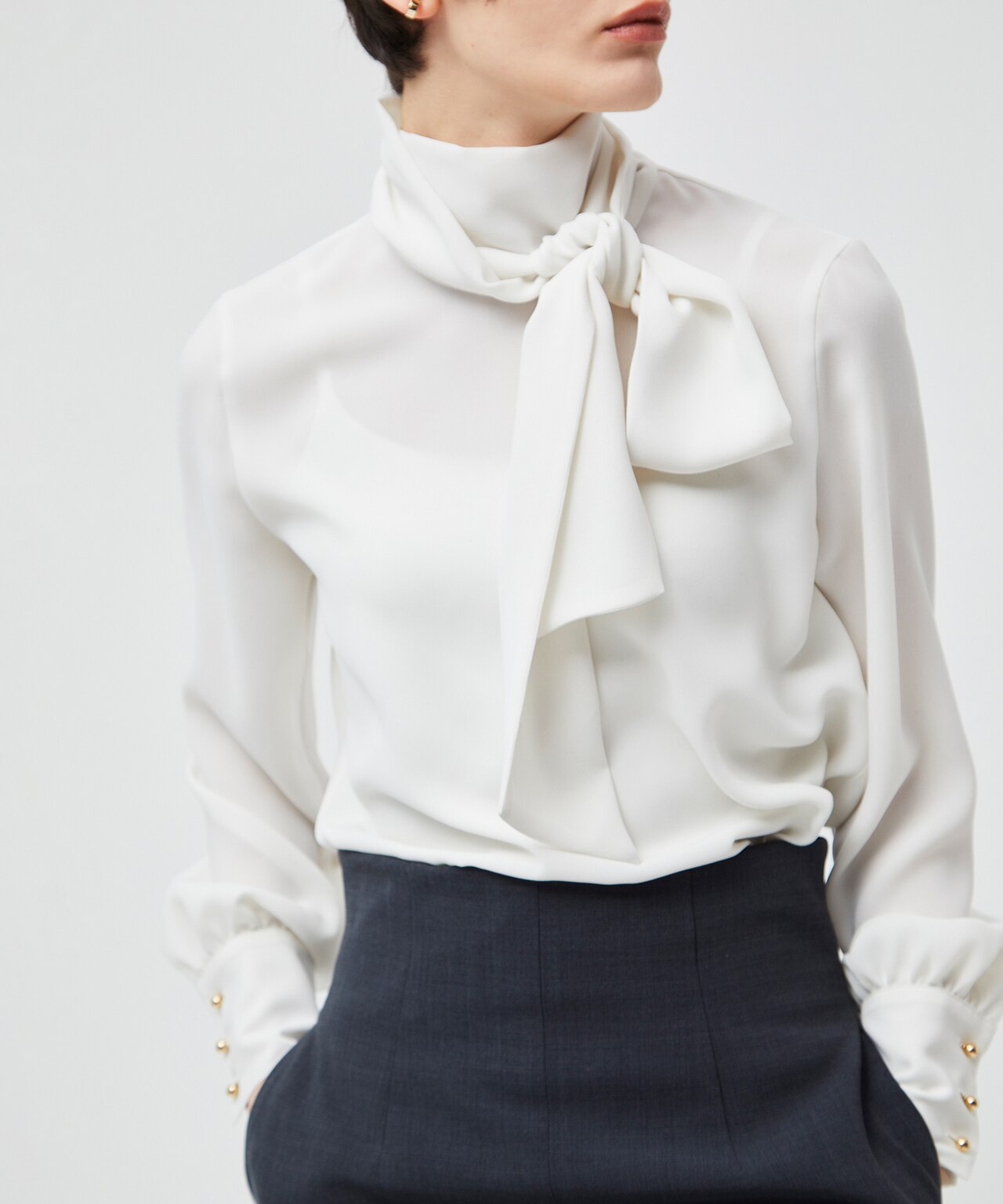 昨年よりご好評のボウタイがWEB限定で登場。すっきりとした身頃に、ボリュームのあるパフスリーブとボウタイが着るだけで華やかさをプラスし、フォーマルからカジュアルまで幅広い着こなしを楽しめるブラウス。