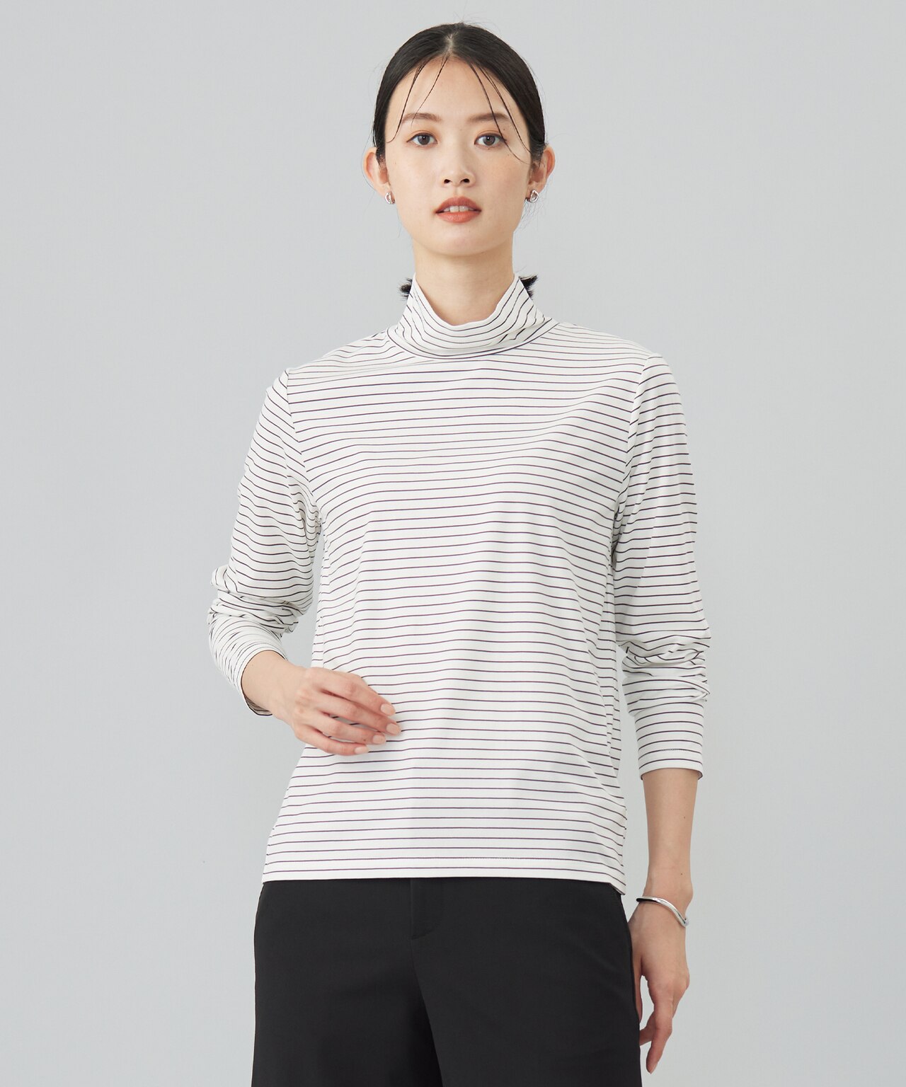 ボーダーで着映えする、ストレスフリーな着心地のタートルネックカットソー。ほどよく伸縮性のある素材で、柔らかく滑らかな着心地の良さがポイント。シンプルで上品なボーダーは他アイテムとも合わせやすく、コーディネートに洒落感をプラスします。